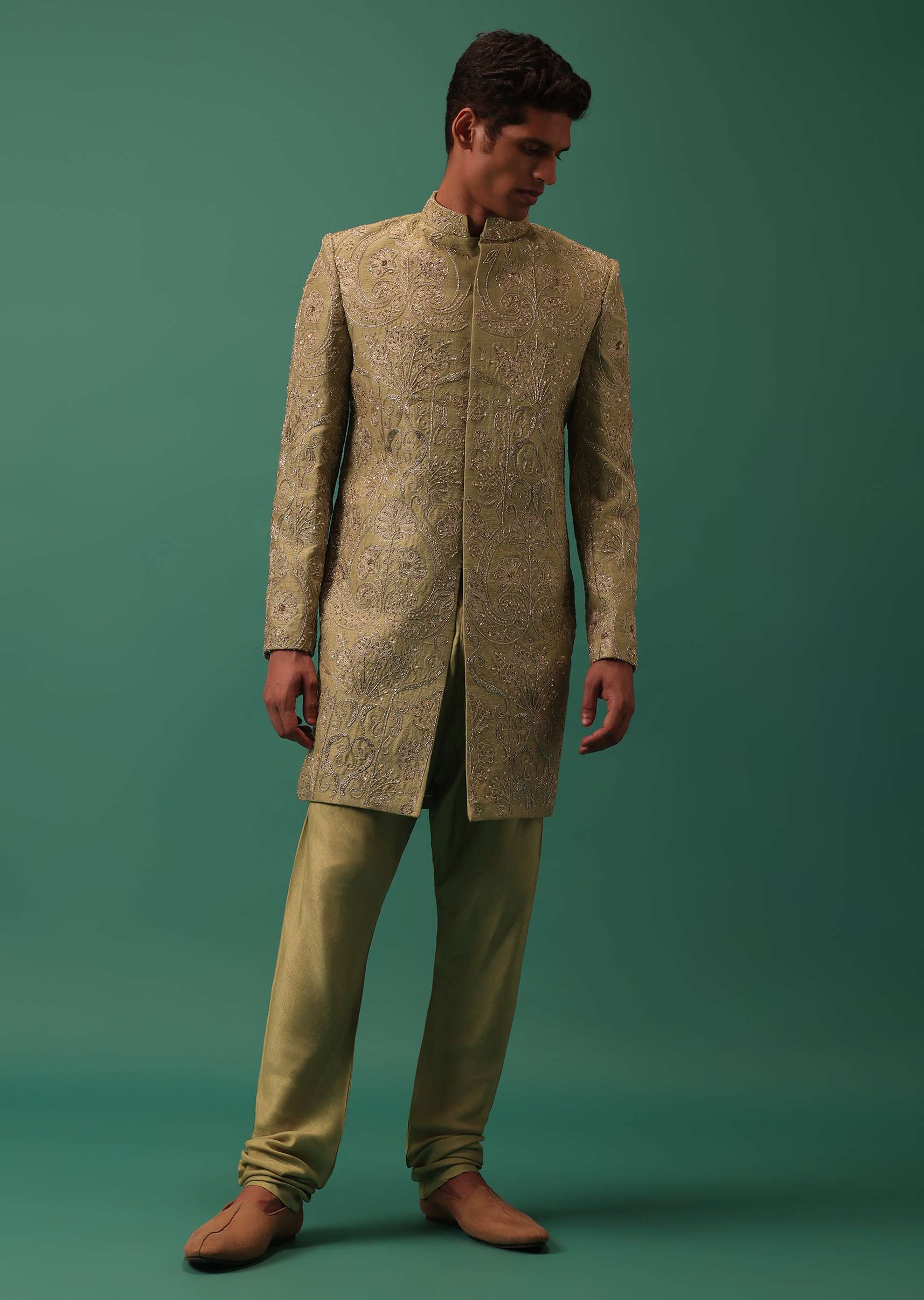 - Introducing our captivating green Indo-sherwani set in raw silk, a perfect blend of regal charm and traditional finesse.