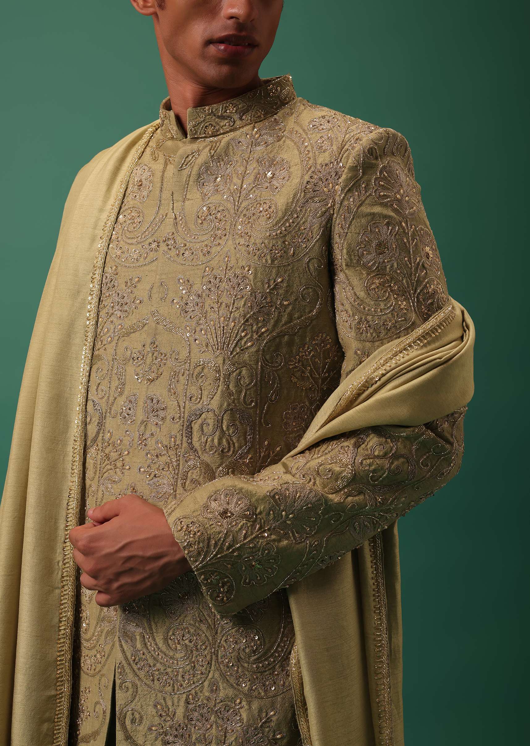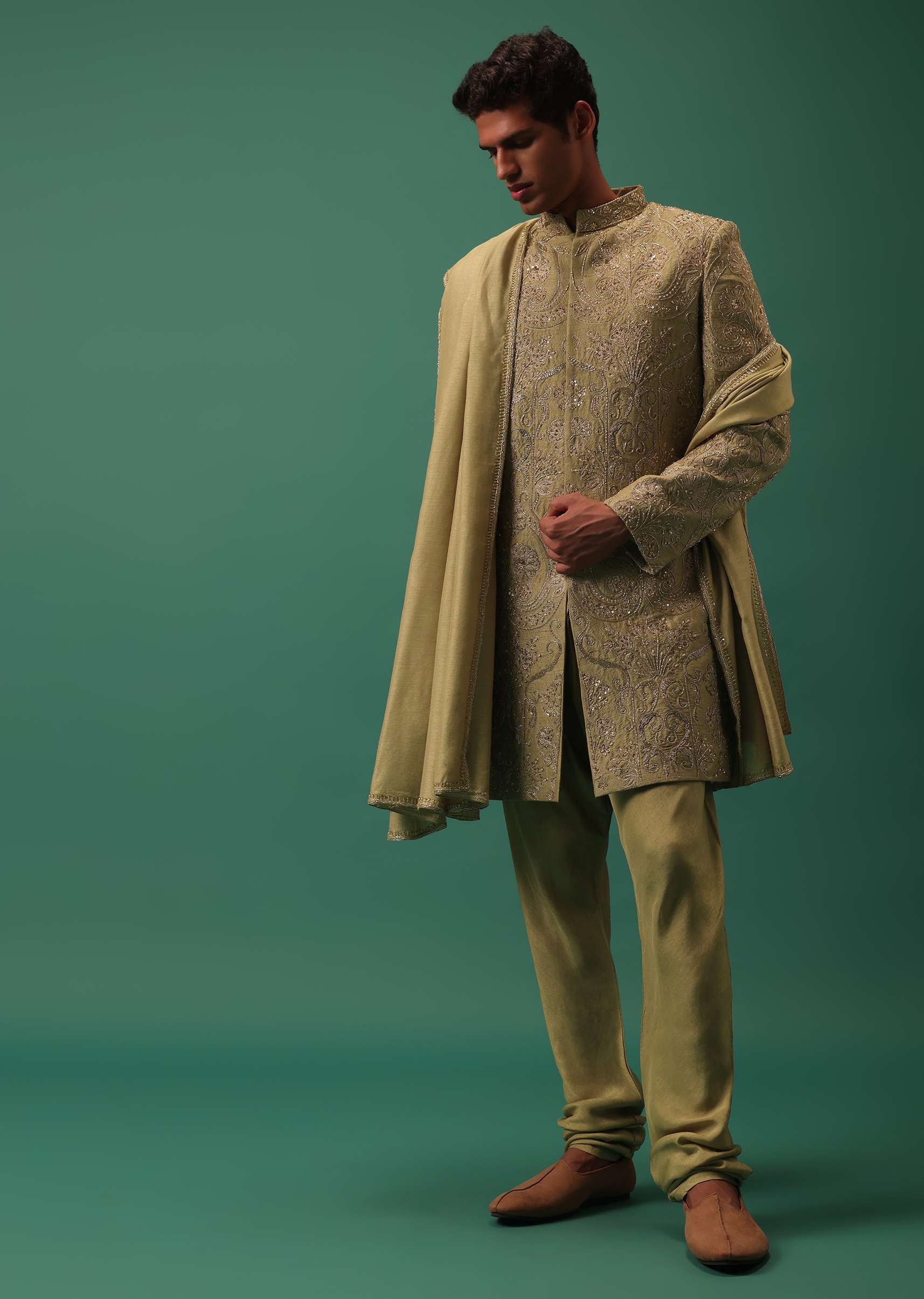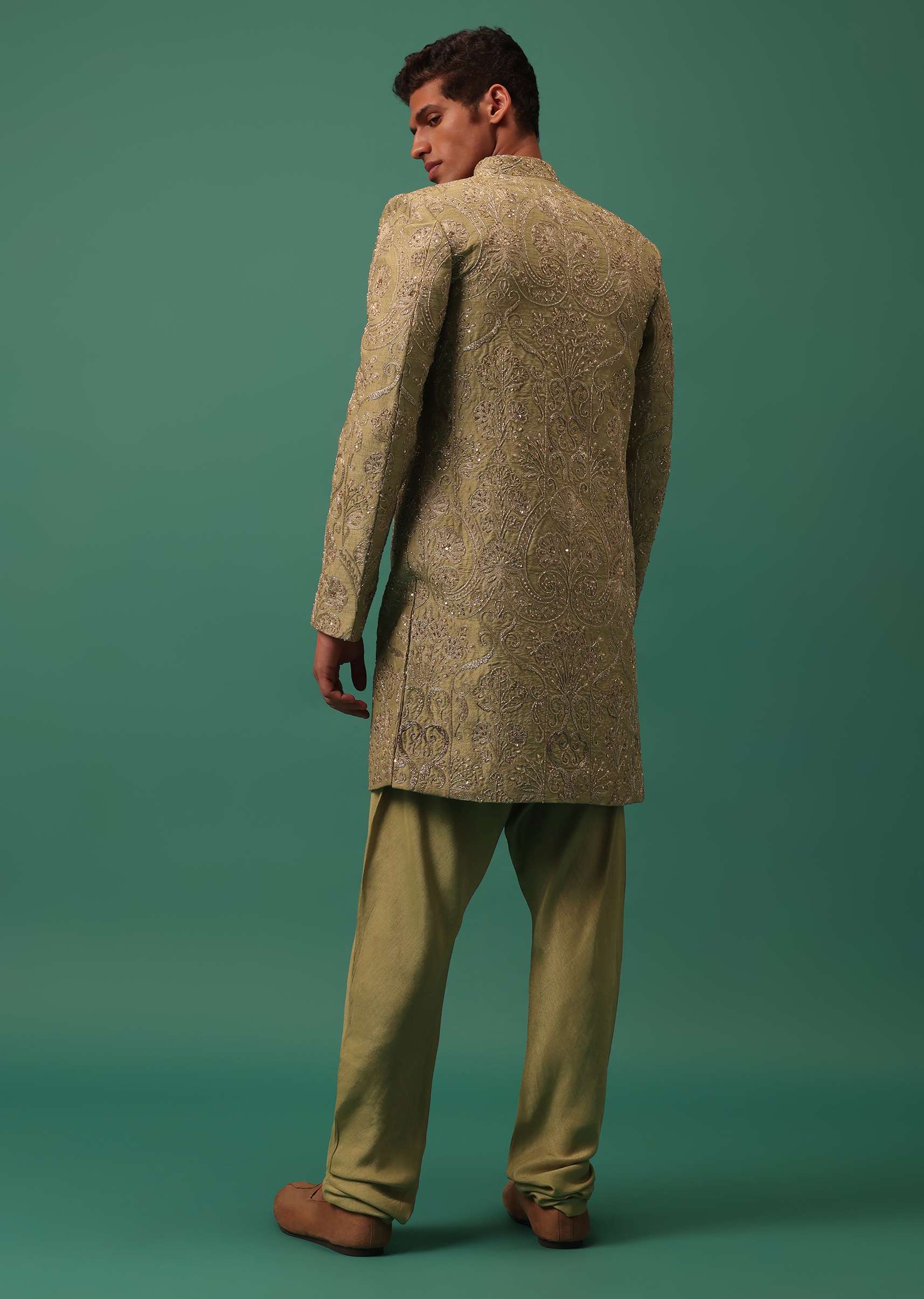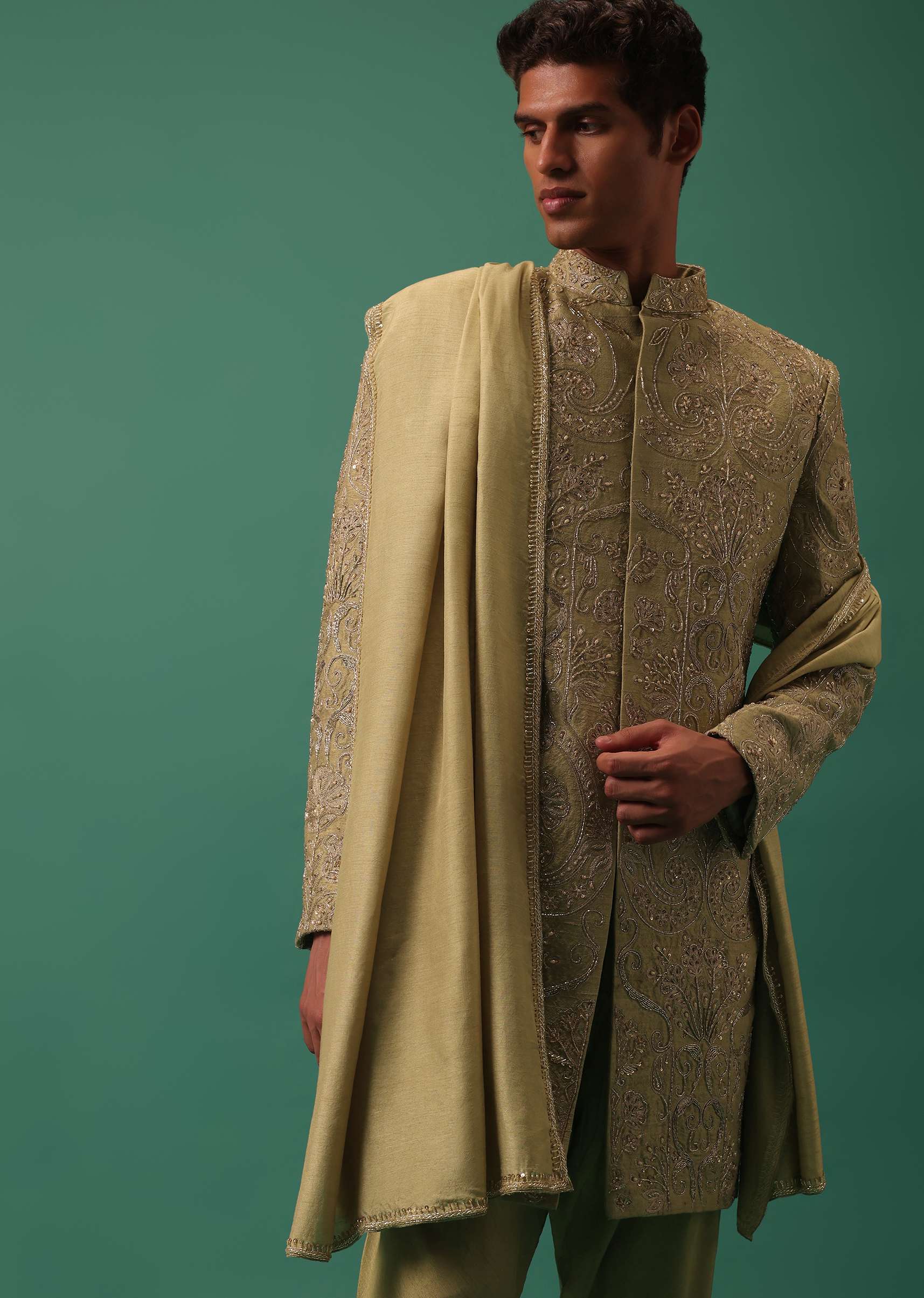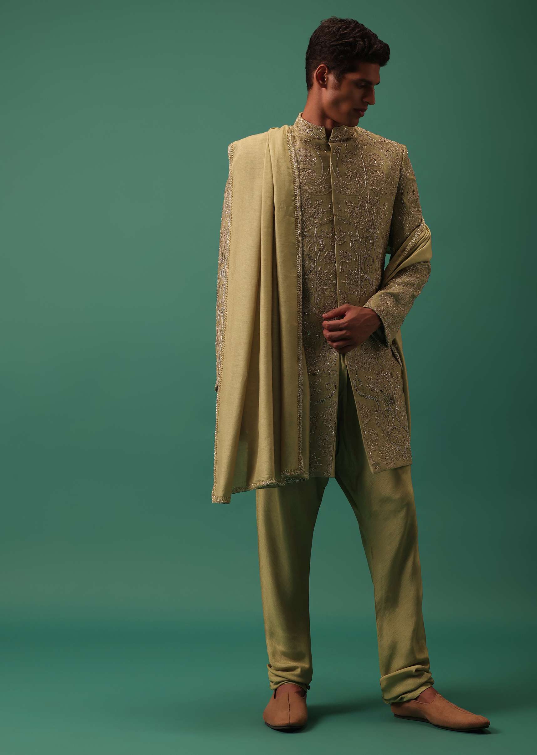 Green Indo-Sherwani Set With Heavy Hand Embroidery