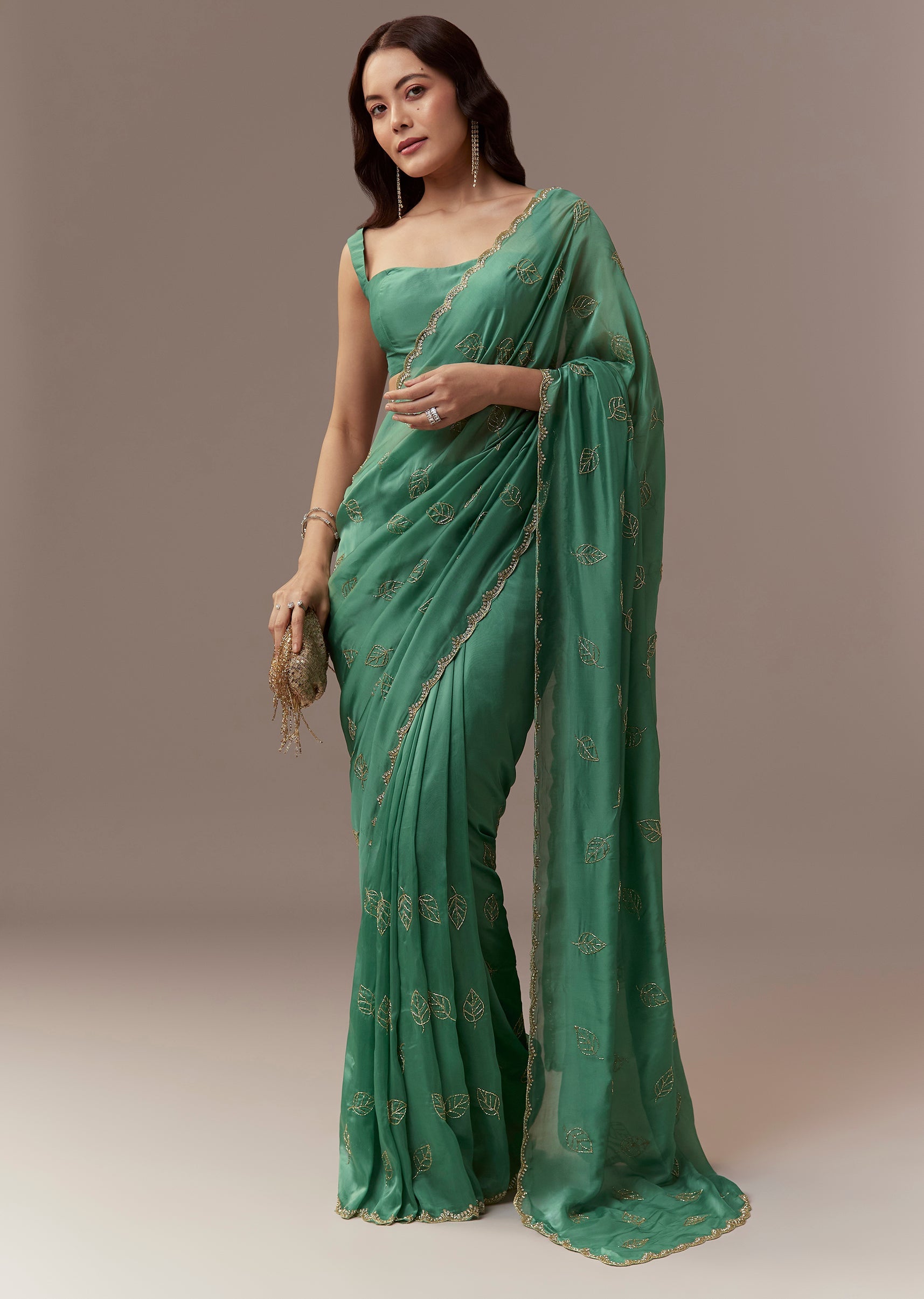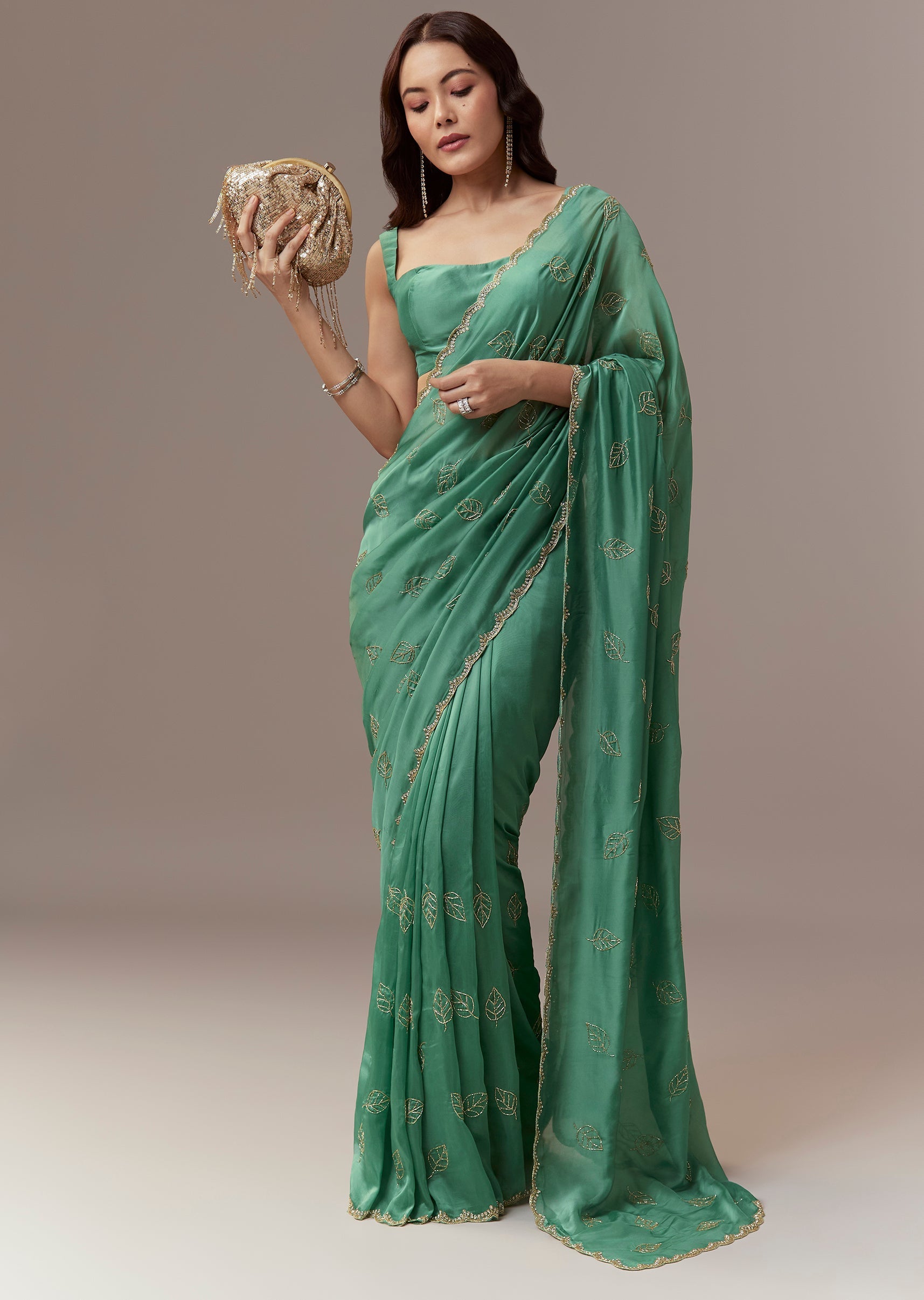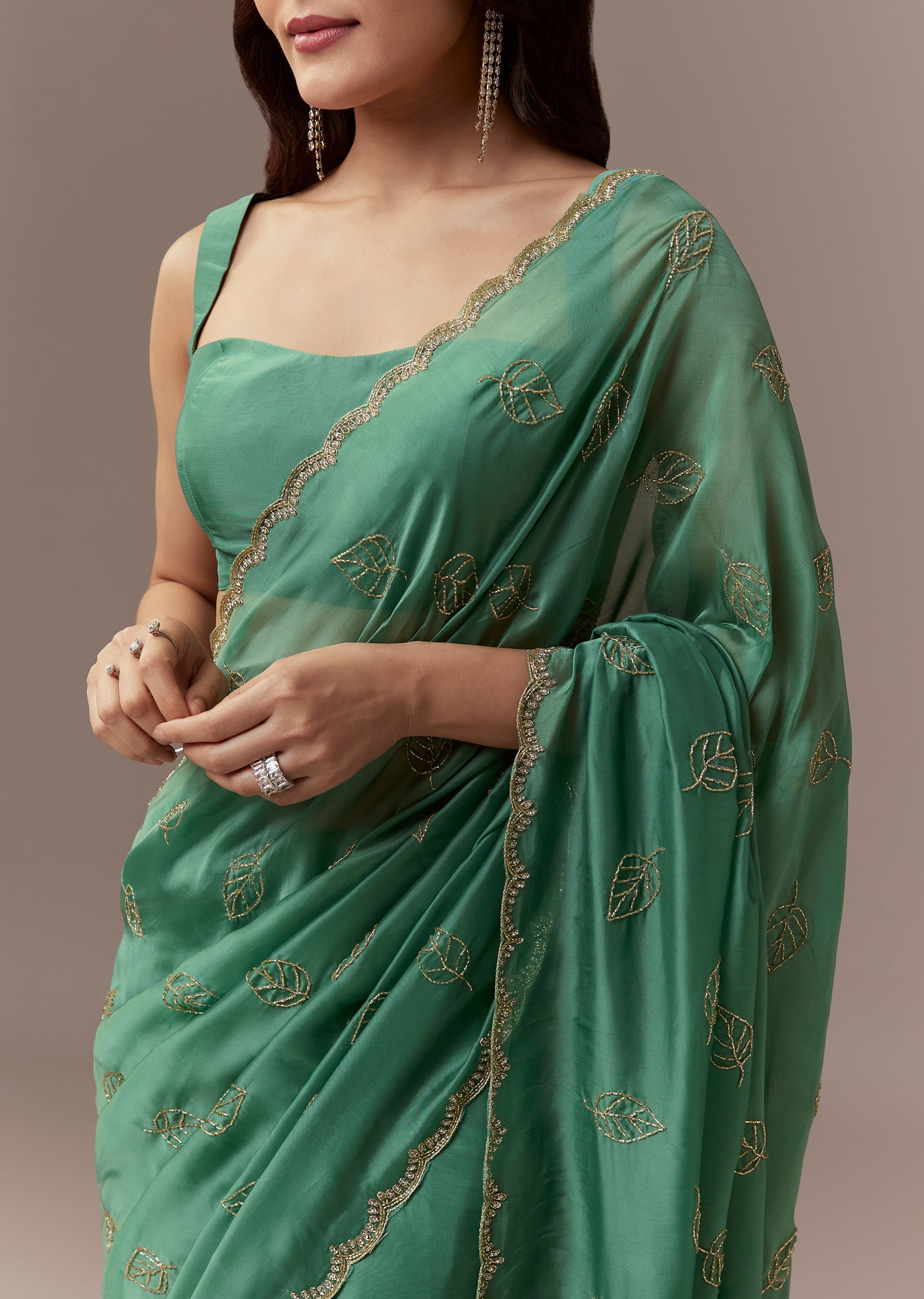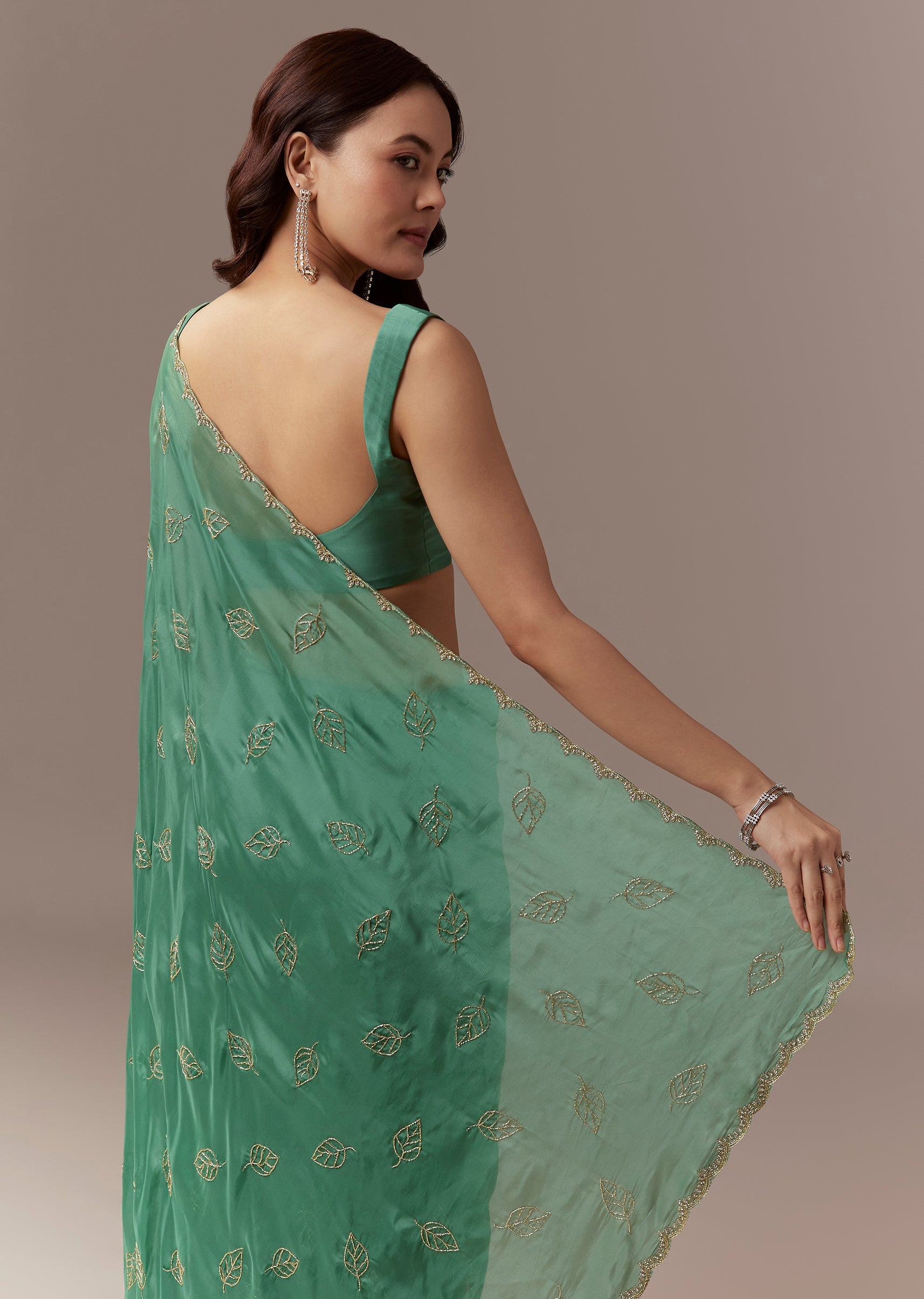 Green Kora Silk Saree With Cutdana Stones And Leaf Motif Embroidery