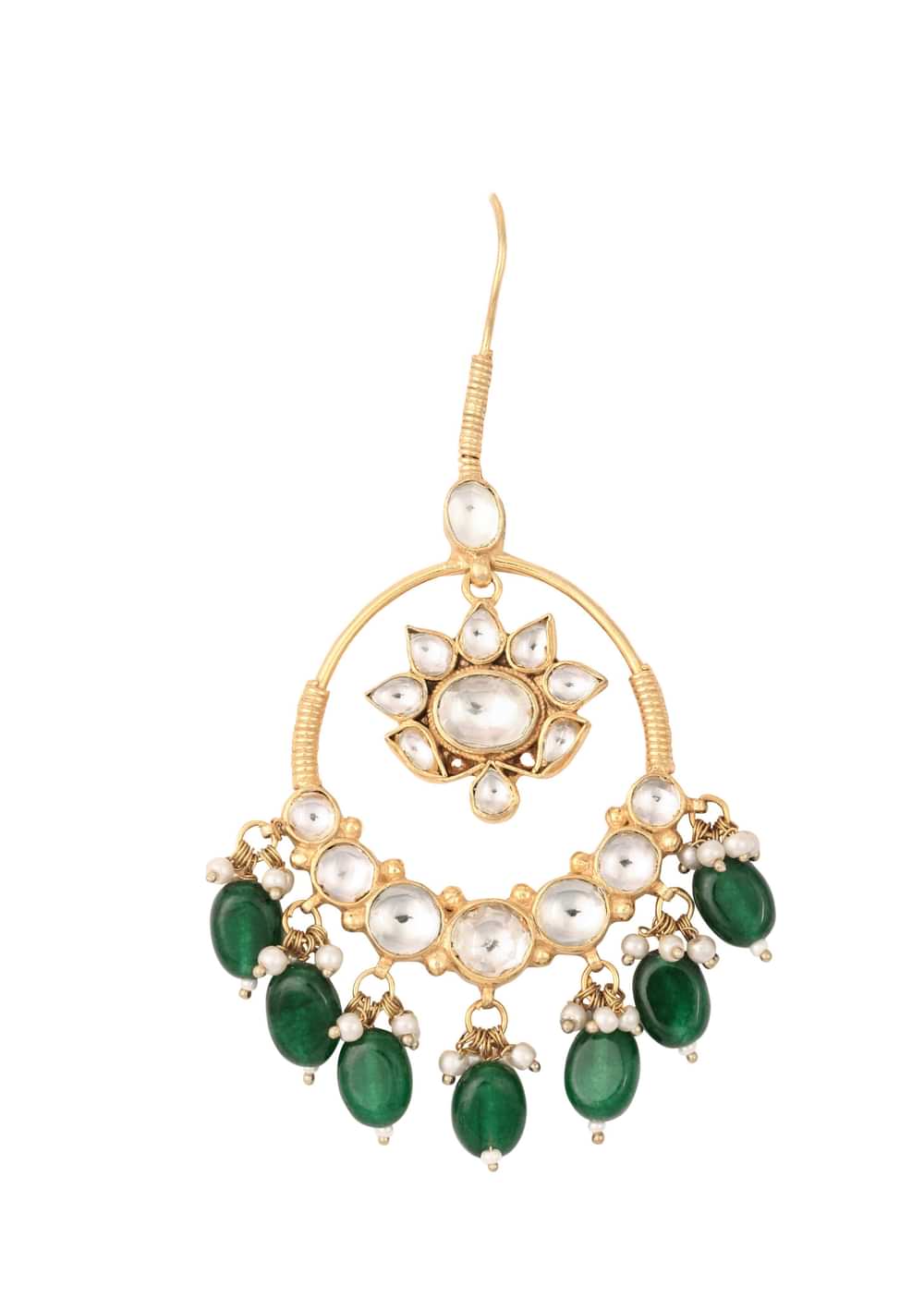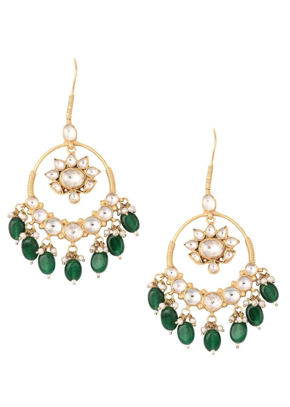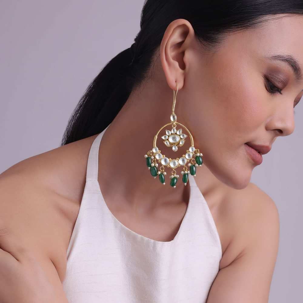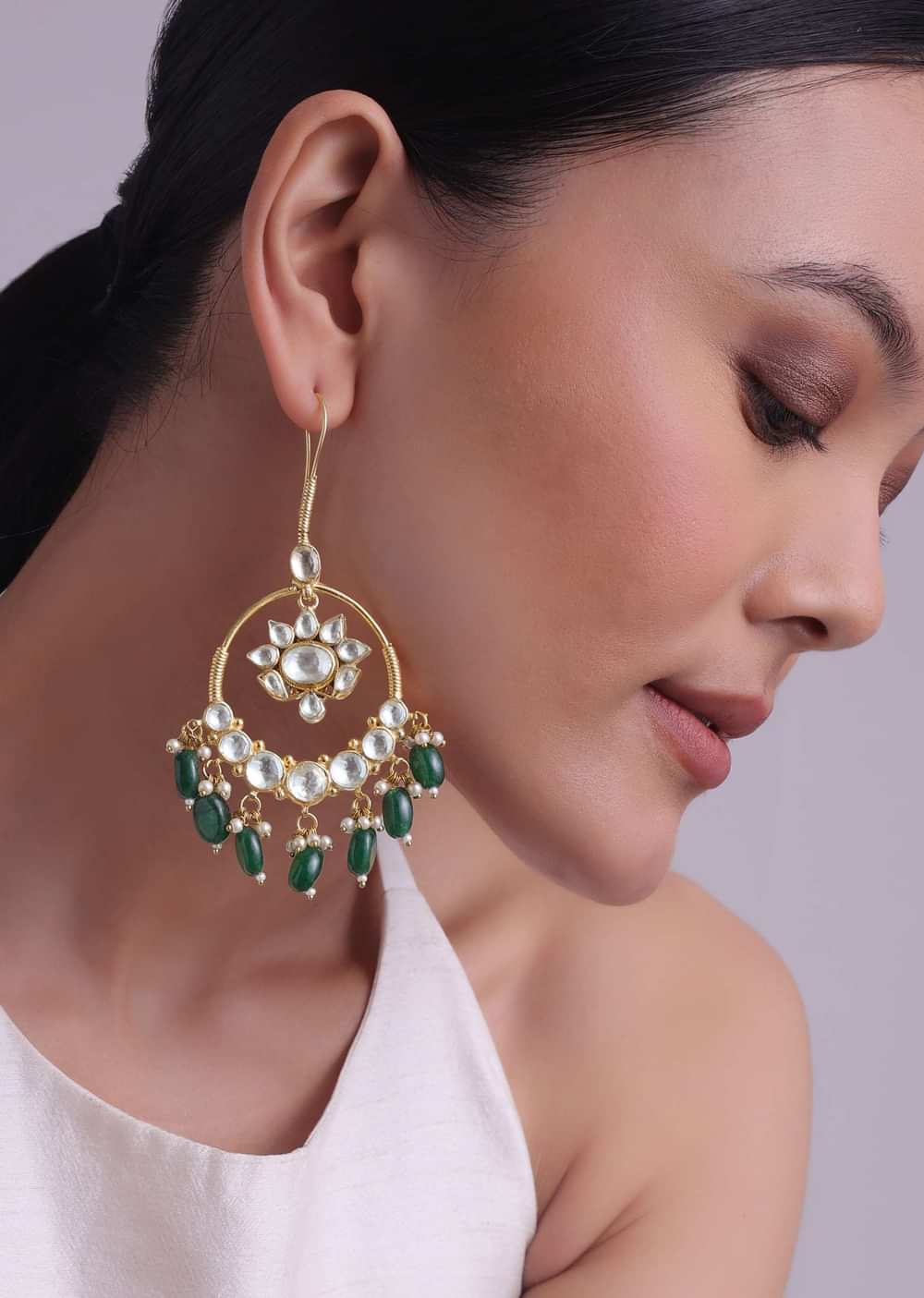 - These are opulent and traditional kundan chandbalis that come with very delicate hangings with a touch of emerald-colored onyx.
