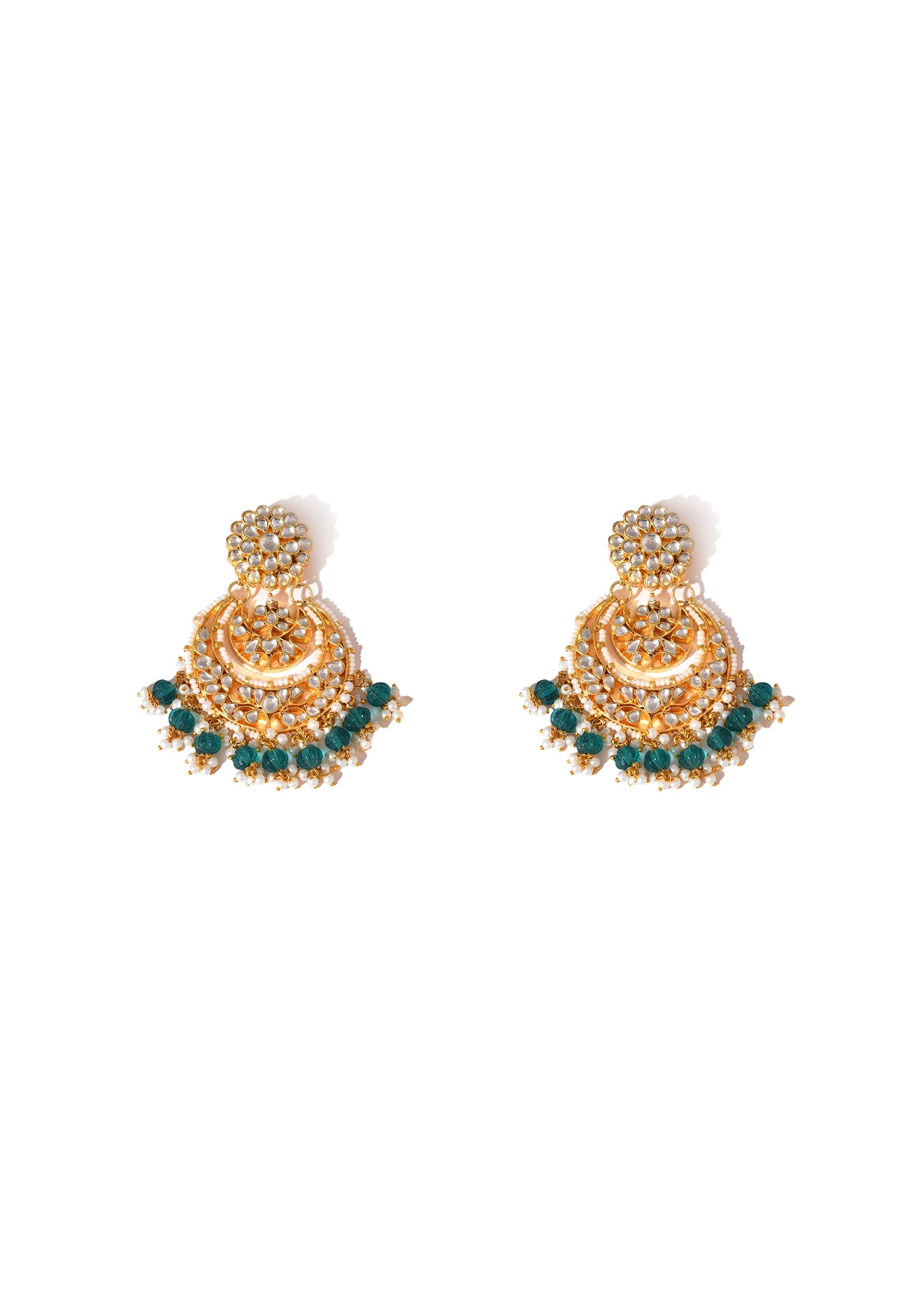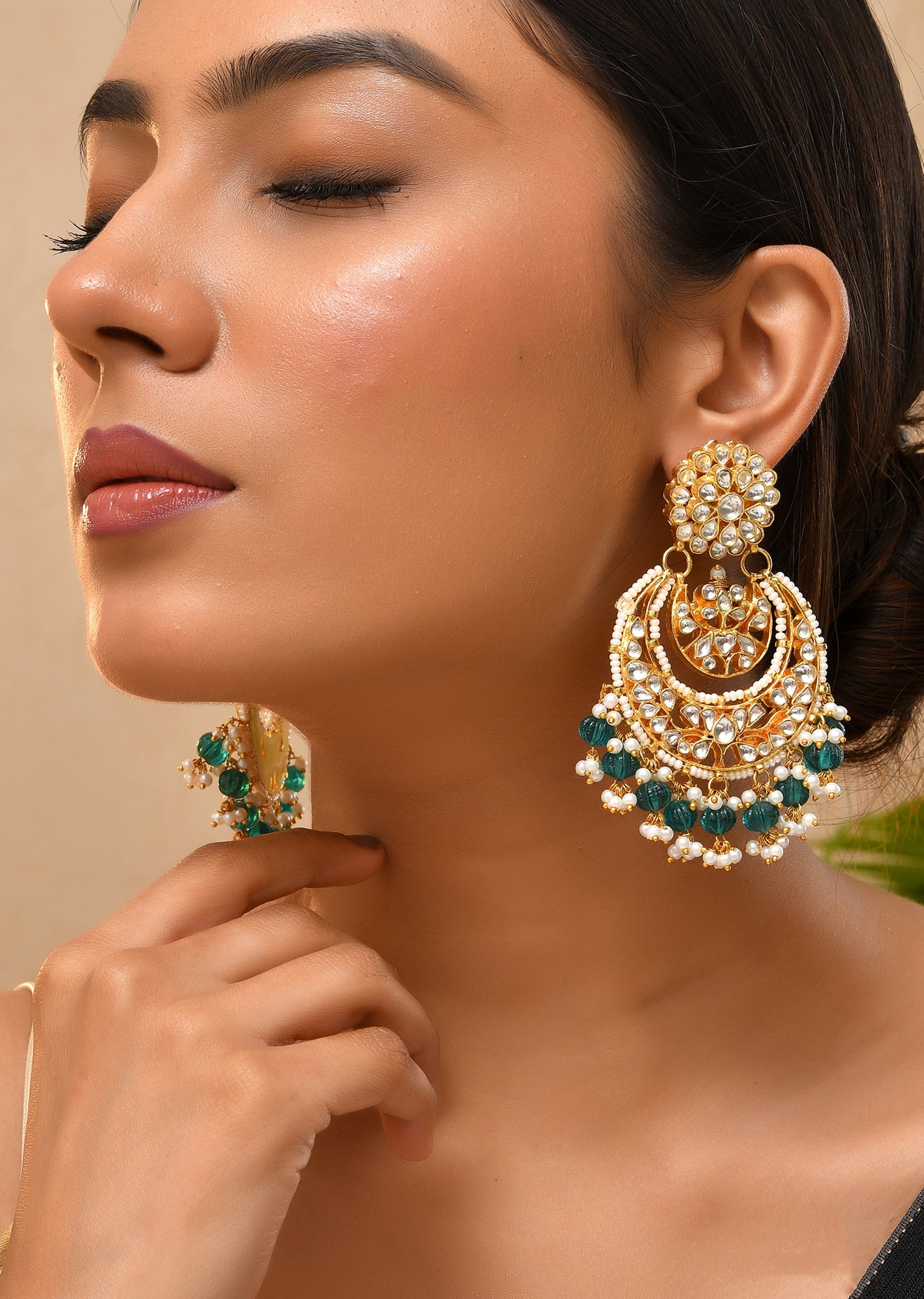 Add a touch of traditional beauty to your look with these green kundan floral chandbalis, crafted with intricate detailing for a rich festive sparkle. Perfect for weddings and celebrations, they... More Product Details