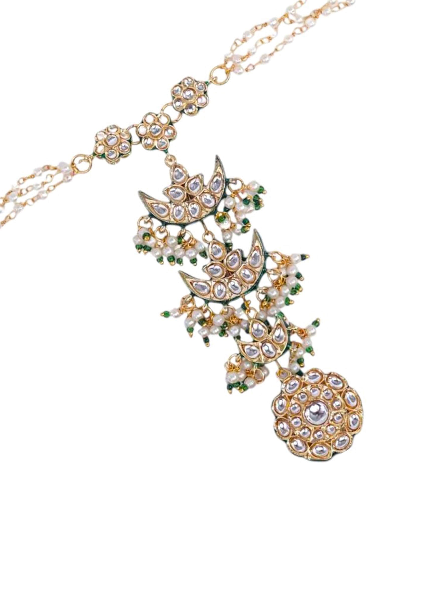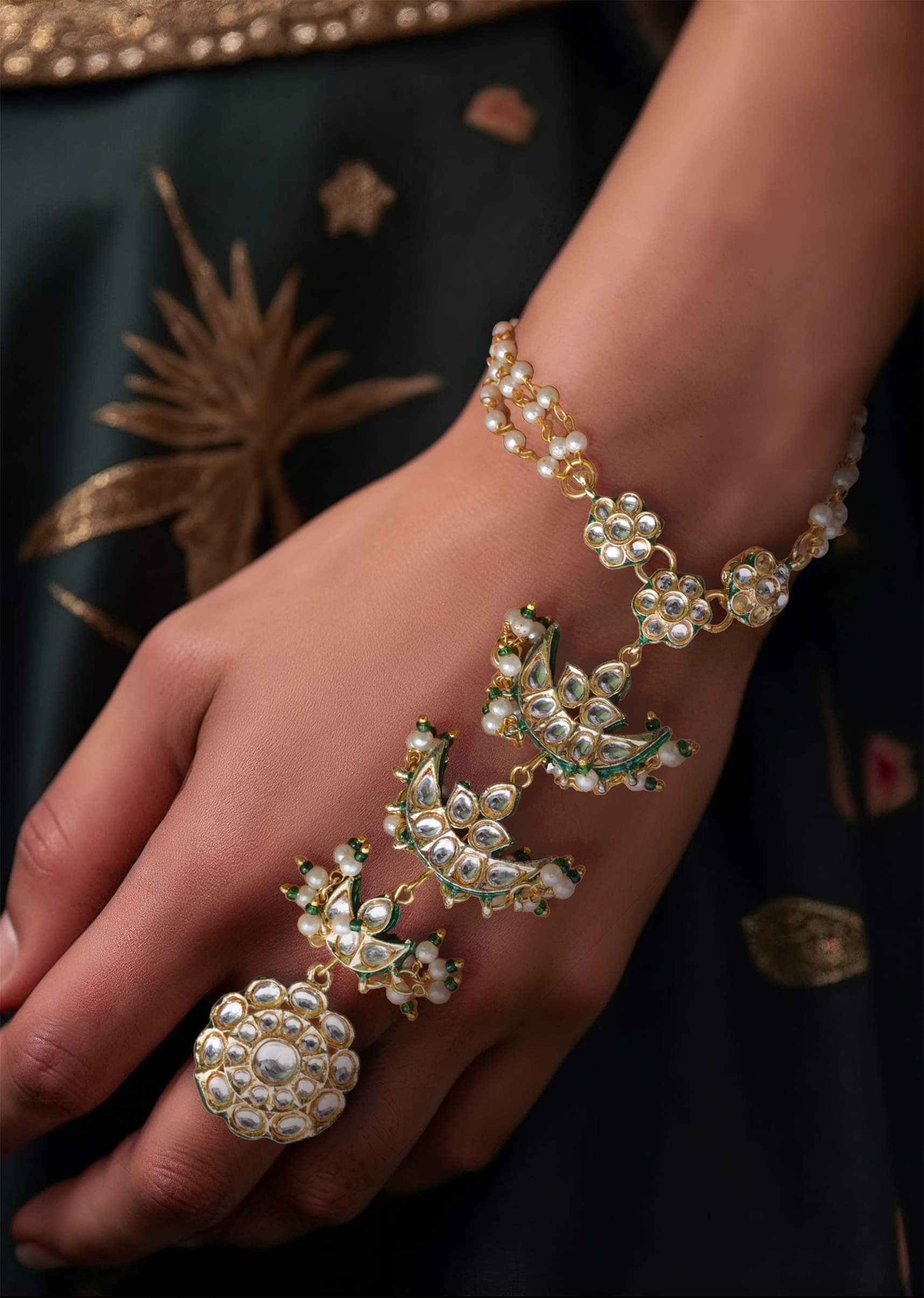A green kundan floral hathphool featuring intricate floral motifs and delicate chains, blending traditional elegance with feminine charm. Perfect for adding a graceful touch to bridal, festive, or ethnic ensembles.... More Product Details