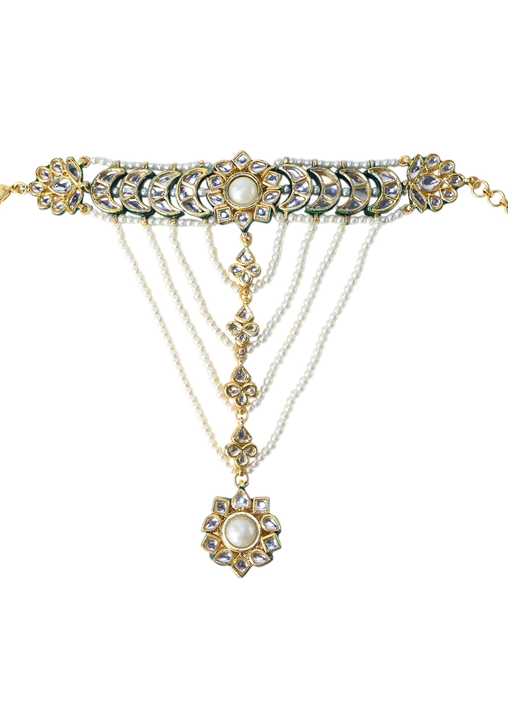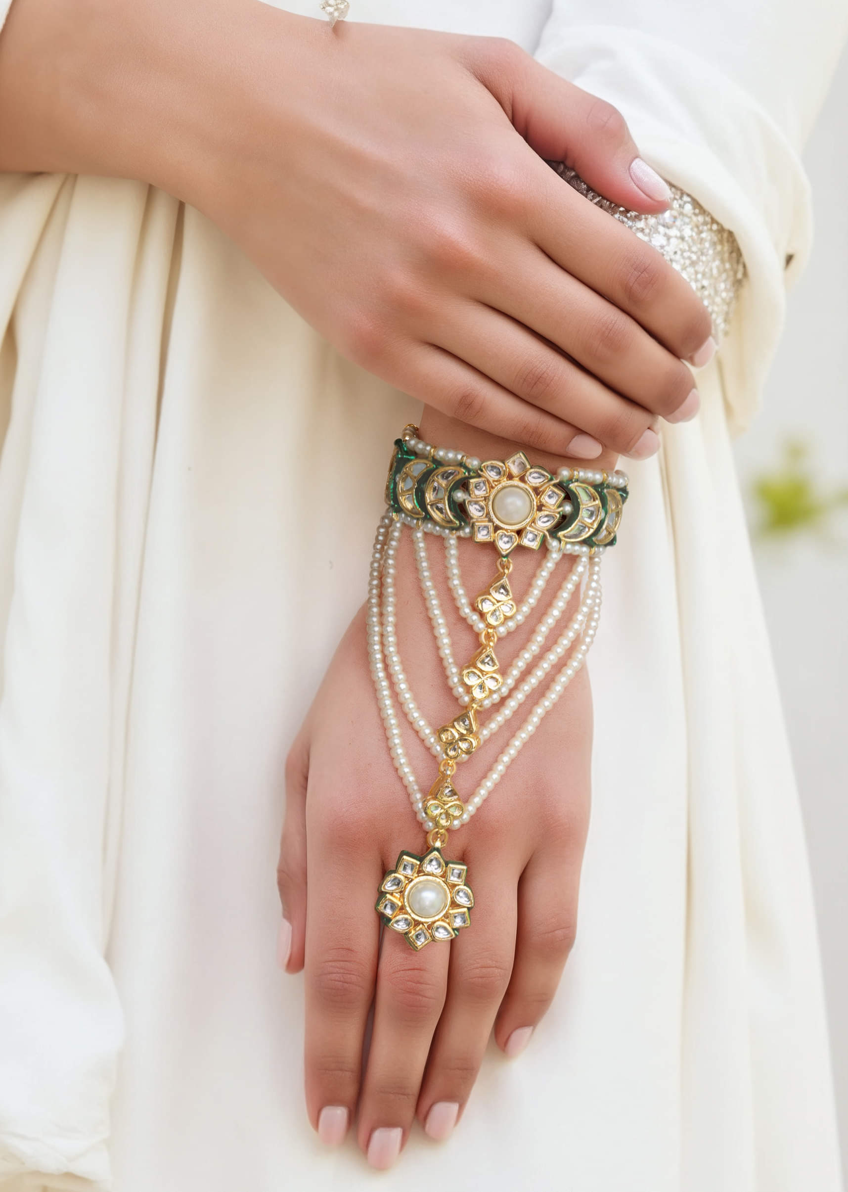 A green kundan hathphool featuring intricate stonework and delicate chains, blending traditional elegance with regal charm. Perfect for adding a sophisticated touch to bridal, festive, or ethnic ensembles. Awarded as the Most Trusted Brand, we're delivering styles you love, just as promised.