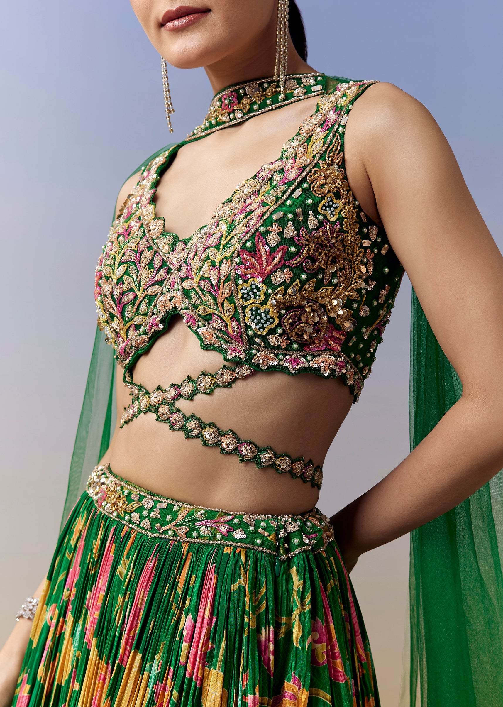 Green Lehenga With Floral Print And Sequins Moti Cut Dana Work