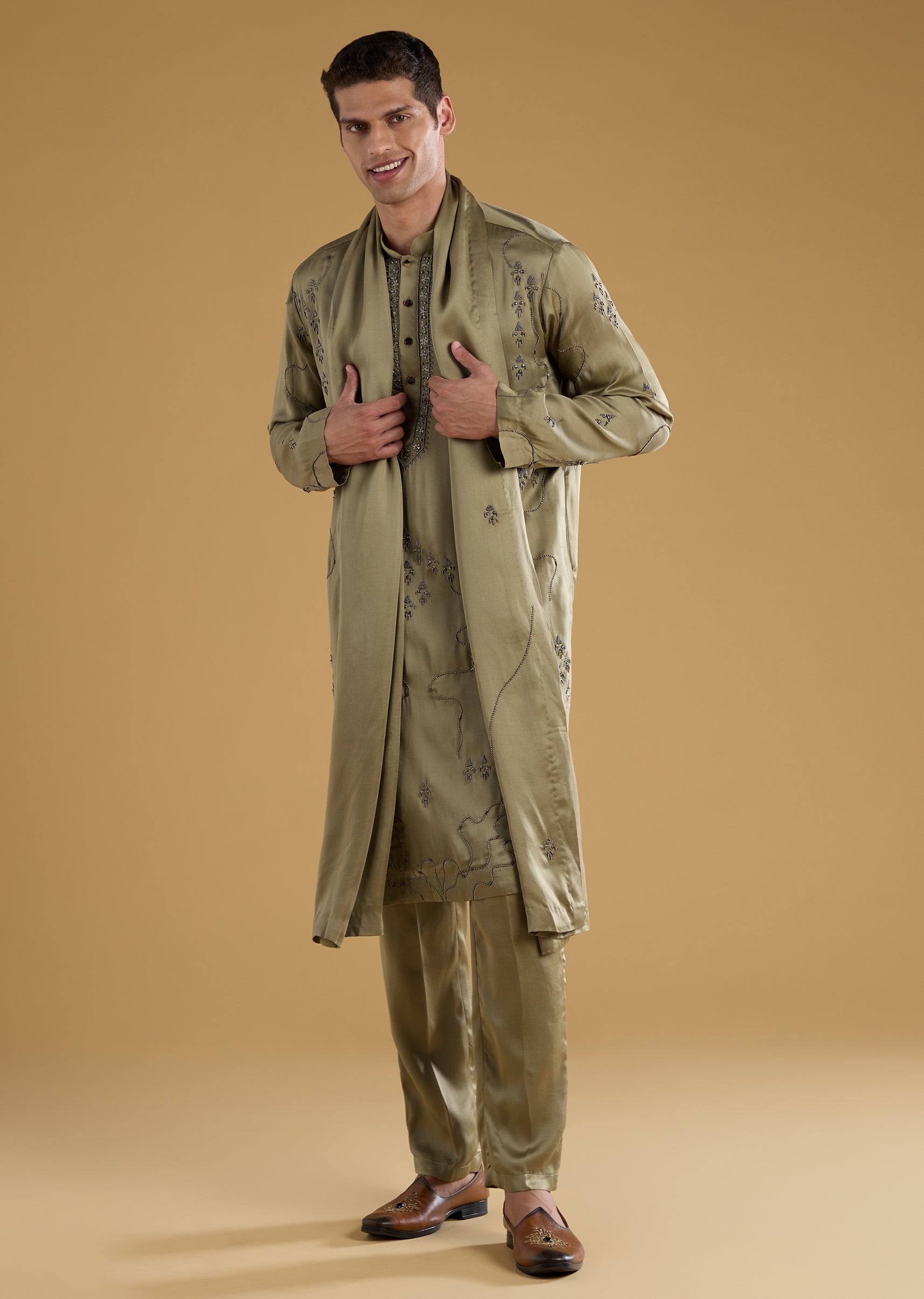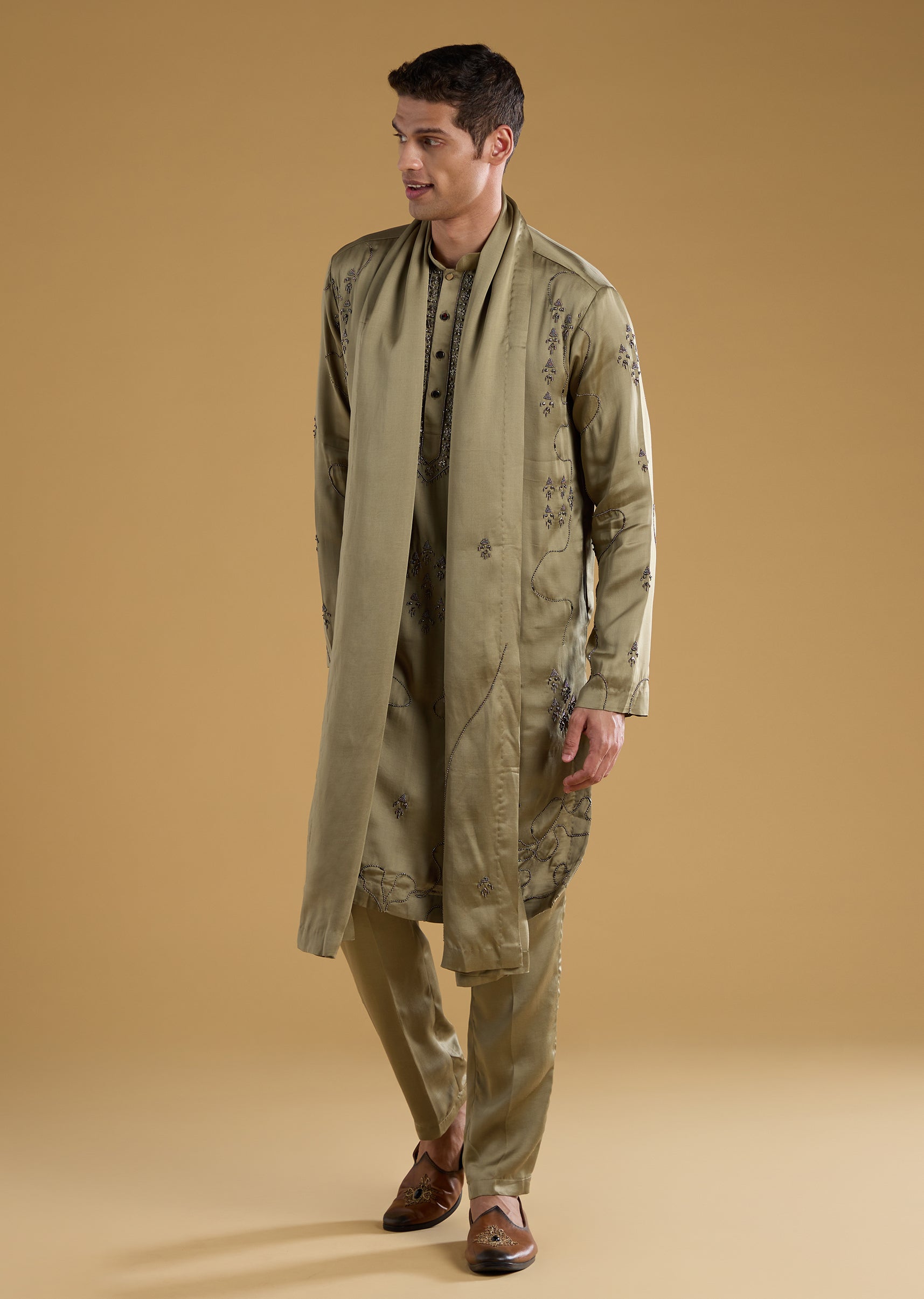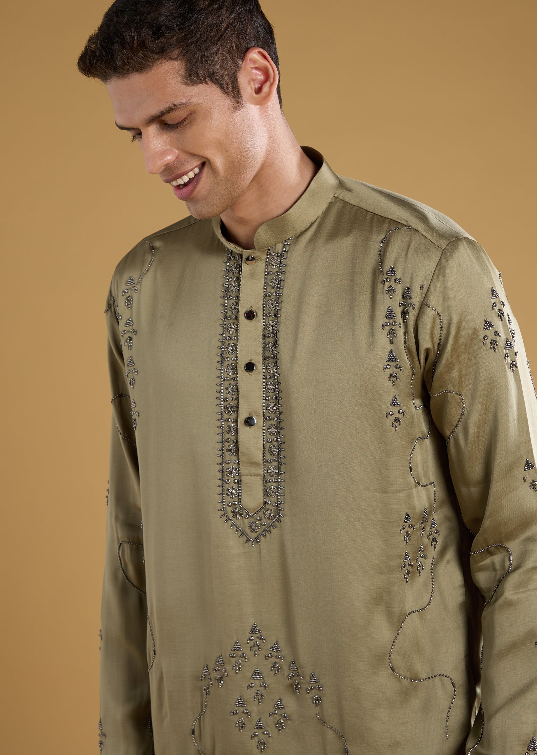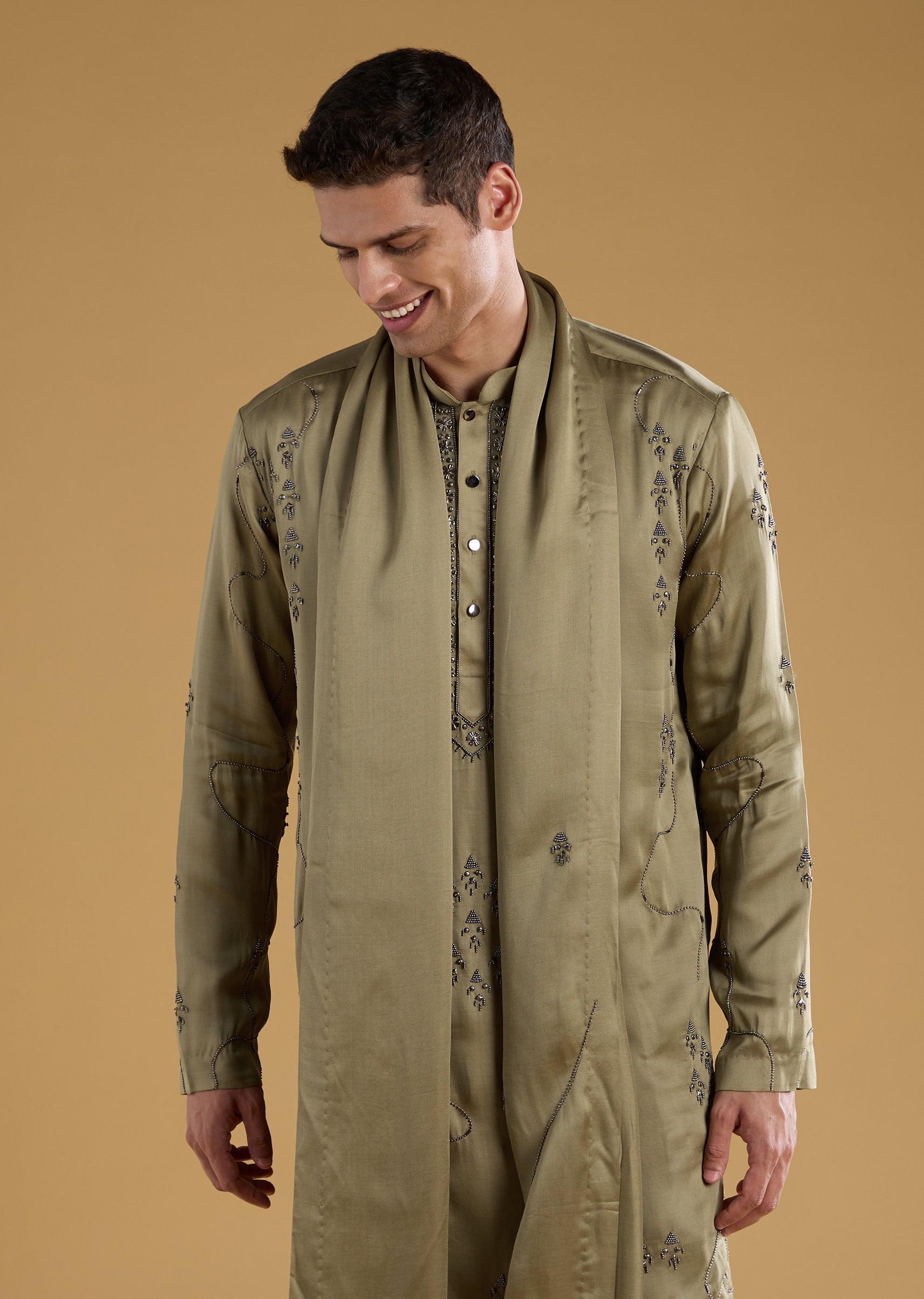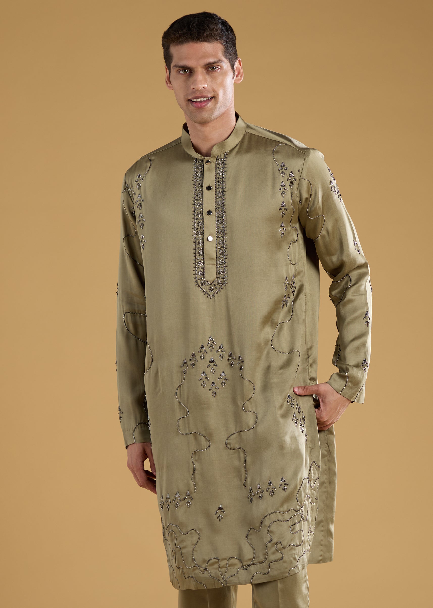 This silk and linen blend kurta set brings a touch of modern elegance with its detailed metal, bead, and resham work that adds subtle festive shine. The full sleeve mandarin collar kurta pairs effortlessly with matching pants and a dupatta, offering a look that is both polished and graceful. Finished with front buttons, the ensemble strikes a perfect balance between classic charm and contemporary refinement. Awarded as the Most Trusted Brand, we're delivering styles you love, just as promised.