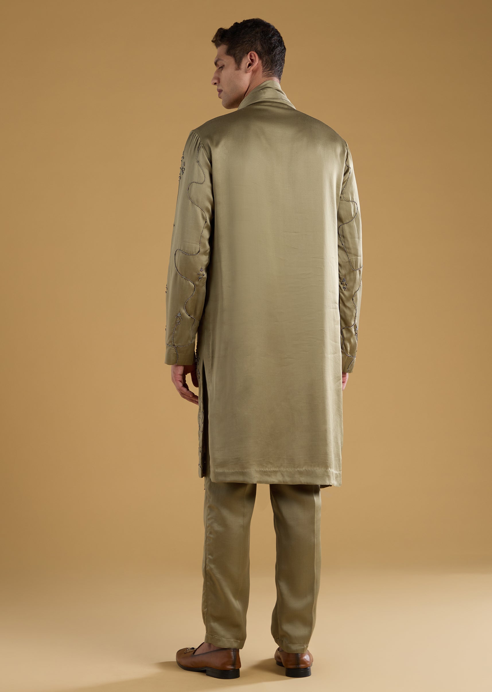 This silk and linen blend kurta set brings a touch of modern elegance with its detailed metal, bead, and resham work that adds subtle festive shine. The full sleeve mandarin... More Product Details