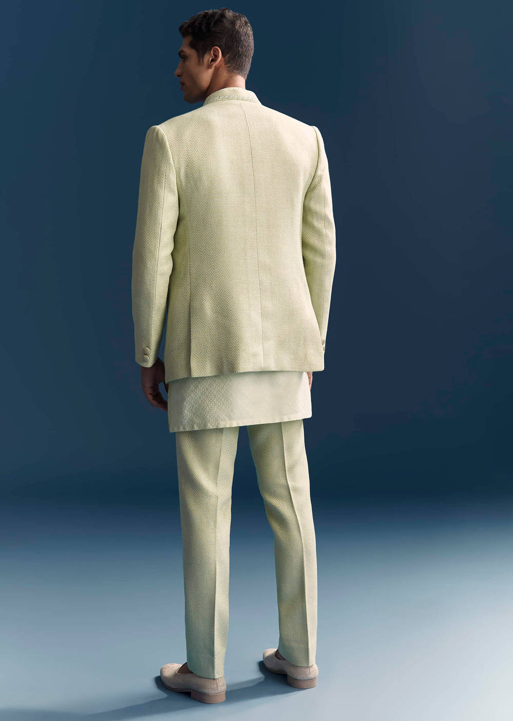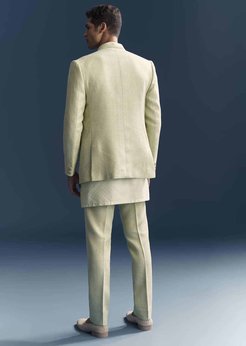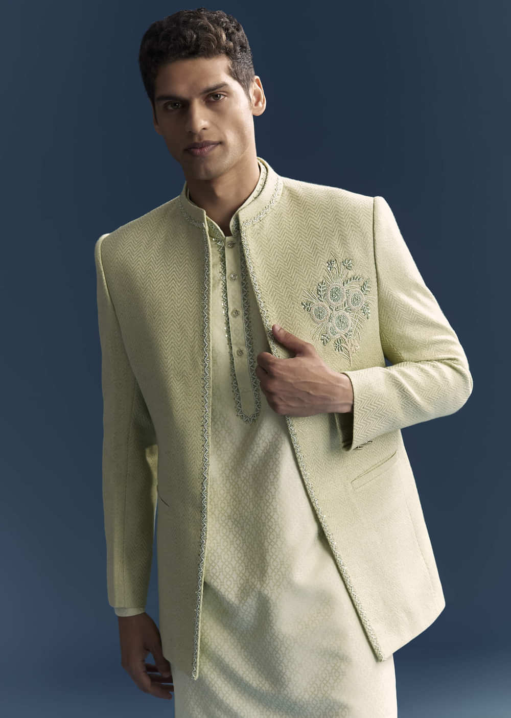 Texture and craft meet as this green matka silk jodhpuri suit adds french knot, zardosi, and moti work near the collar and chest. The matte weave keeps things sophisticated in... More Product Details