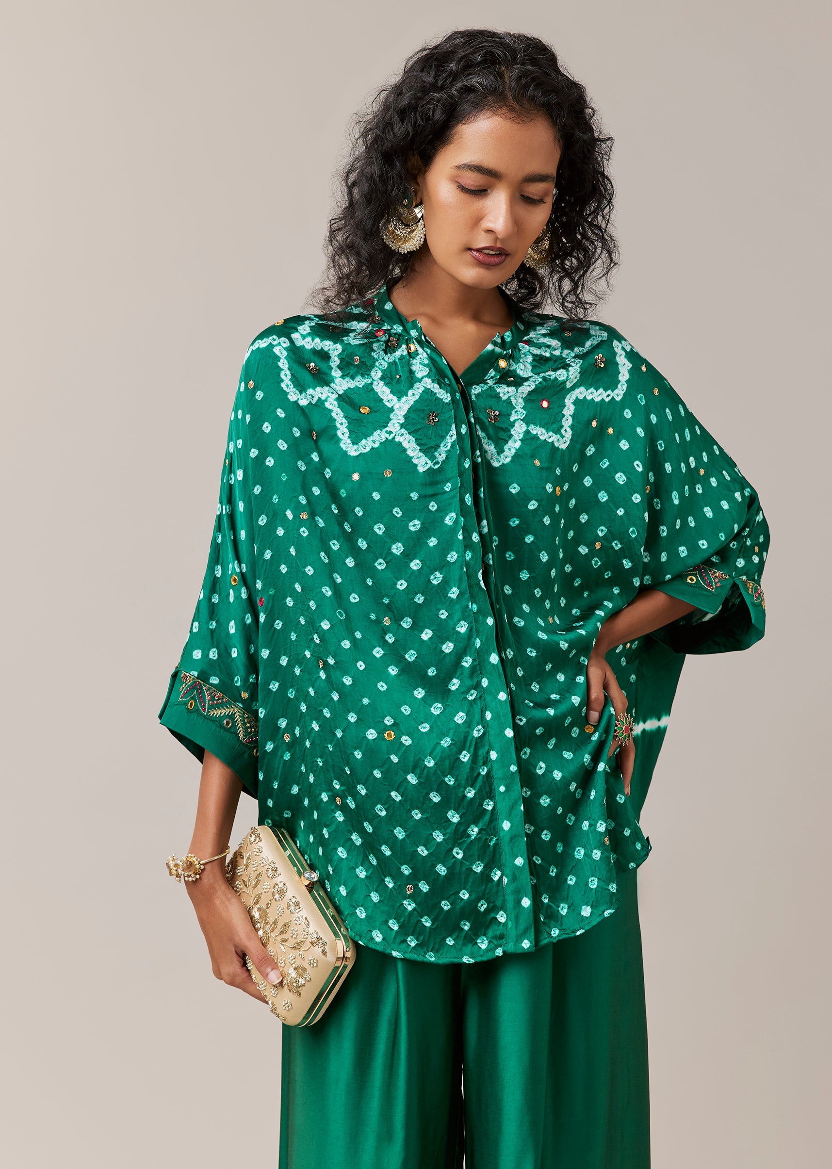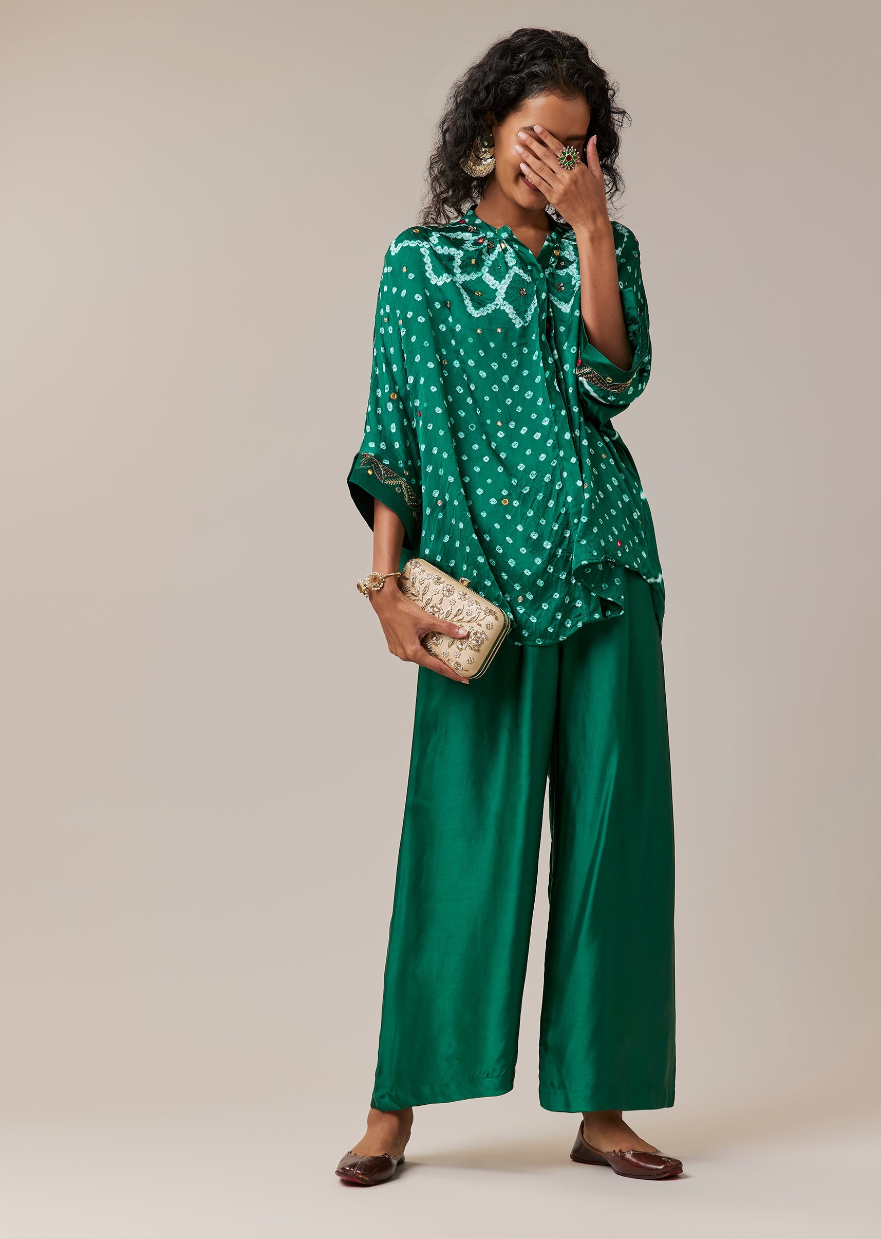 Green Mirror Work Hand Dyed Bandhani and Leheriya Pant Set