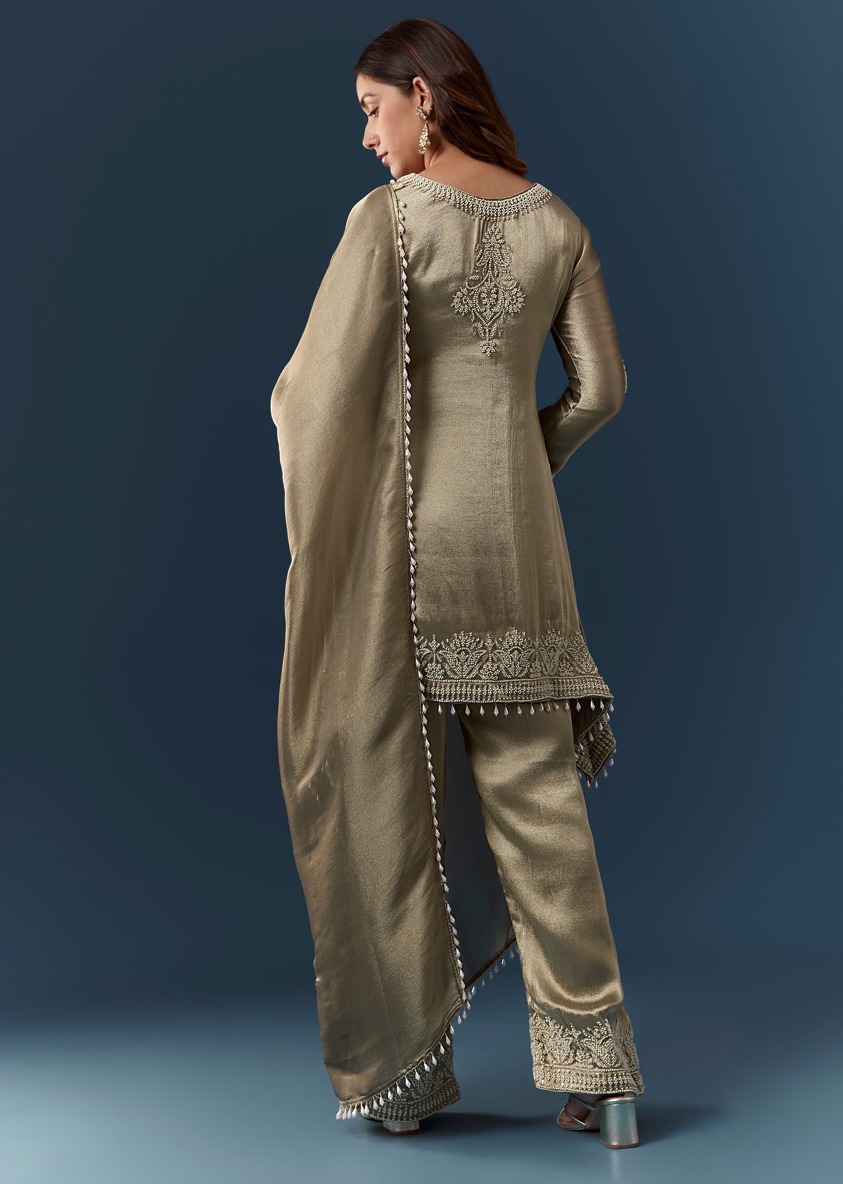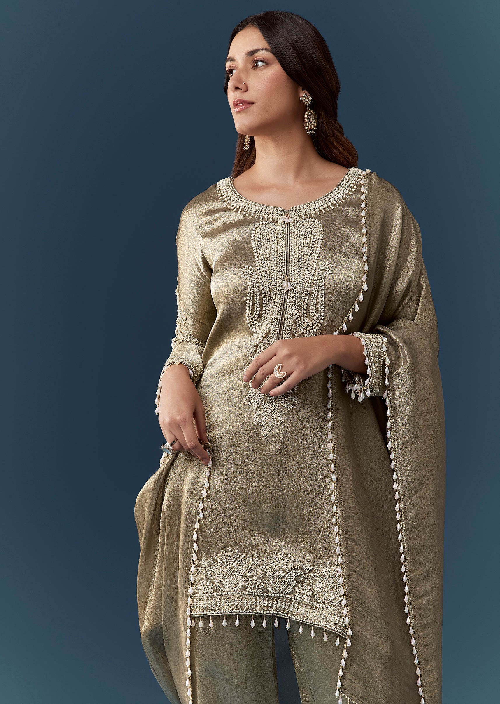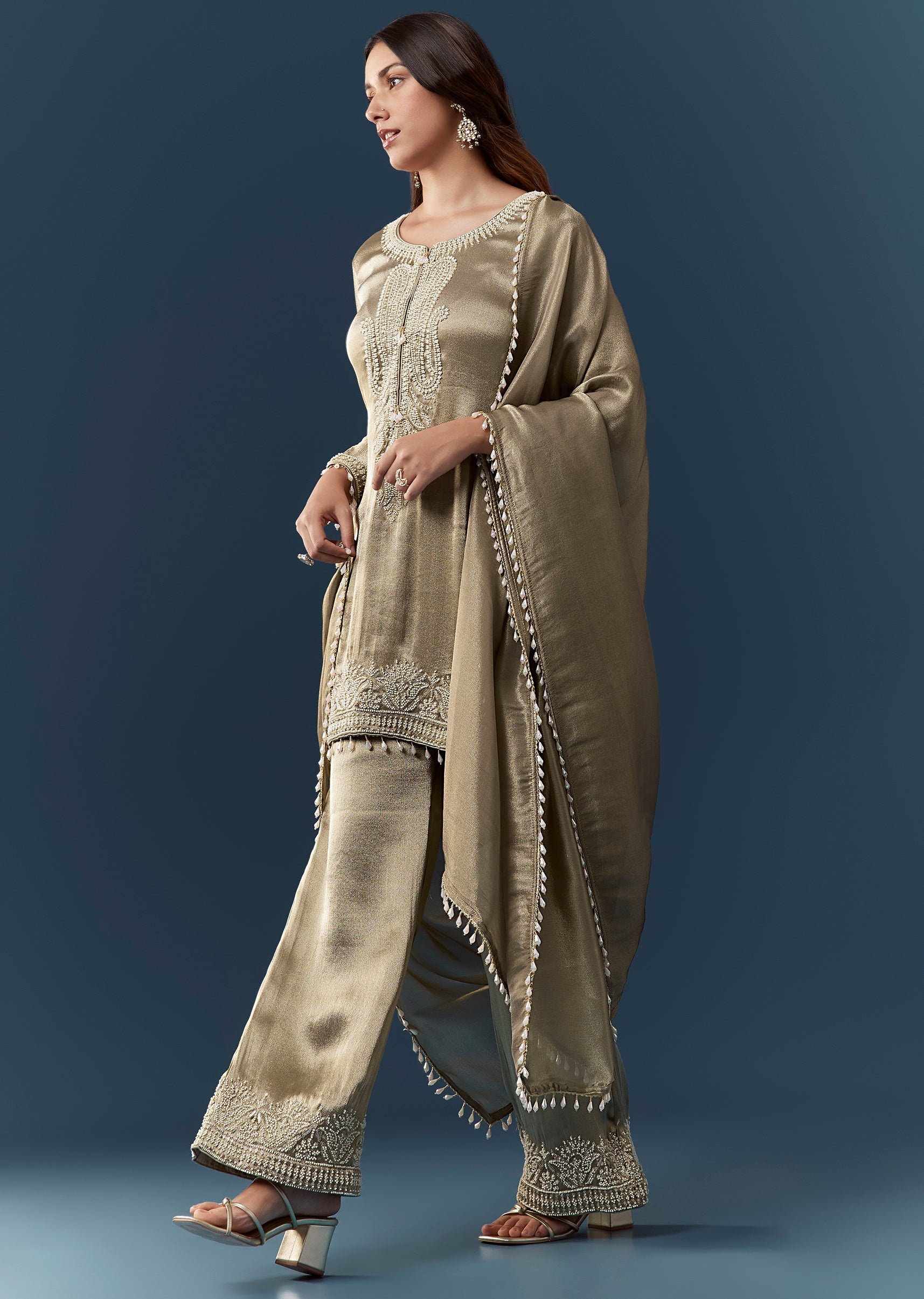 A touch of refined charm defines this green tissue kurta set, beautifully highlighted with delicate moti work that brings a gentle festive glow. The three fourth sleeve round neckline kurta... More Product Details