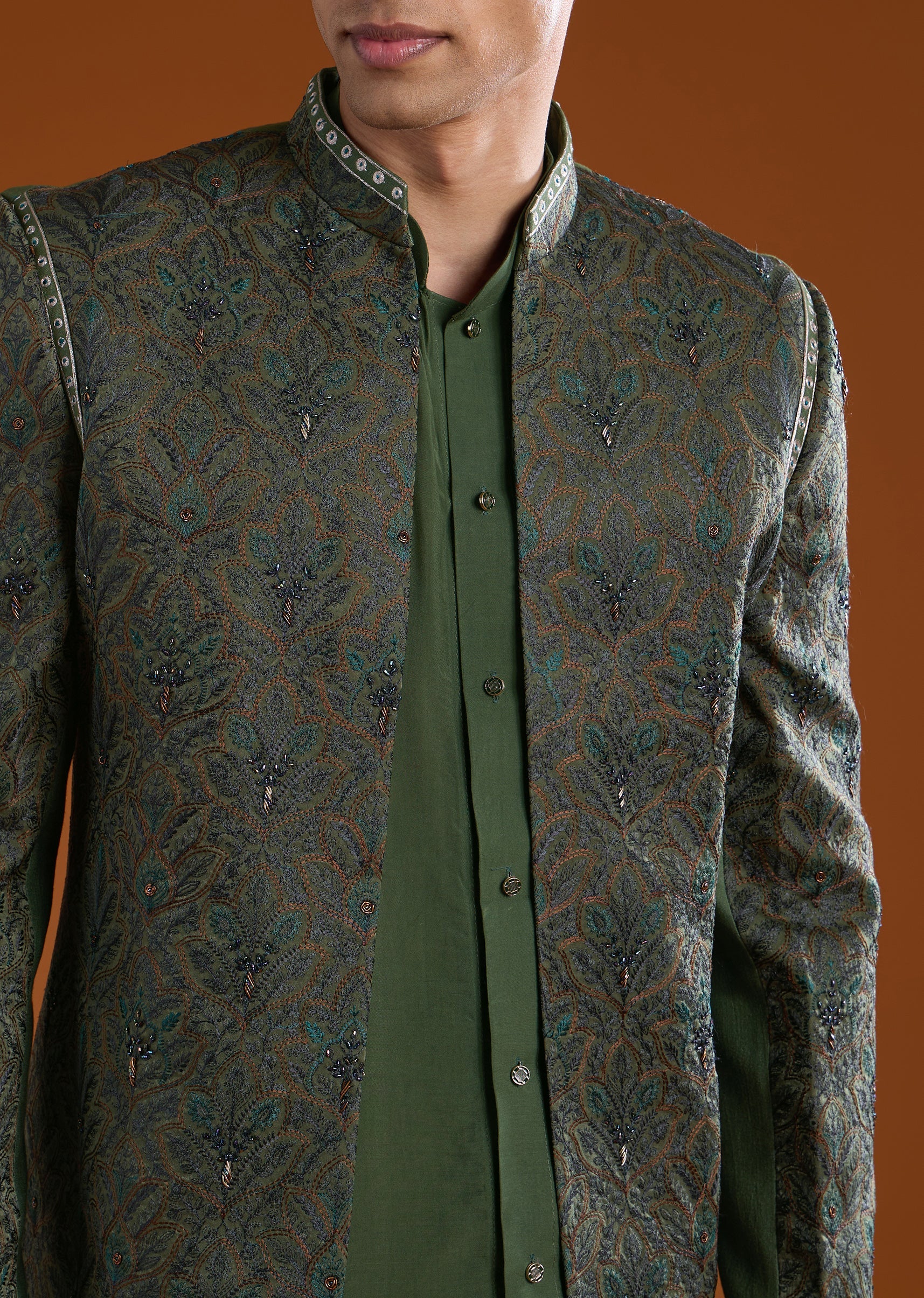 Designed with a layered elegance, this muslin jacket kurta set reflects refined indo western styling. The ensemble features intricate thread and resham work, highlighted with motifs, zari accents, and subtle cut dana detailing for a rich yet balanced look. Full sleeves and a mandarin collar add structure, while the lightweight muslin fabric keeps it comfortable and graceful. Completed with coordinated pants, this set is perfect for festive celebrations, weddings, and sophisticated gatherings.Awarded as the Most Trusted Brand, we're delivering styles you love, just as promised.