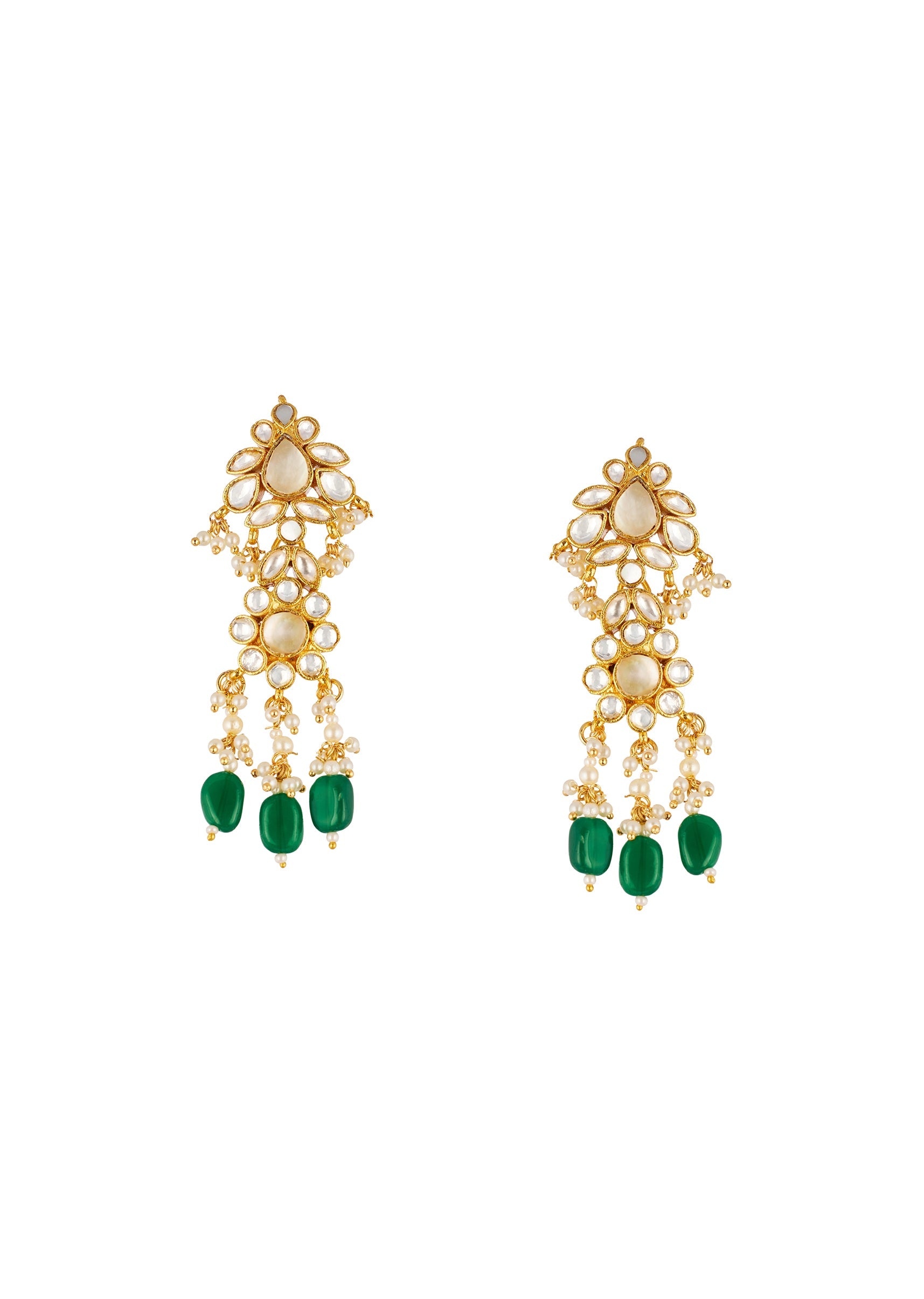 An ode to regal bridal beauty, this traditional gold tone Kundan style jewelry set is adorned with luminous faux pearls and rich green simulated emerald stones. The ornate necklace, matching... More Product Details