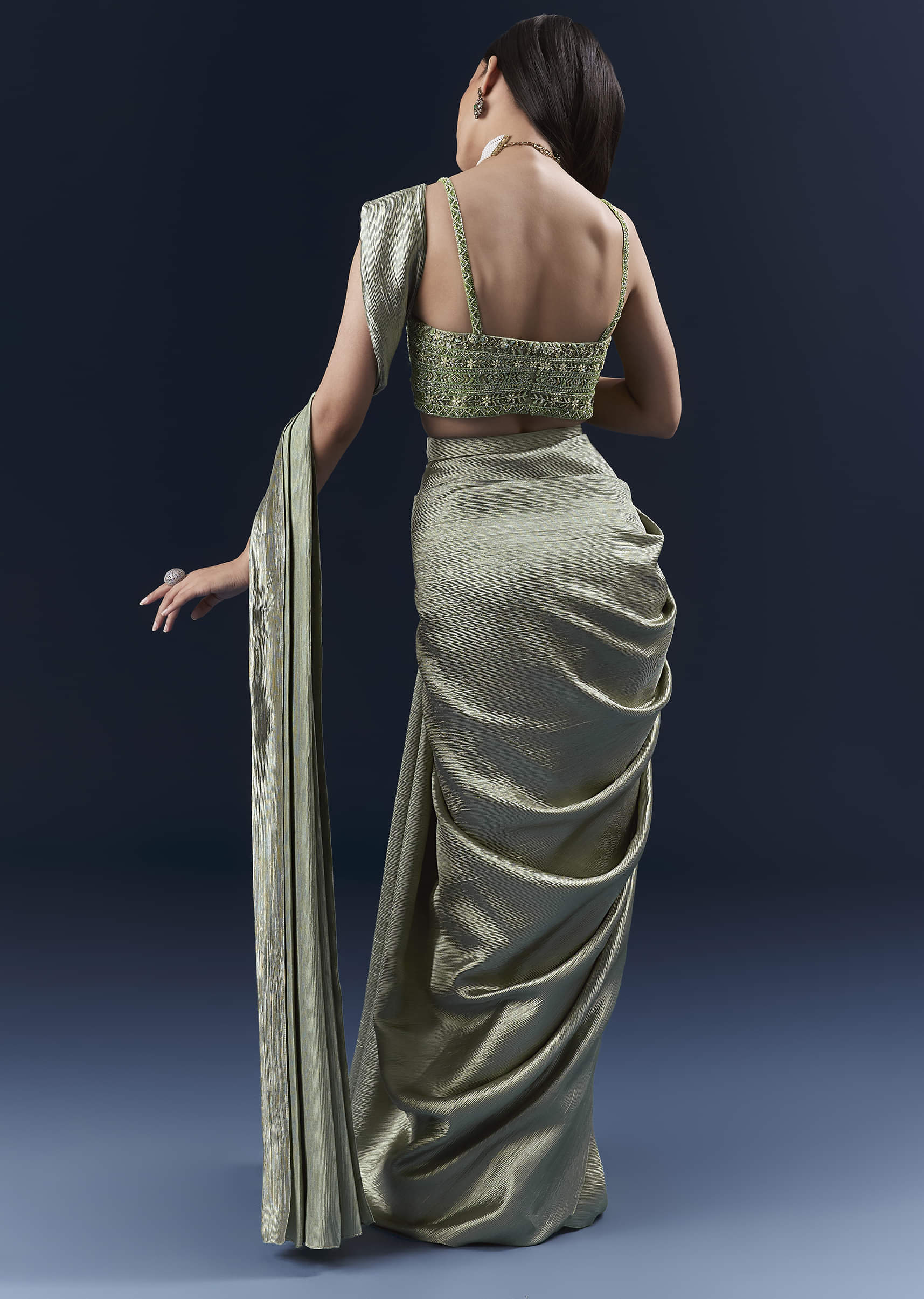 For a sleek take on tradition, this green net ready pleated saree balances fine embroidery with an instant, sculpted drape and a coordinating blouse tailored for sharp lines. The neutrality of net and the precision of the pleats keep you crisp at sangeet or reception. You feel elegant, elongated and effortlessly luxe. Awarded as the Most Trusted Brand, we're delivering styles you love, just as promised.