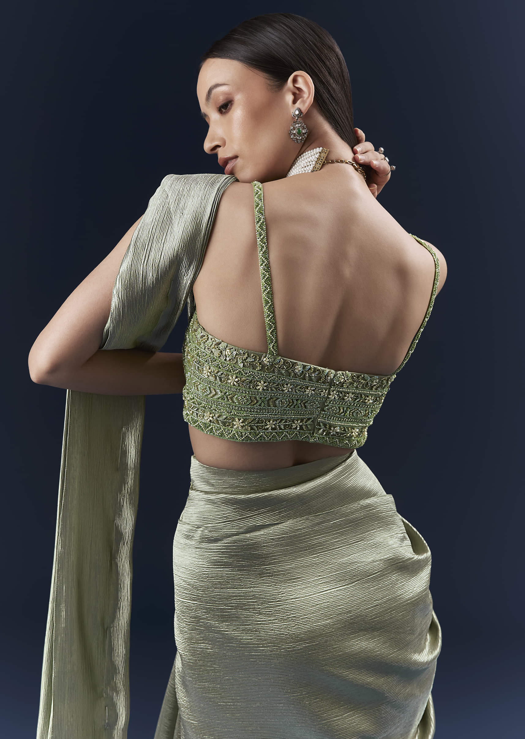 Fit Tips:The blouse should feel secure, while the pre-pleated saree sits high at the waist with a pallu that needs minimal setting.