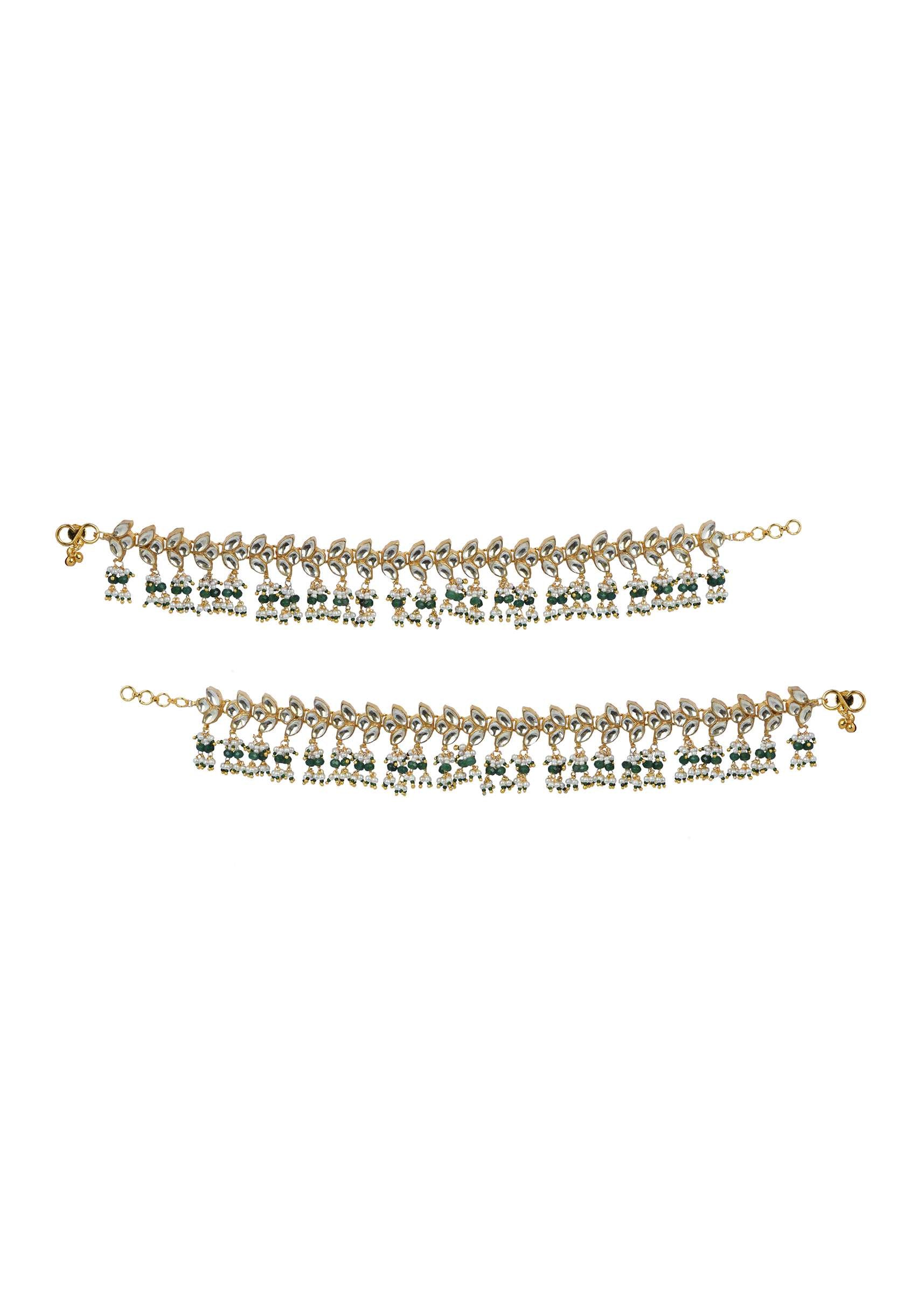 - The gold finish base is enriched with delicately cut kundan and cluster bead drops.