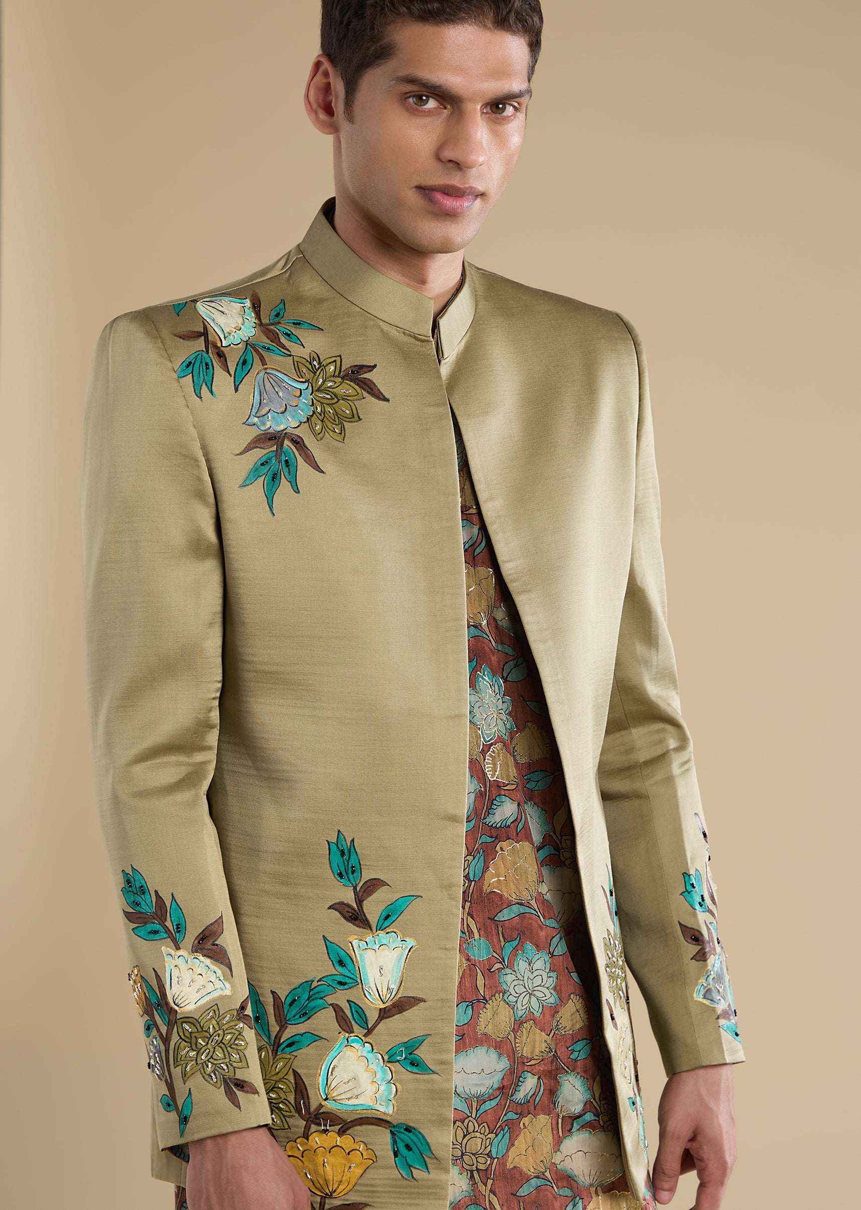 Classic and festive with a refined traditional touch, this green Jodhpuri set is crafted in a silk–linen blend for a rich yet breathable feel. Featuring a mandarin collar, full sleeves, and side slits, the silhouette is elevated with elegant hand-printed motif detailing that adds depth and character. Paired with straight-fit trousers, this ensemble is ideal for mehendi, engagement, and sangeet celebrations—perfect for groomsmen and groom’s brothers seeking timeless sophistication. Awarded as the Most Trusted Brand, we're delivering styles you love, just as promised.