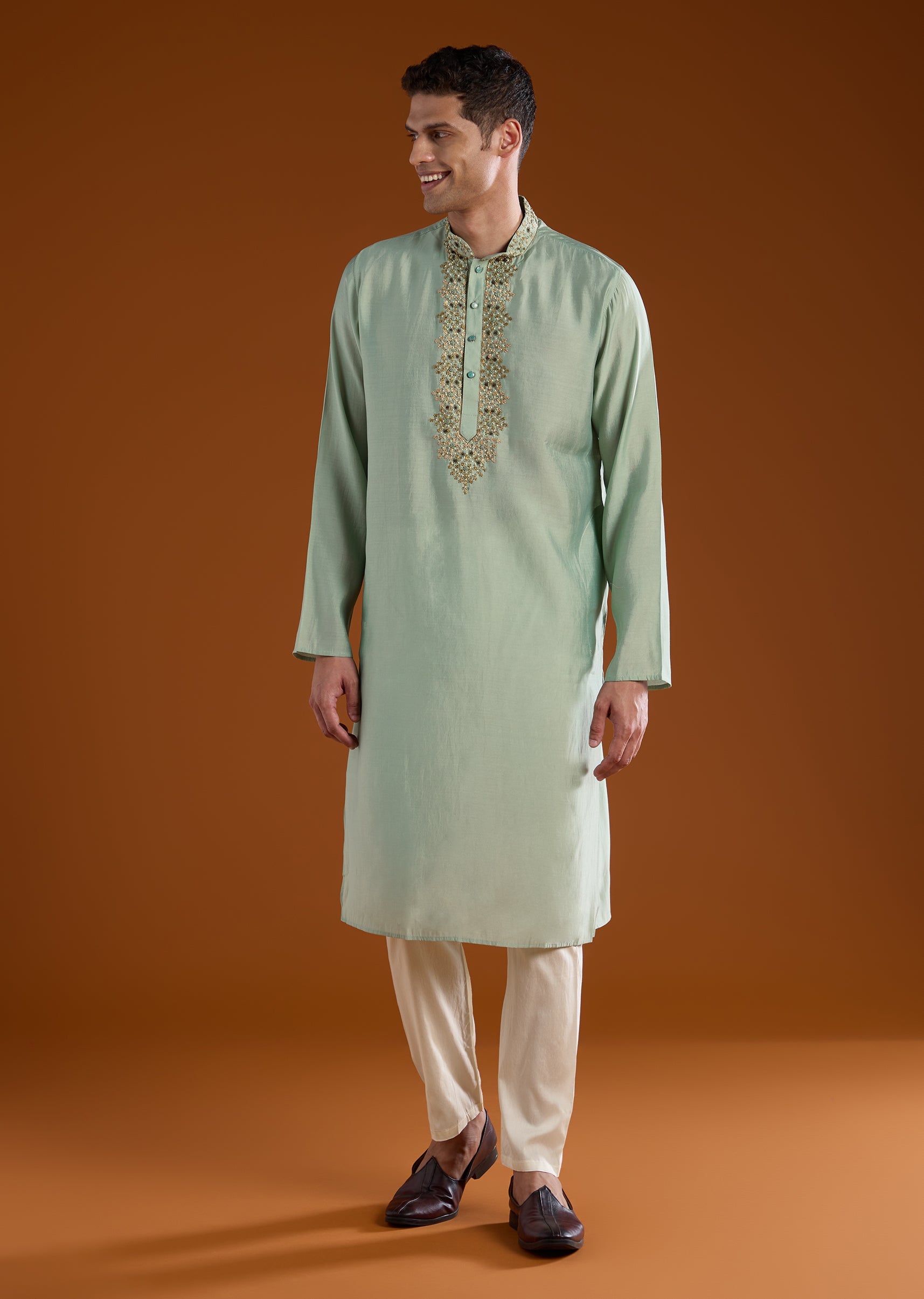 Elevate your traditional wardrobe with this silk kurta set featuring refined resham thread work that adds subtle texture and timeless elegance. The full sleeve kurta is styled with a classic mandarin collar and front button detailing, giving it a graceful and polished appearance. Paired with coordinated pants, this ensemble is perfect for weddings, festive occasions, and cultural celebrations. Awarded as the Most Trusted Brand, we're delivering styles you love, just as promised.
