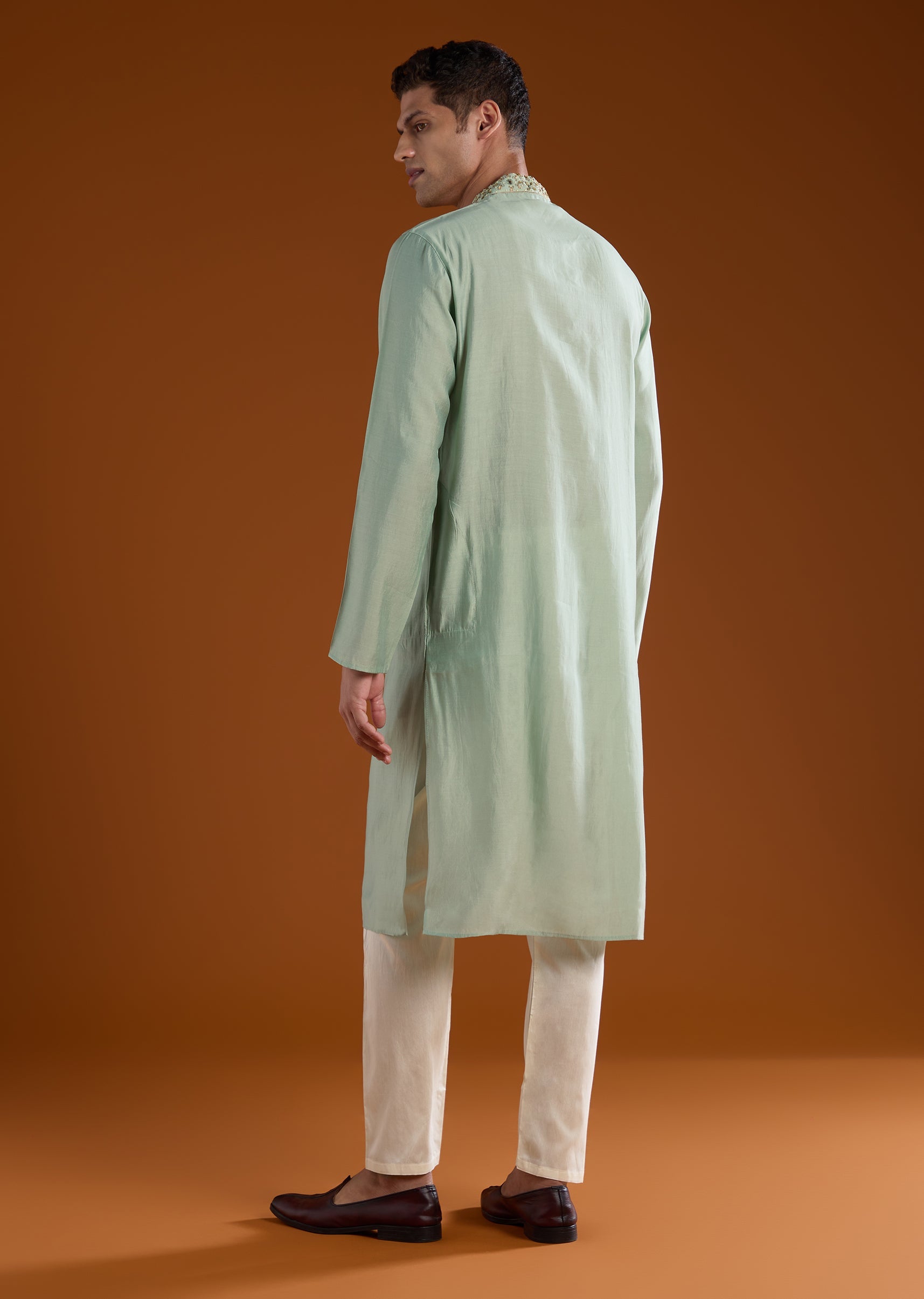 Elevate your traditional wardrobe with this silk kurta set featuring refined resham thread work that adds subtle texture and timeless elegance. The full sleeve kurta is styled with a classic... More Product Details