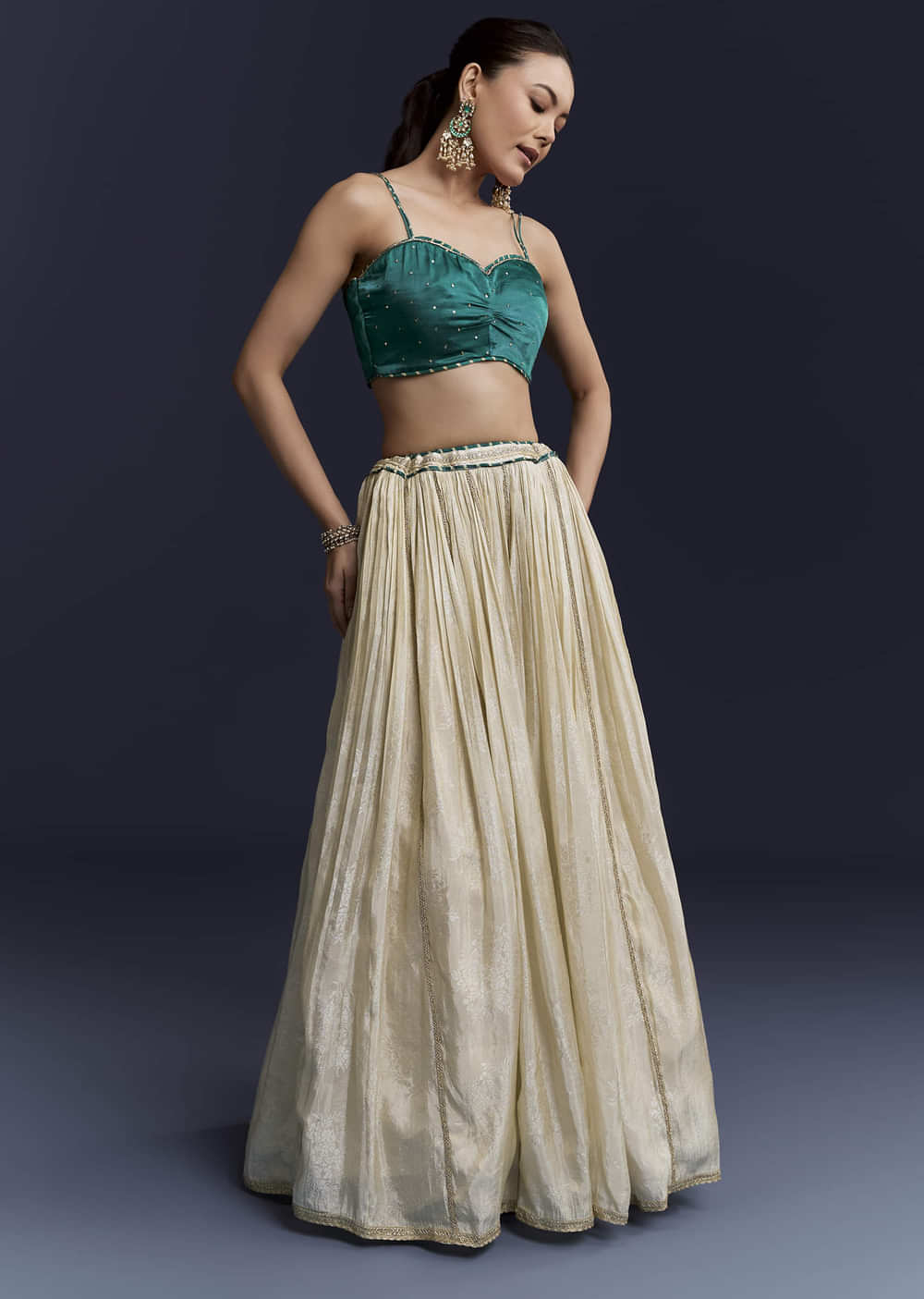 Lush and refined, this green and cream satin festive lehenga offers a smooth base that flatters in photographs. The hand-dyed chevron jacket is finished with sequins and cut dana for... More Product Details