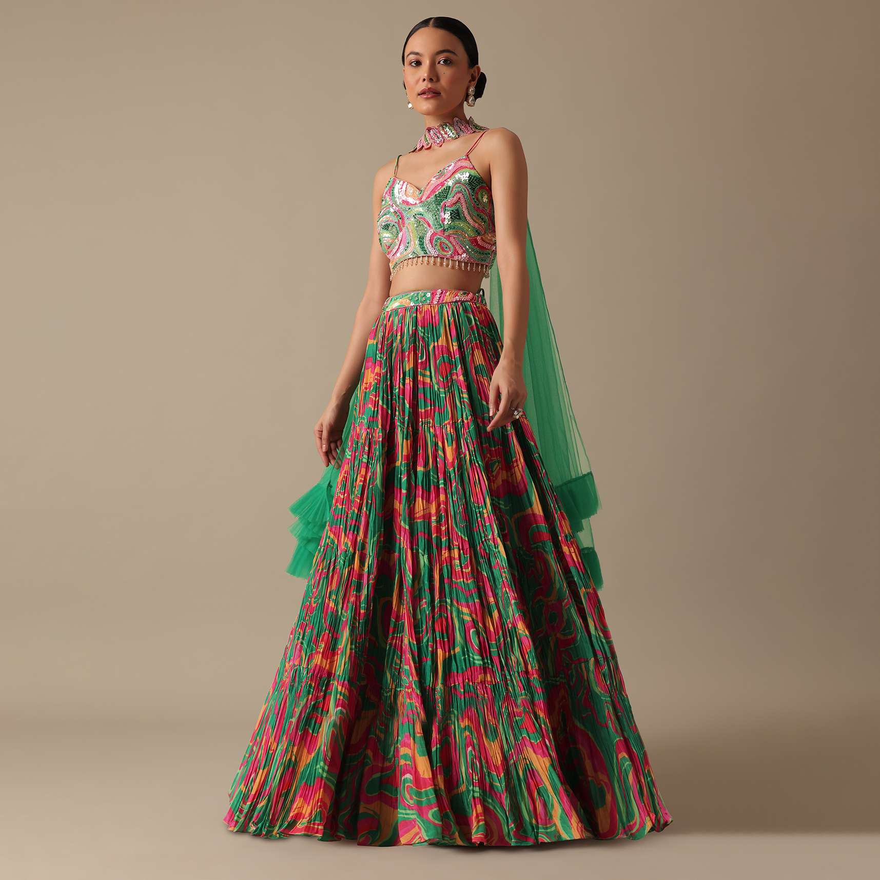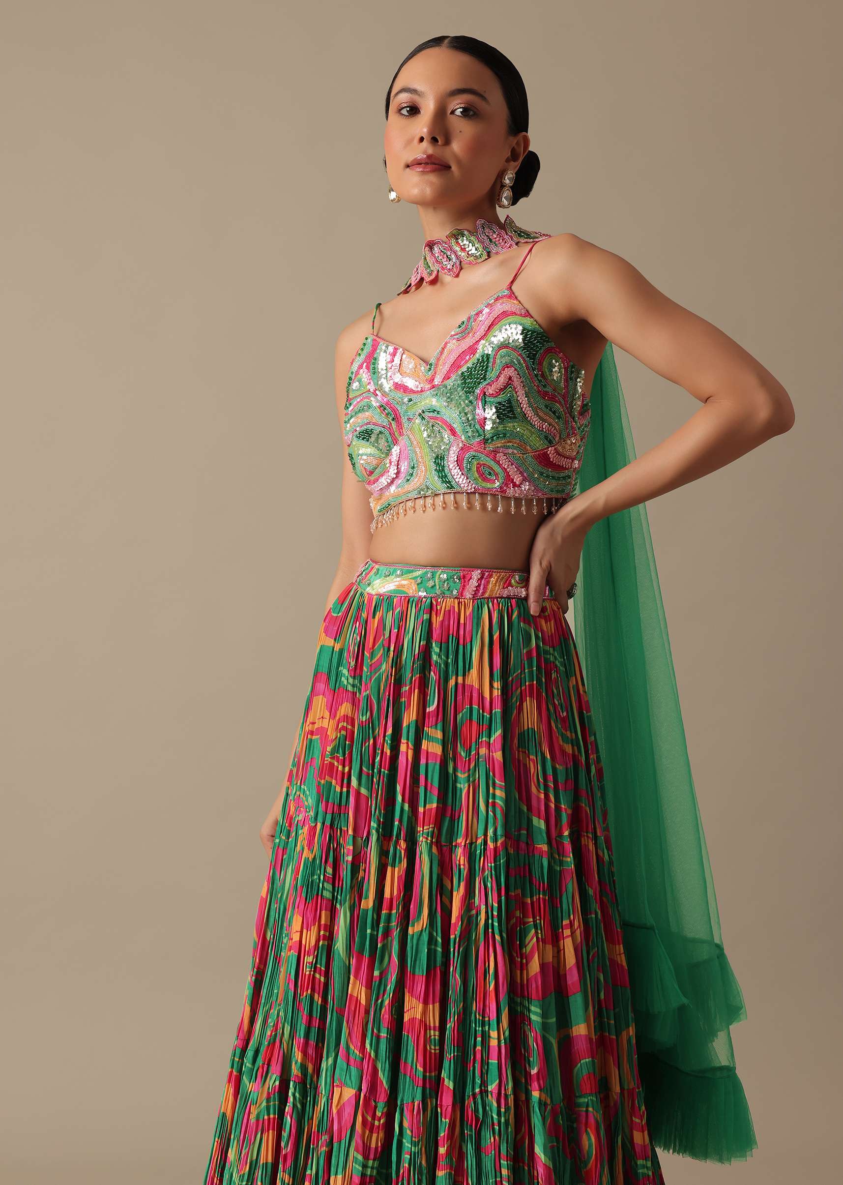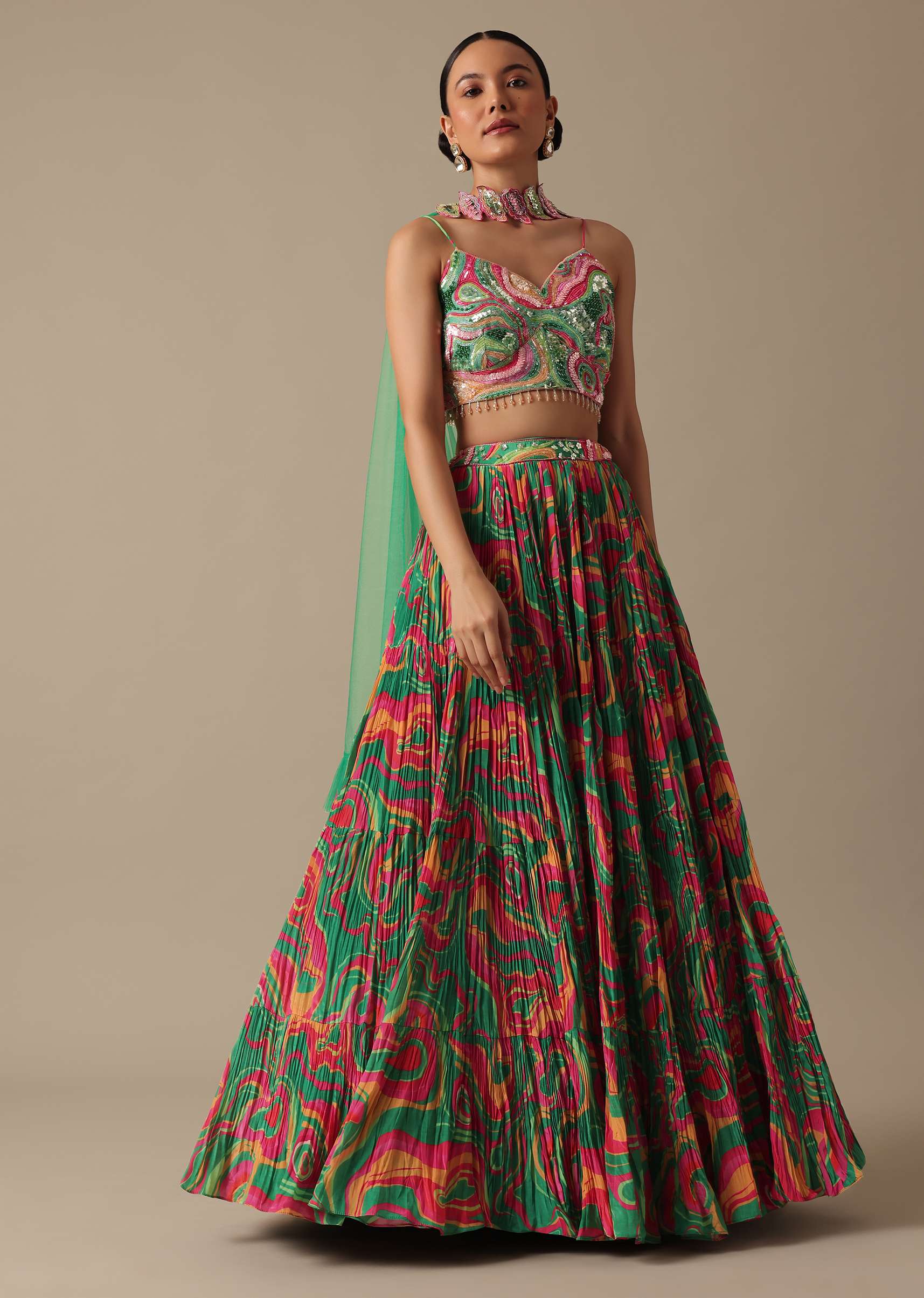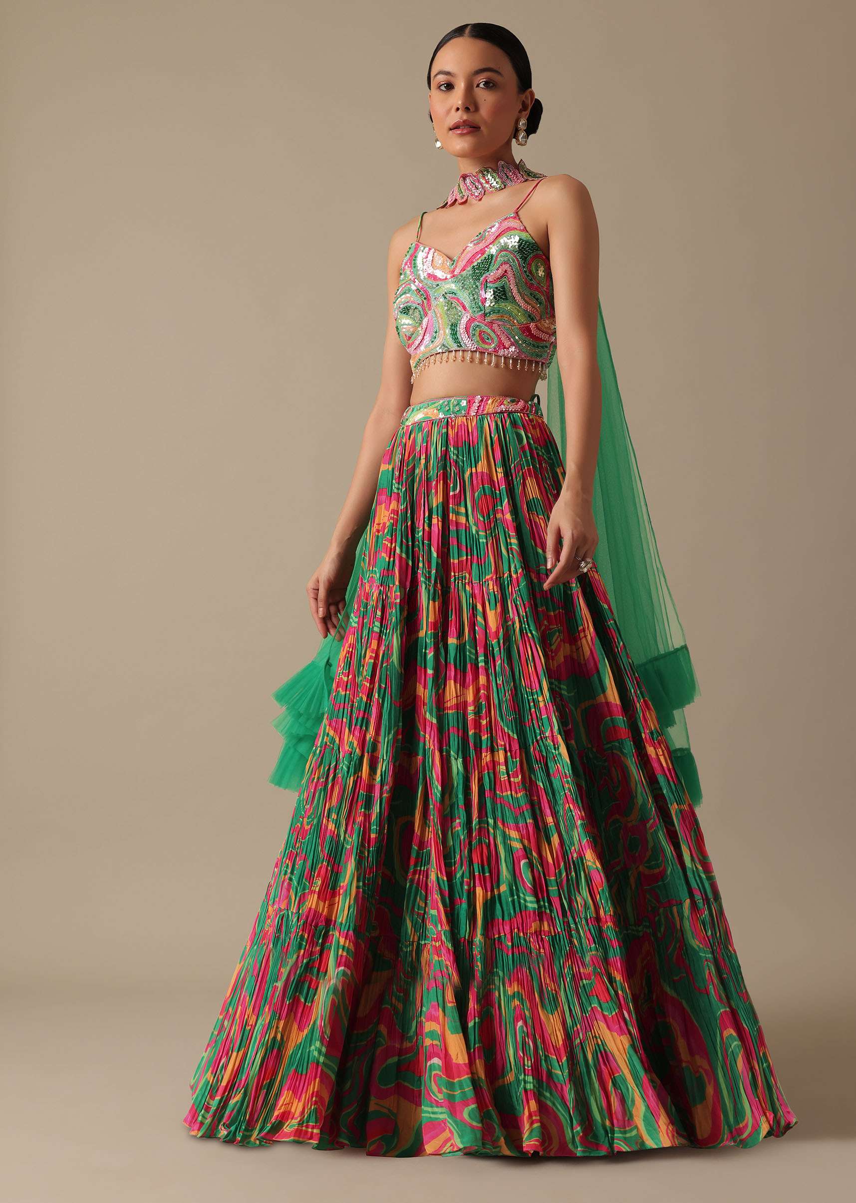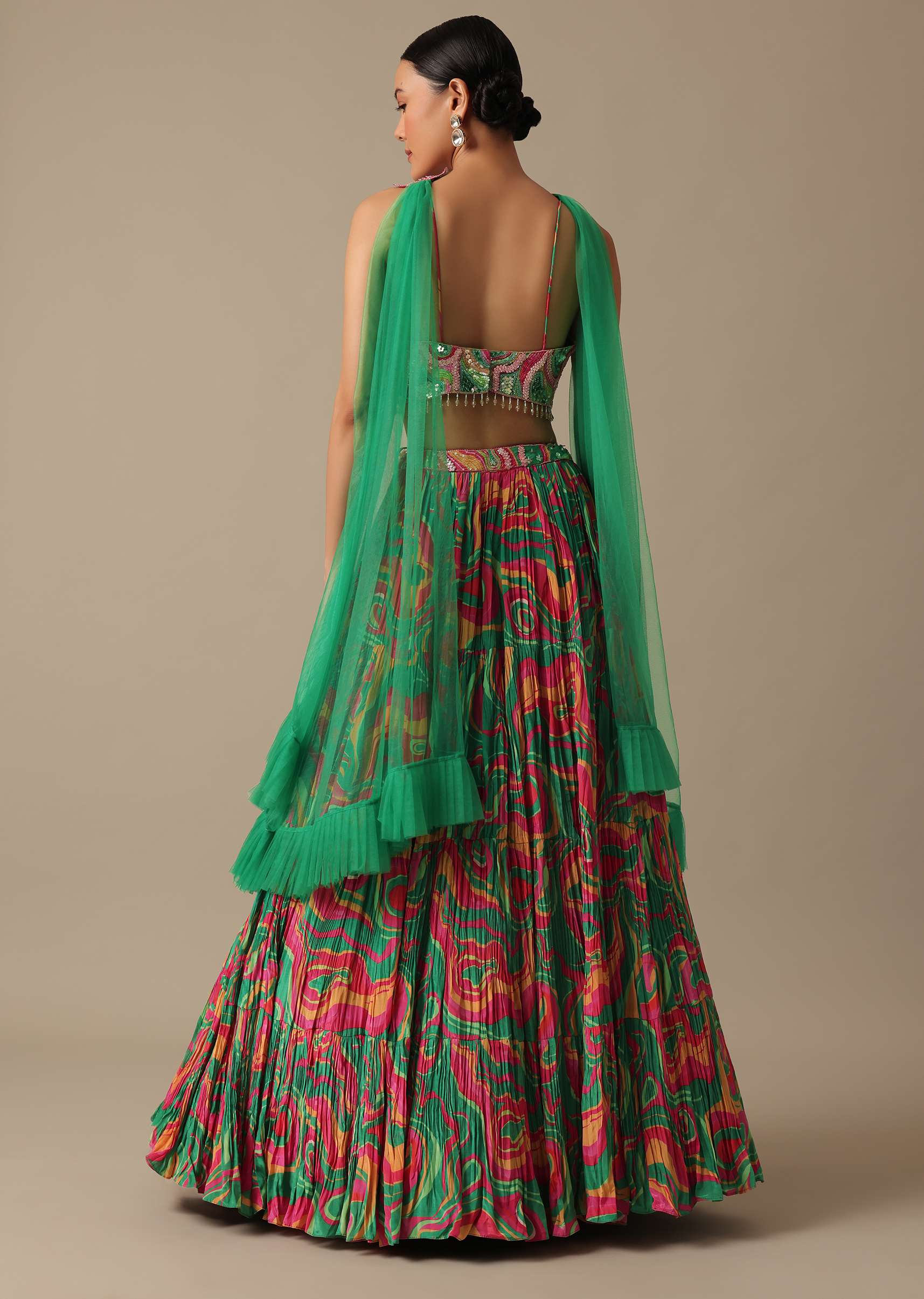 - Crafted from luxe satin and decked on an evergreen hue this lehenga comes with stunning printed motifs.