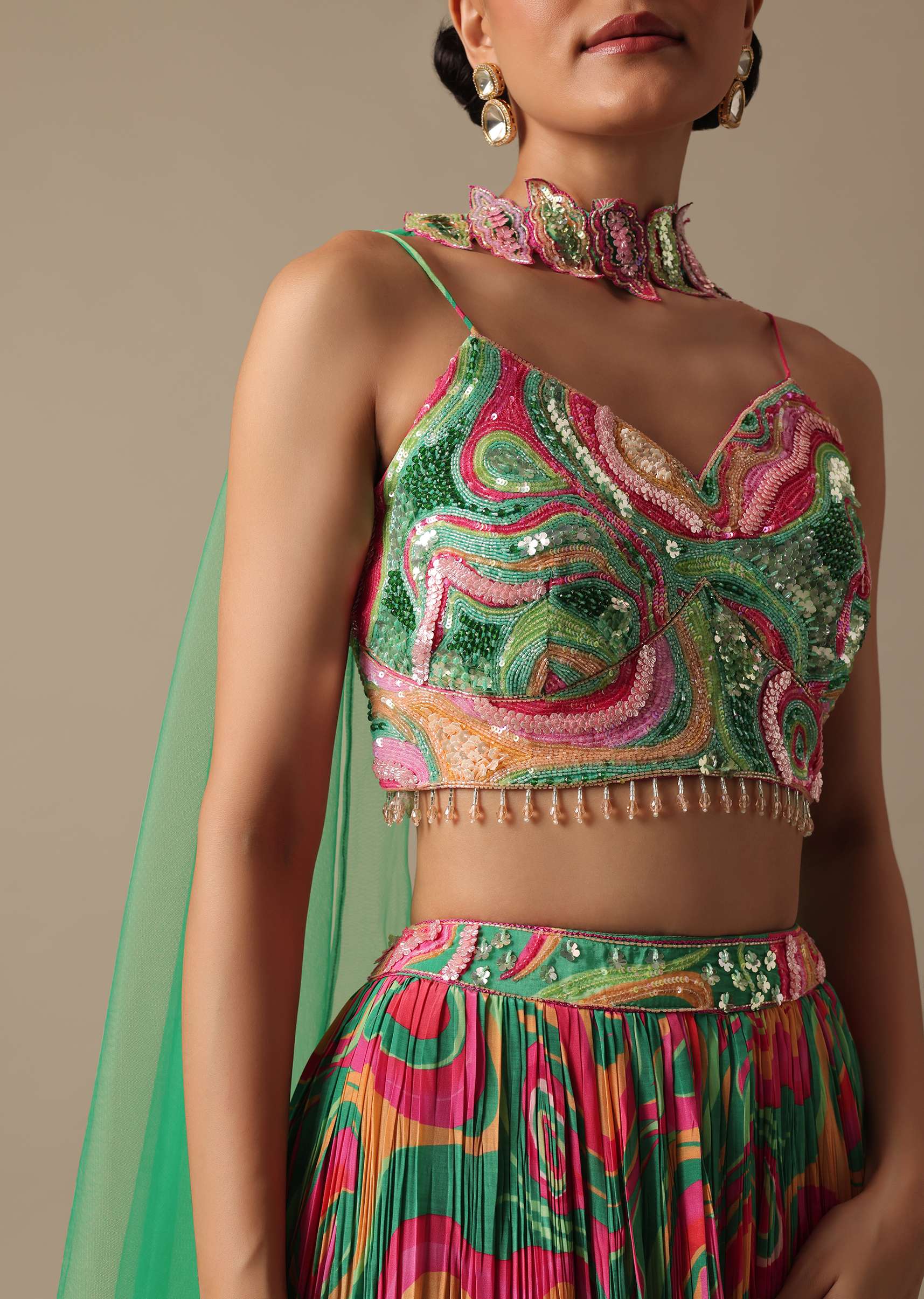 - The sleeveless blouse is accentuated with sequin cutdana and 3D floral work.