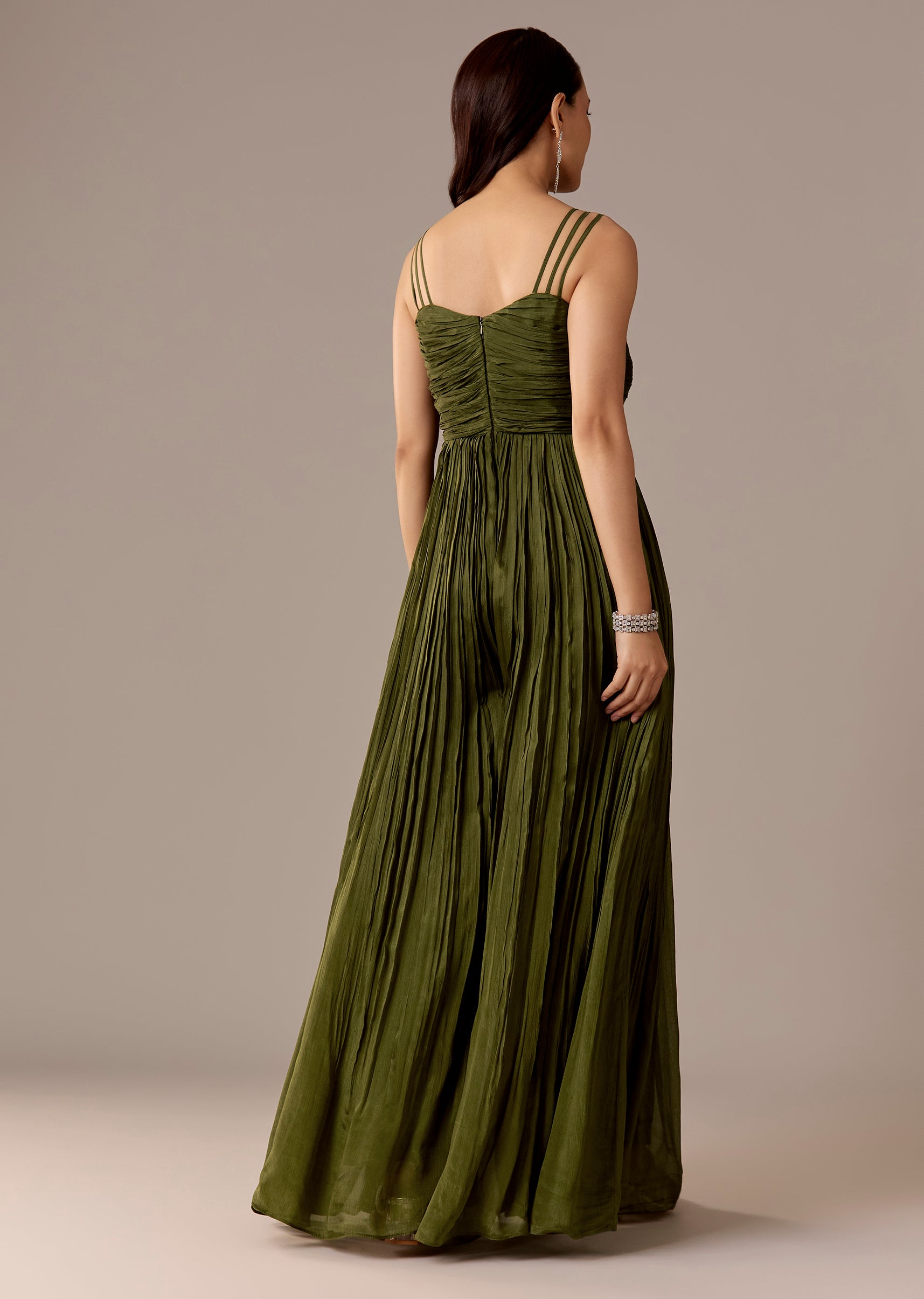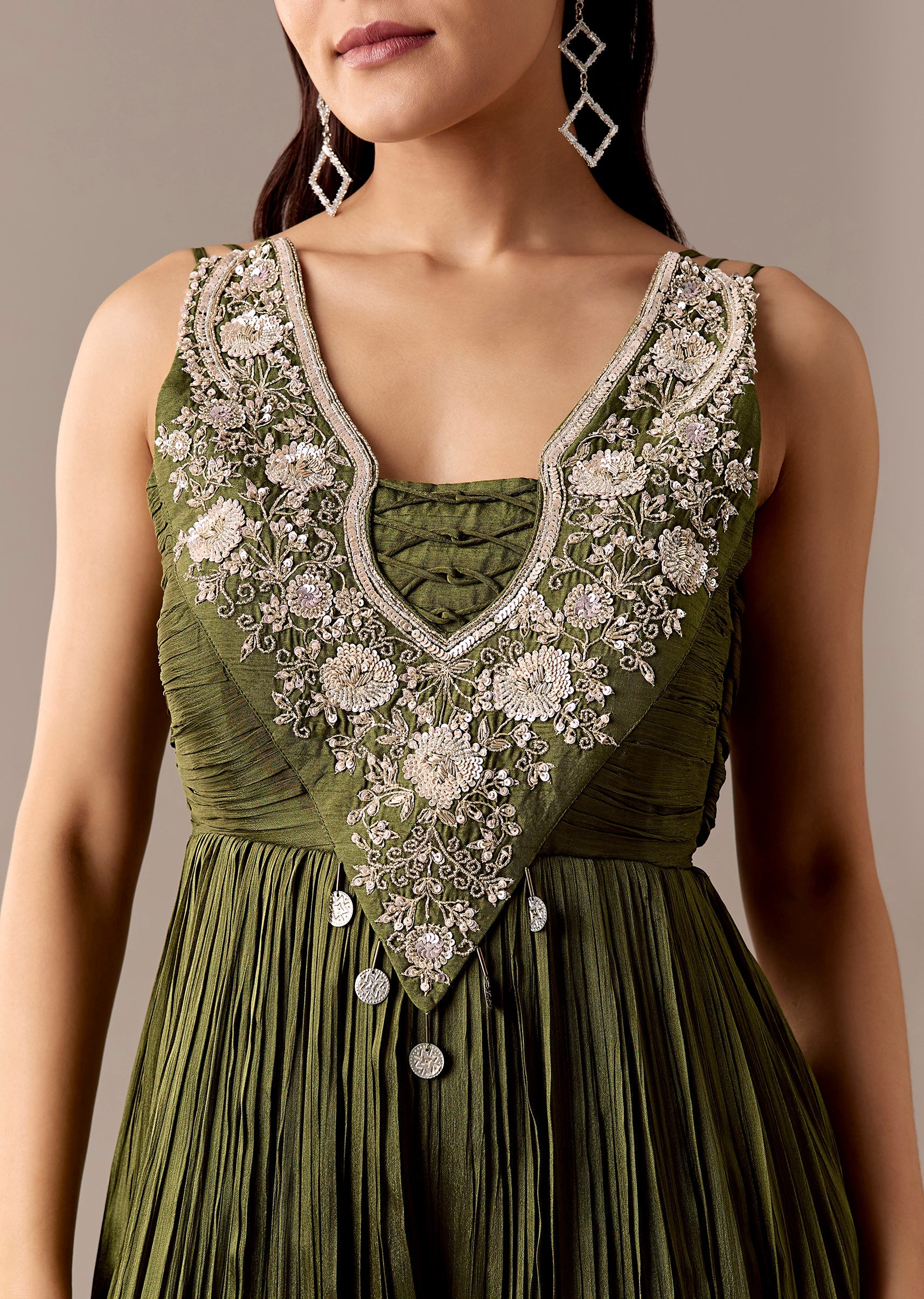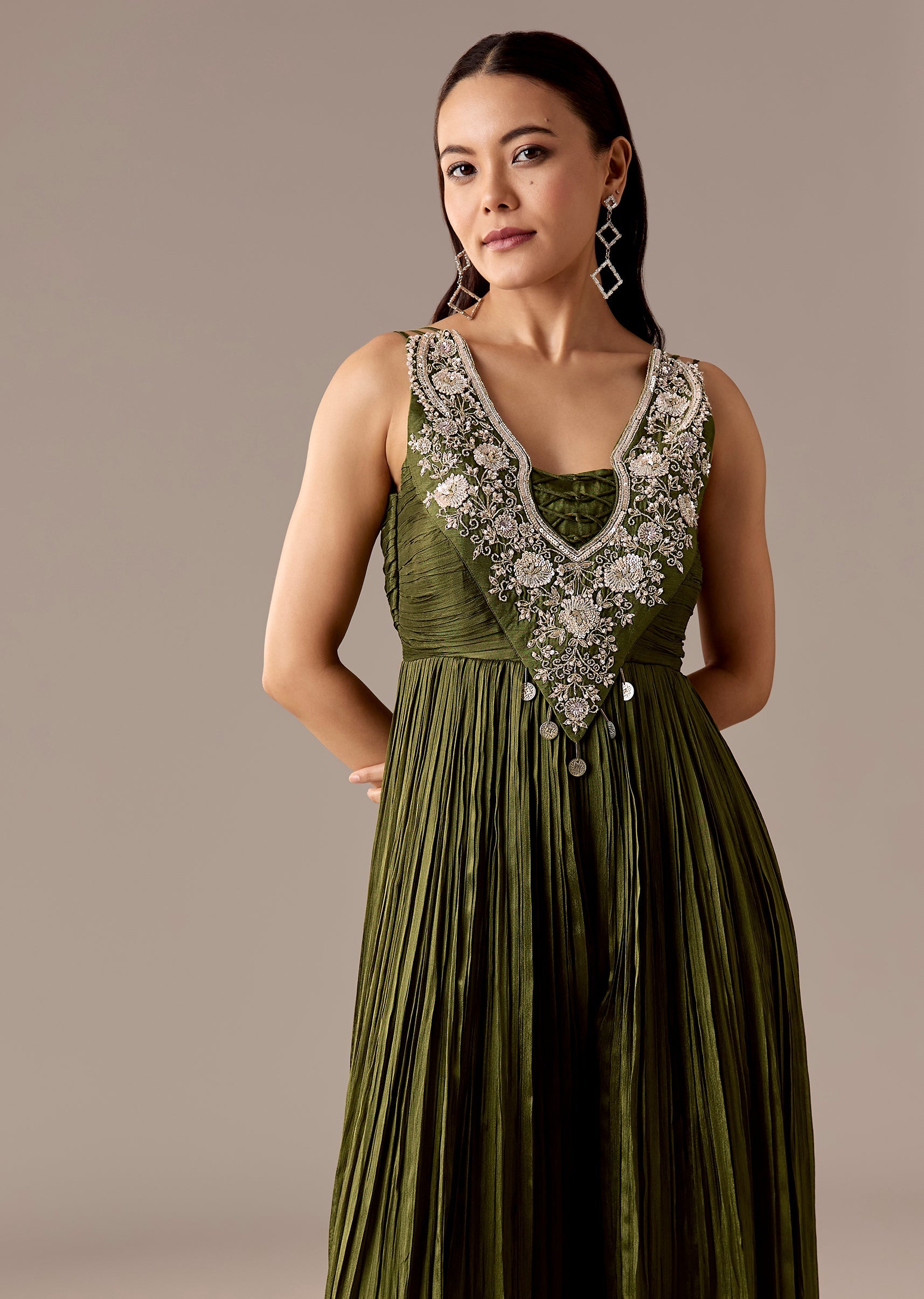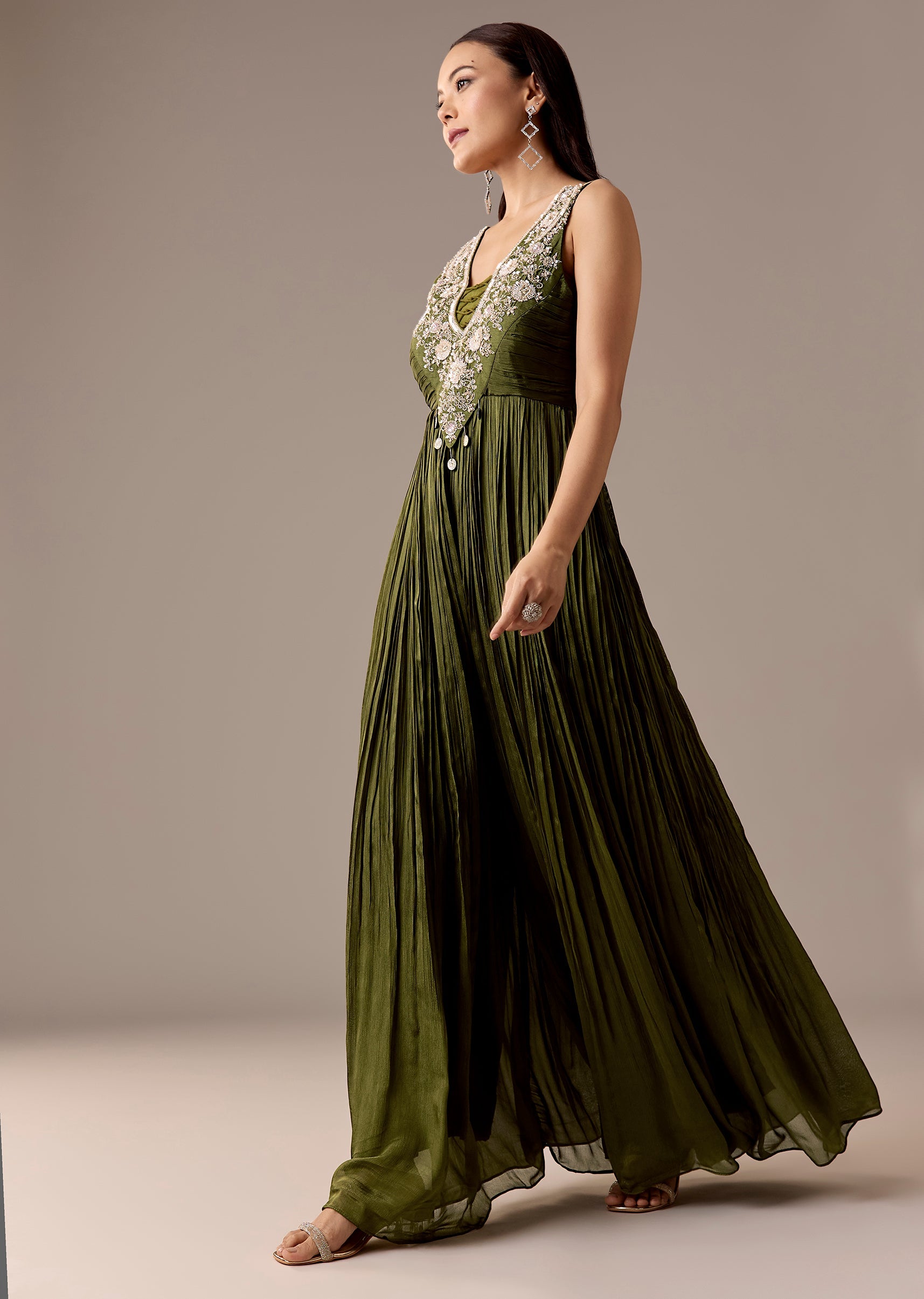 A mehendi-green chinon jumpsuit with sequins and bead embroidery, styled with a sleeveless V-neck and back zip closure. Floor-length with a flared finish—ideal for bridesmaids and festive evenings.Awarded as the... More Product Details