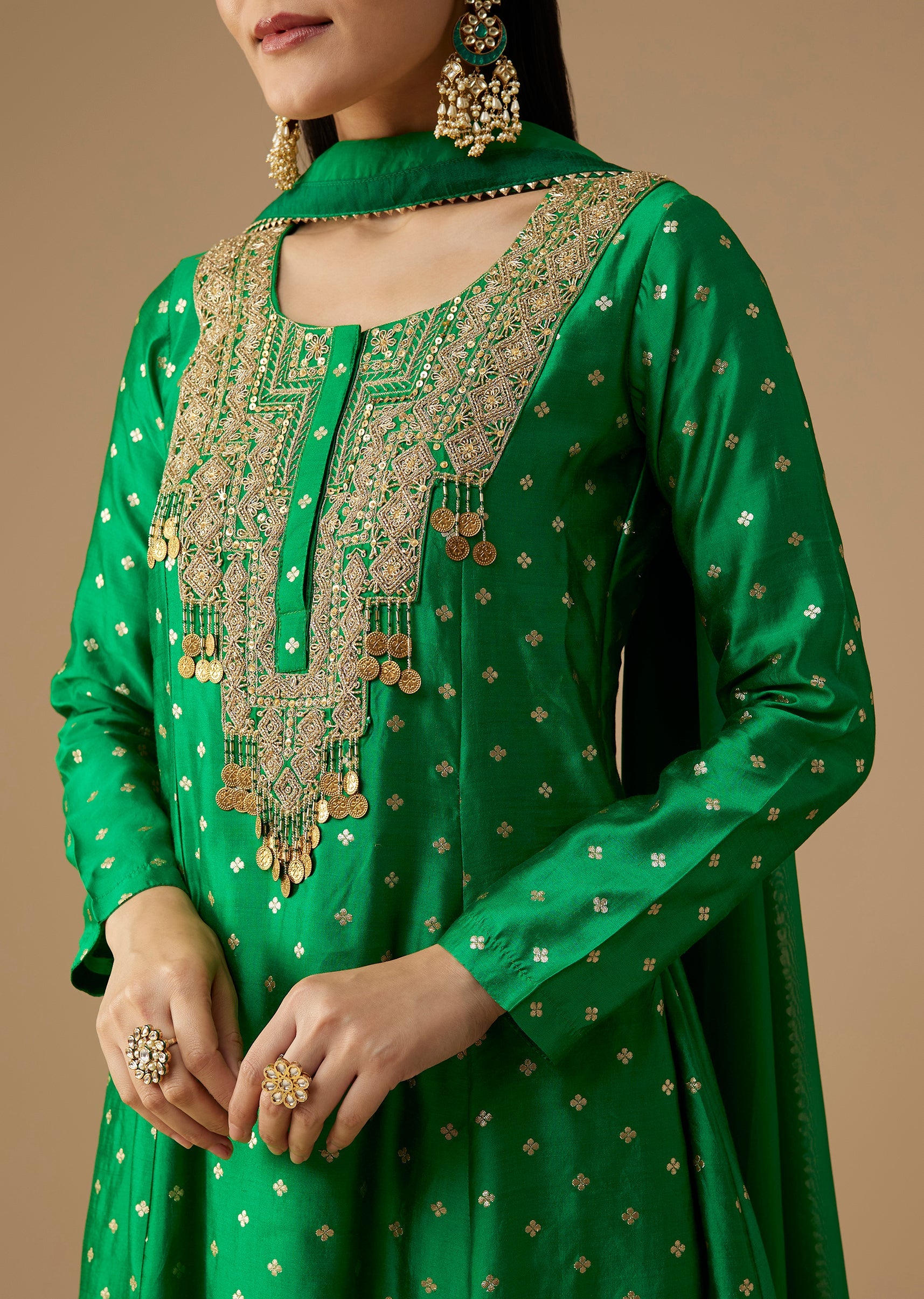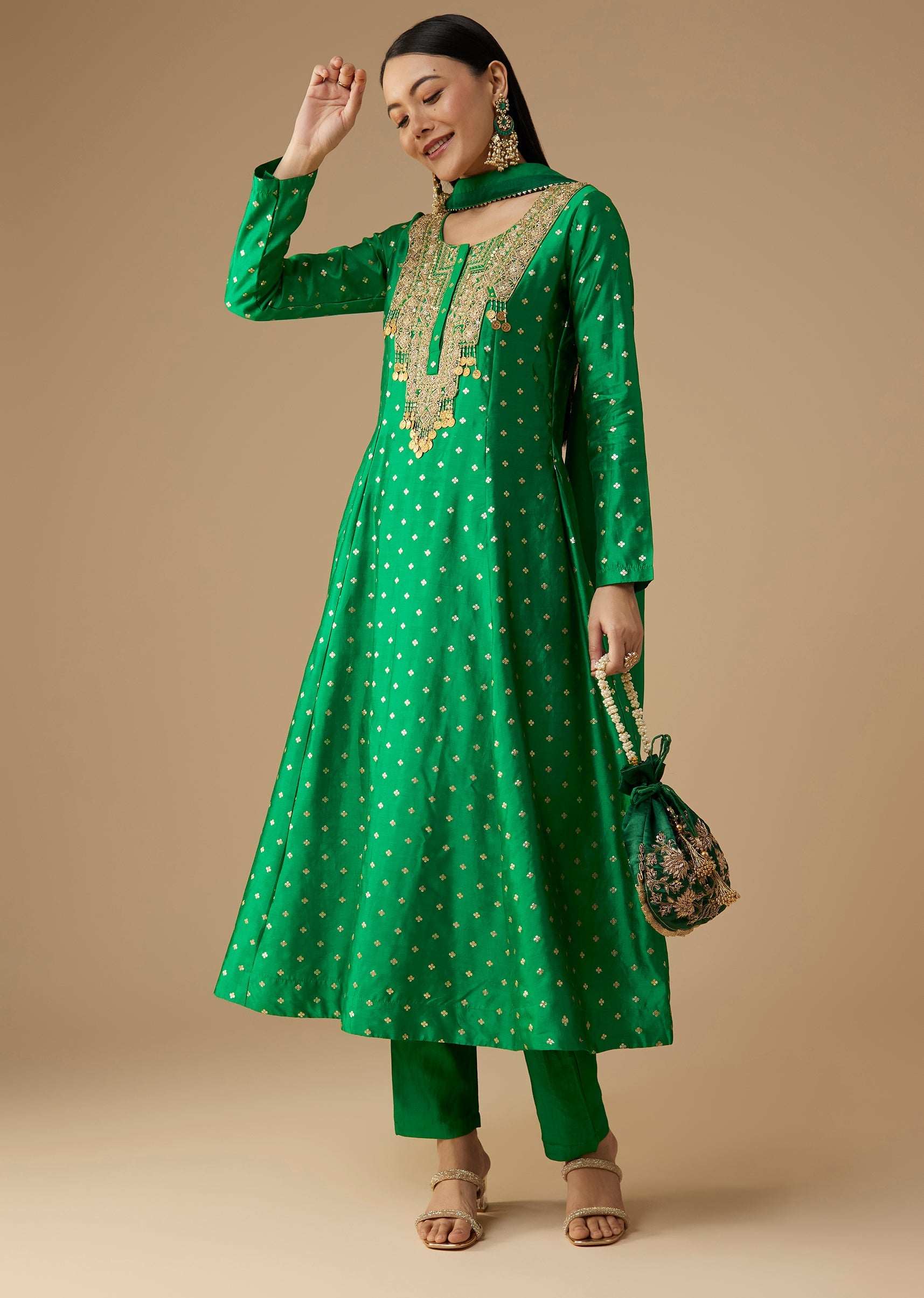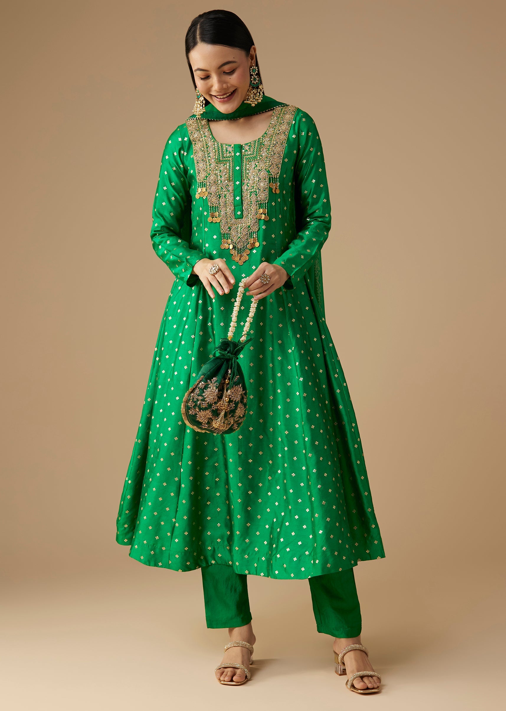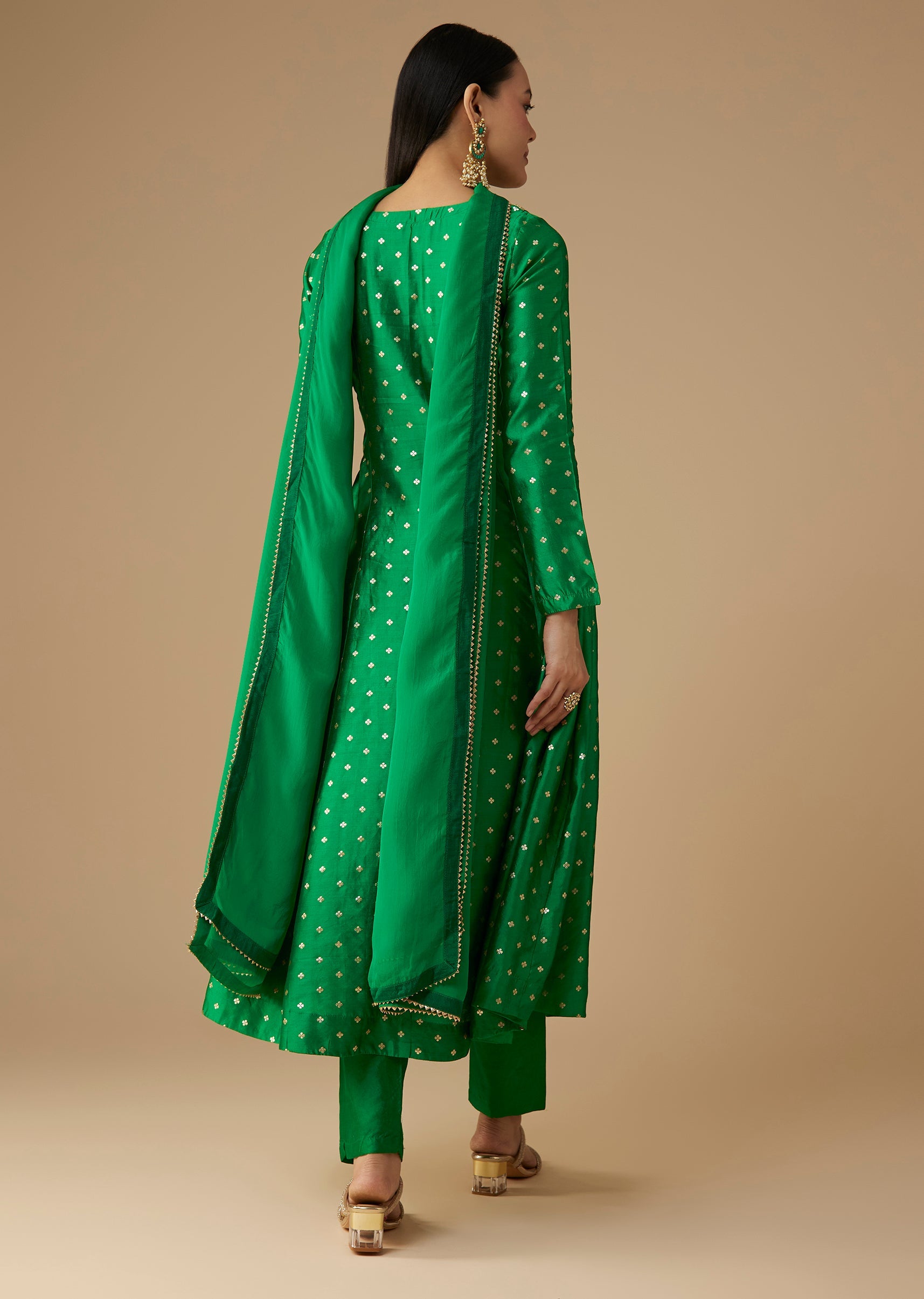Step into refined elegance with this green silk anarkali set, featuring delicate butti work enhanced with cutdana and zari detailing for a subtle yet festive shimmer. The flowing anarkali paired... More Product Details