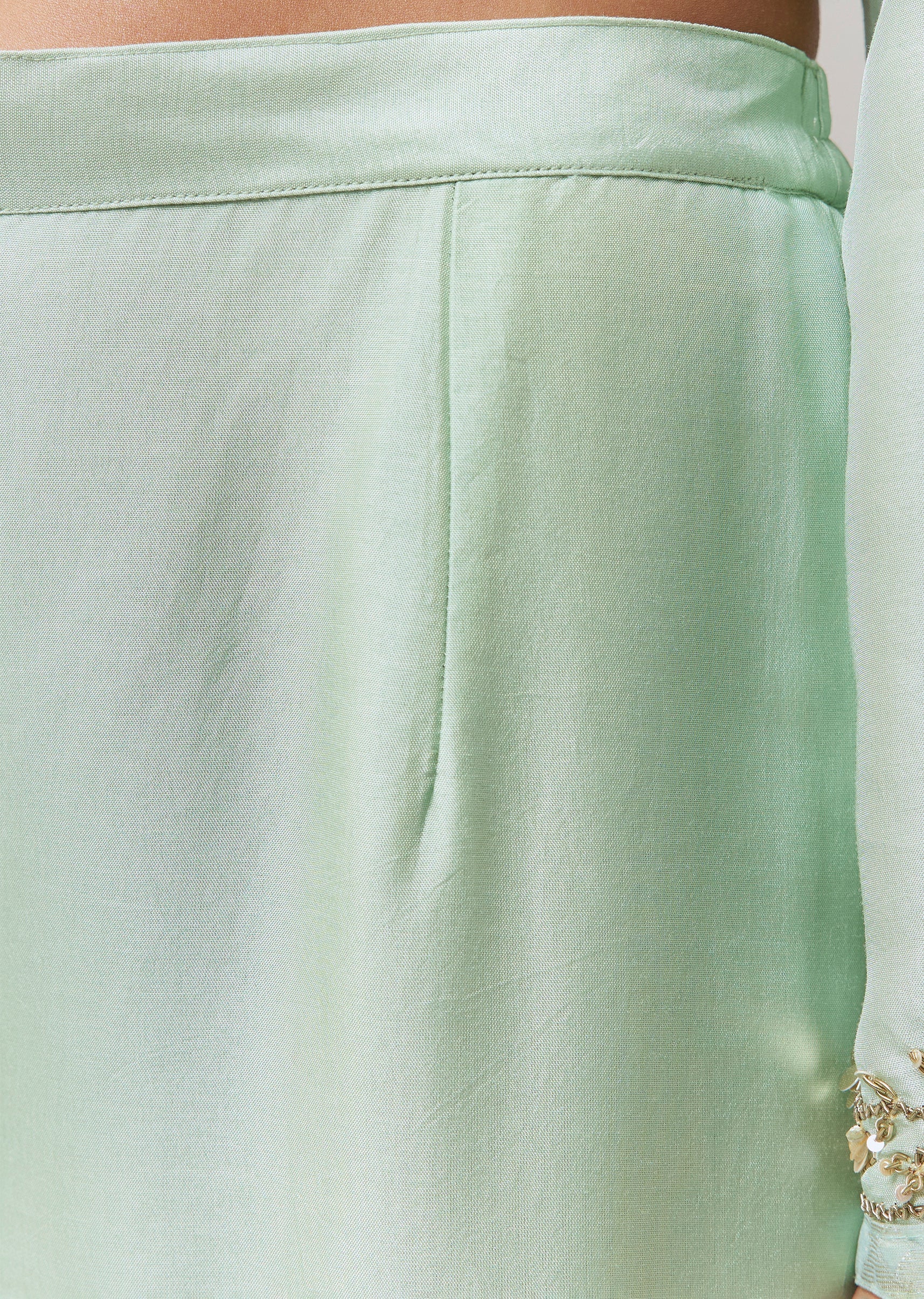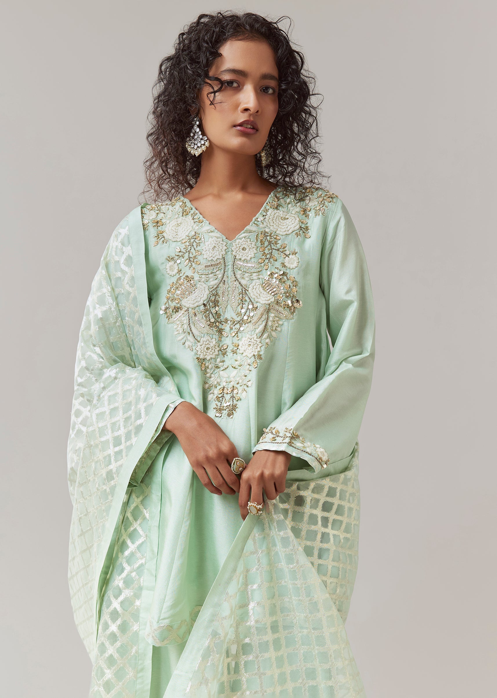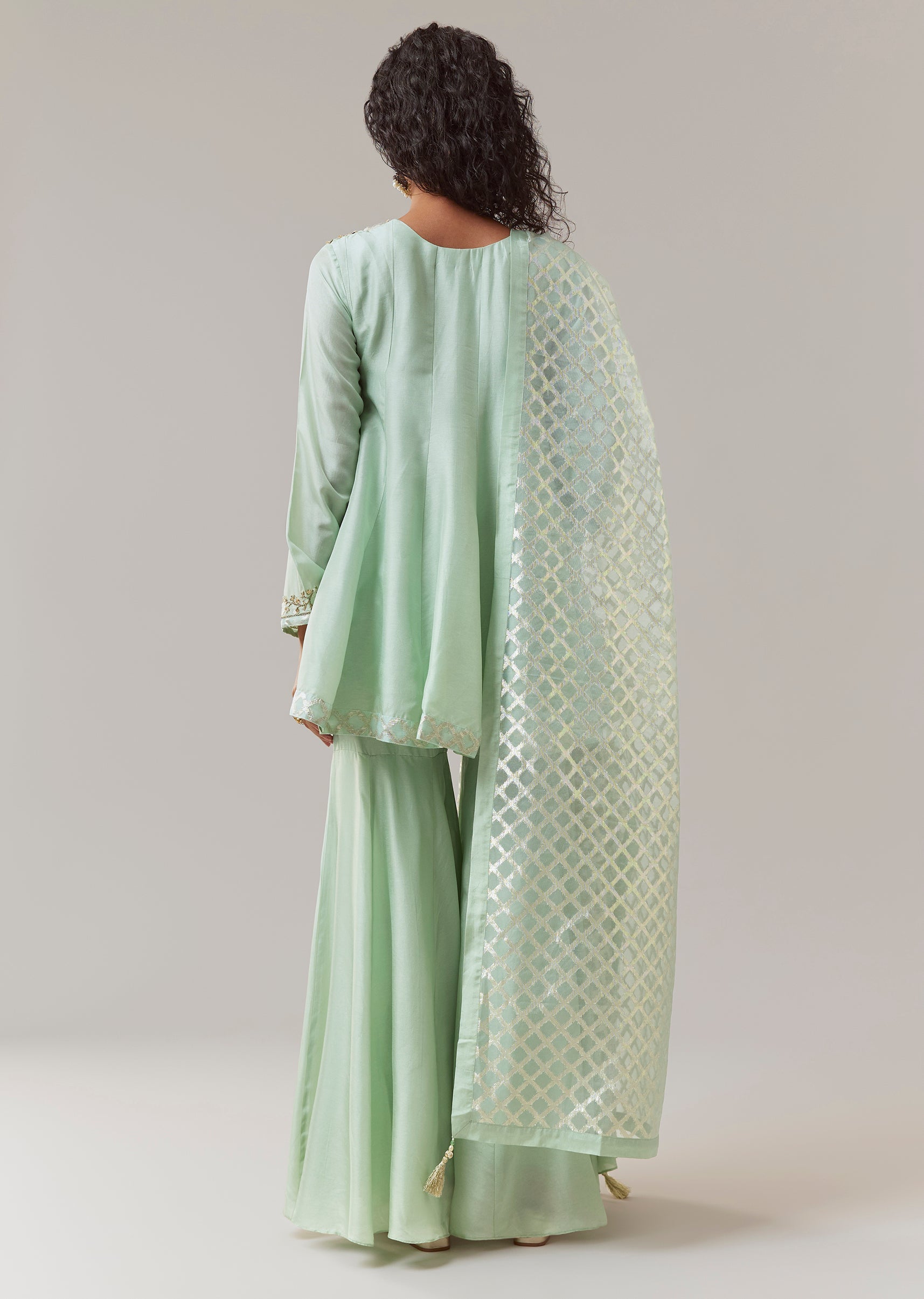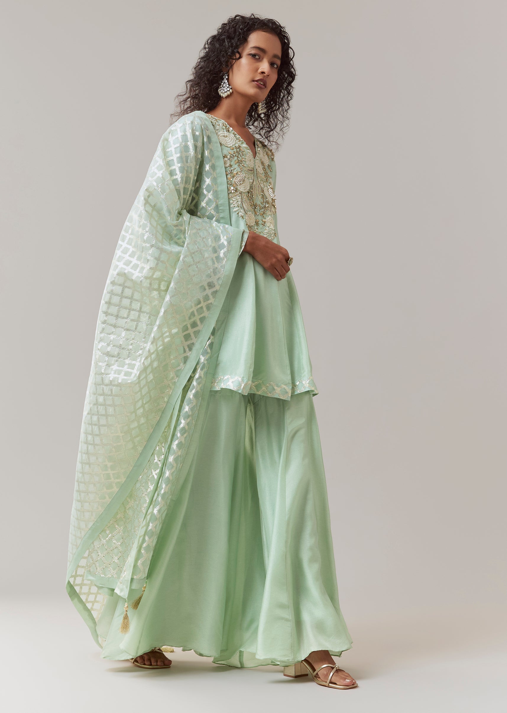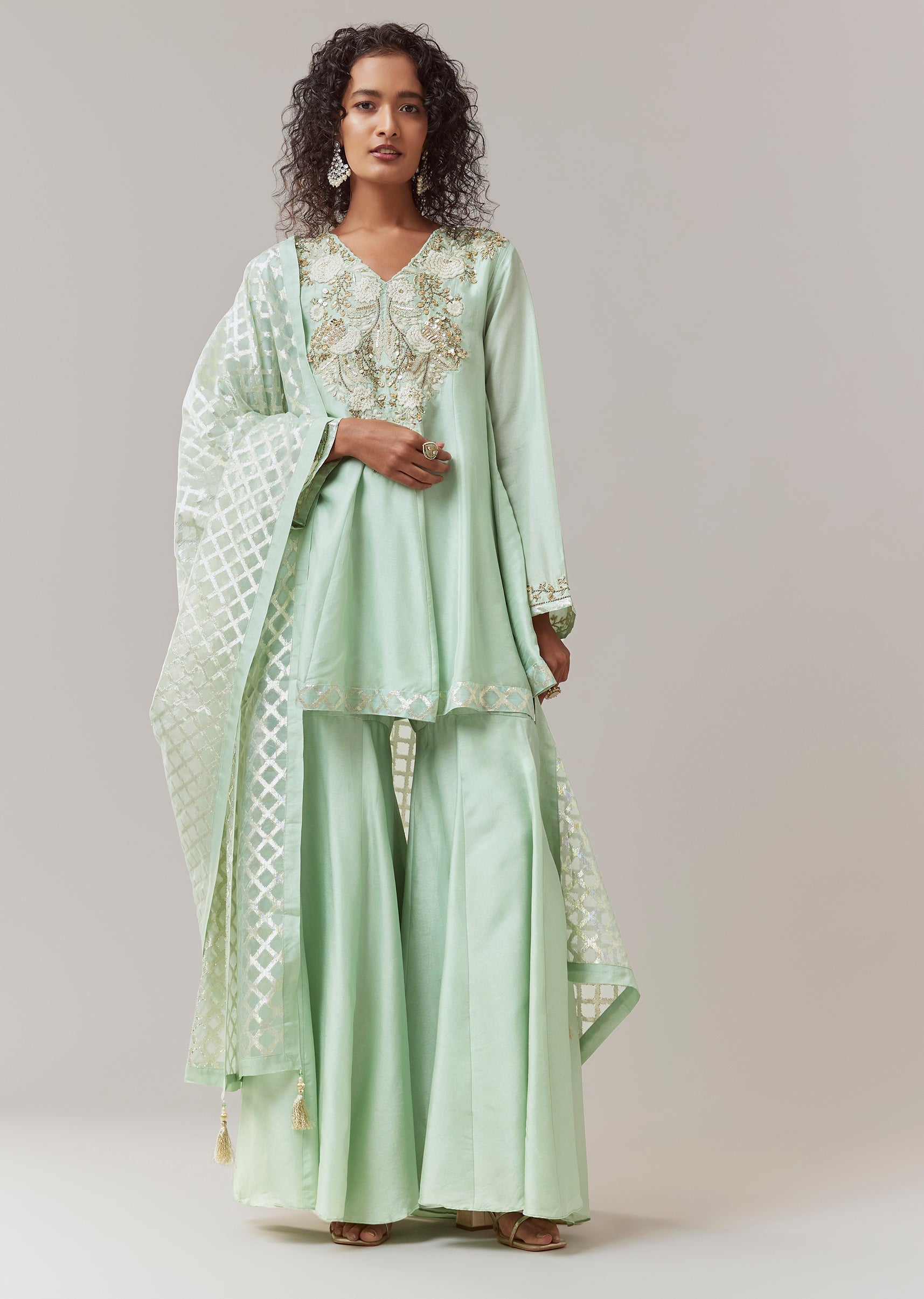 The stitched kurta offers a structured yet comfortable fit, while the flared sharara provides ease of movement and a graceful fall.