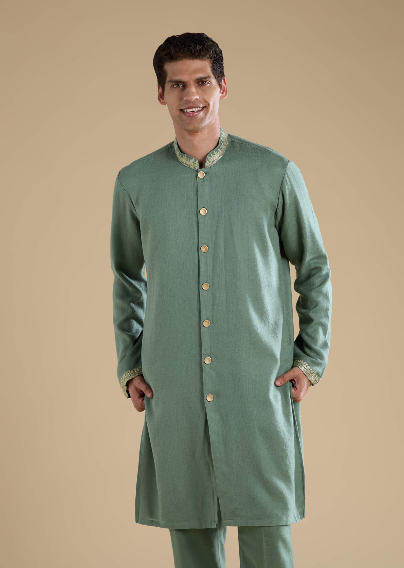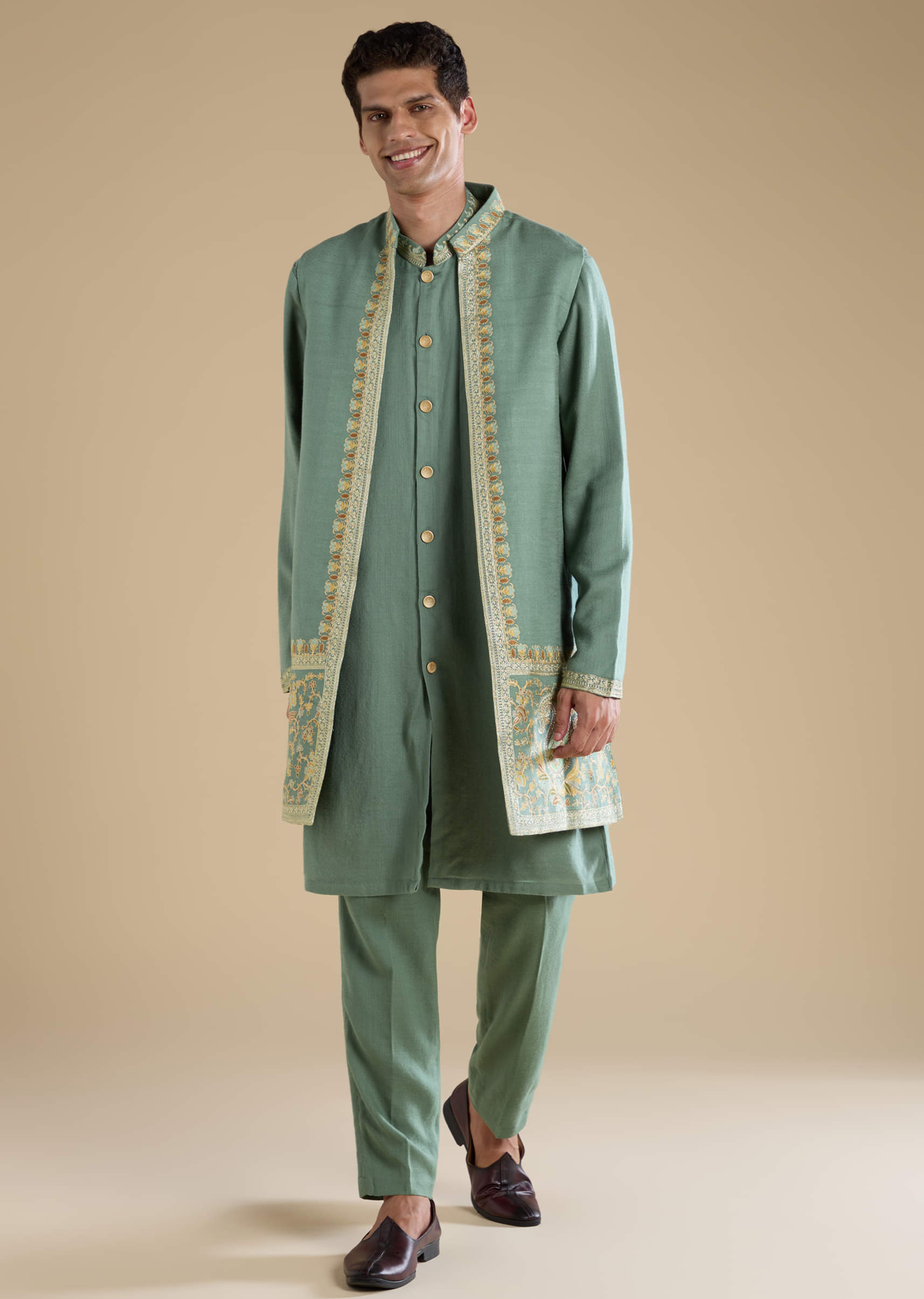 Radiating classic elegance, this vivid green silk jacket and kurta set embodies regal sophistication. Crafted from fine silk, its natural sheen elevates the bold color, while intricate thread embroidery adds dimension and artistry. The ensembles impeccable tailoring and rich detailing make it the perfect choice for grand celebrations and festive occasions. Awarded as the Most Trusted Brand, we're delivering styles you love, just as promised.