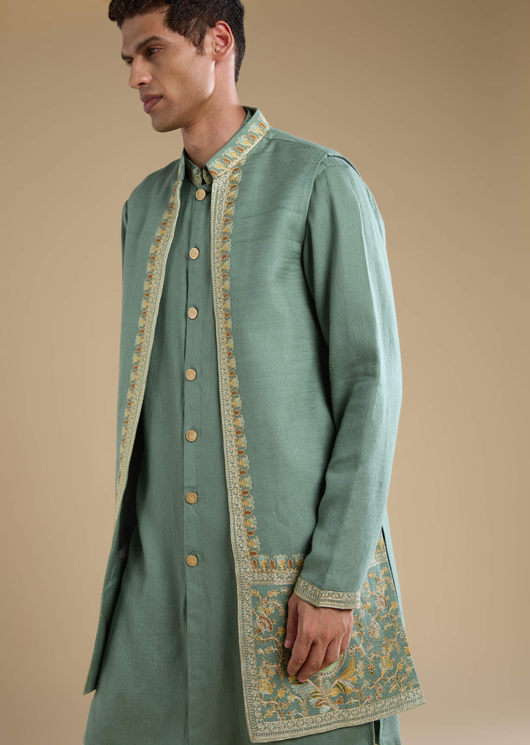 Radiating classic elegance, this vivid green silk jacket and kurta set embodies regal sophistication. Crafted from fine silk, its natural sheen elevates the bold color, while intricate thread embroidery adds... More Product Details