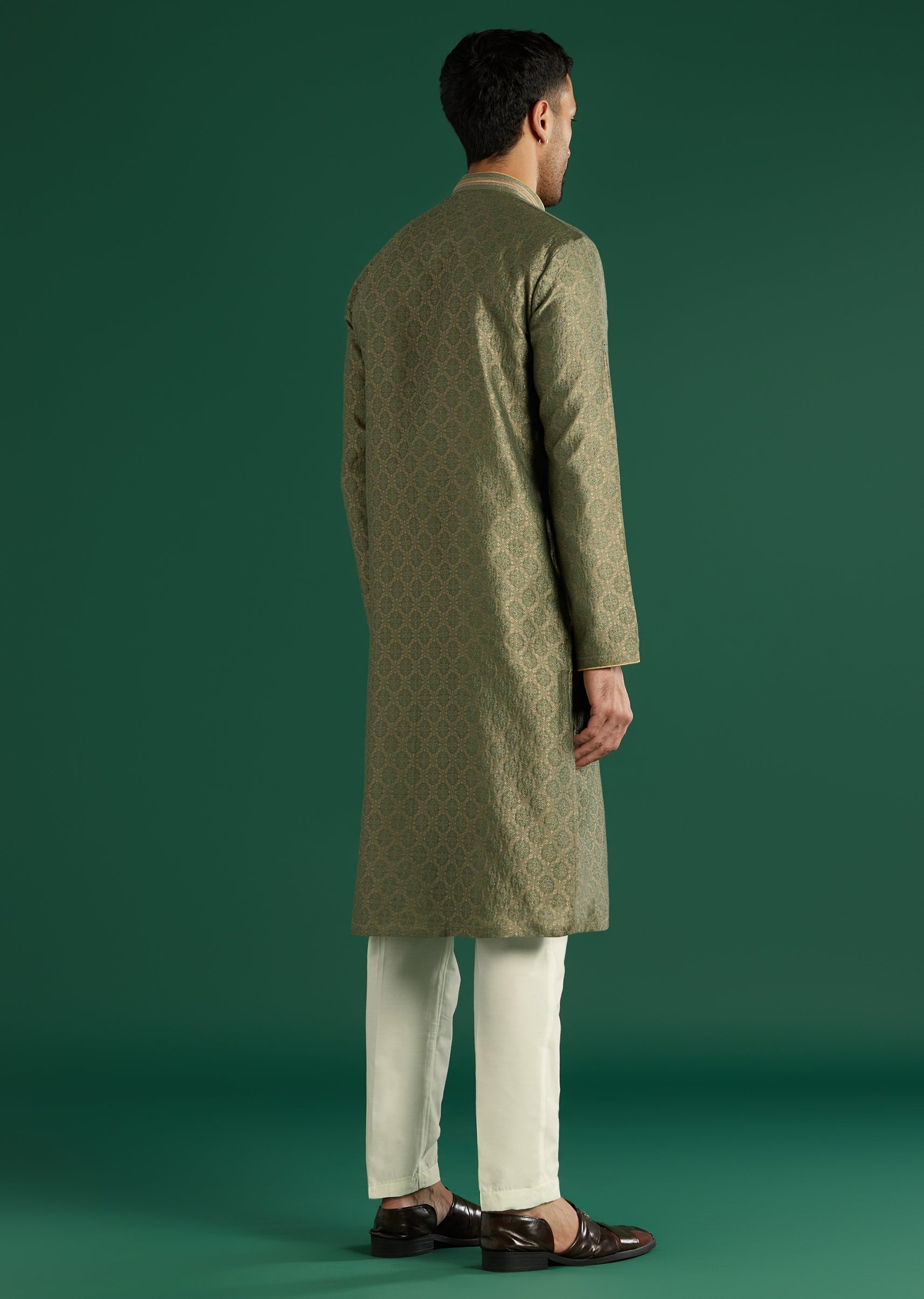 Regal texture defines this green art silk men’s kurta set woven in brocade with an all-over gold pattern. A high collar, concealed placket, and fine trim at the cuffs sharpen... More Product Details