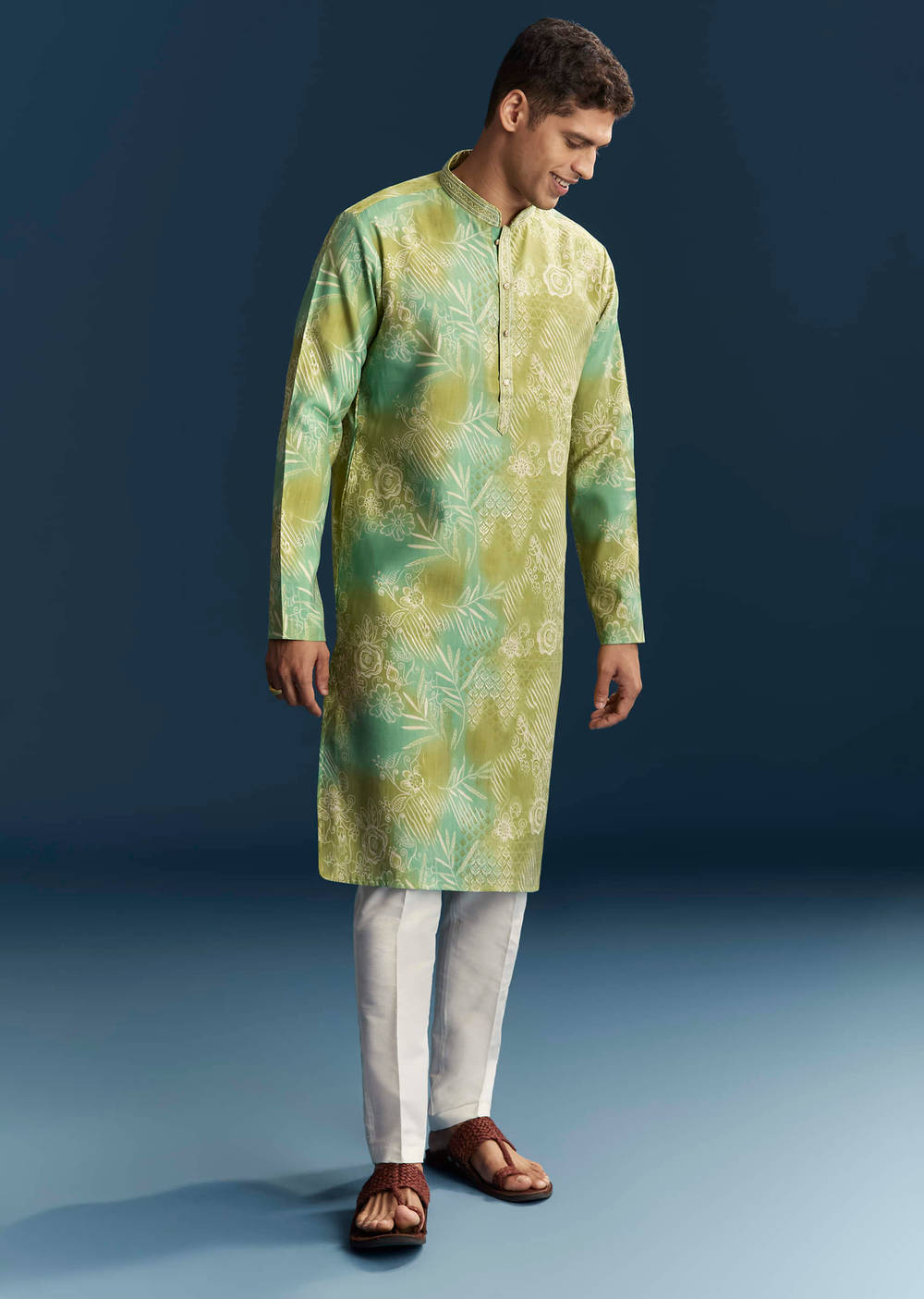 Playful pattern takes centre stage as this green cotton silk men’s kurta set with floral and abstract printed kurta paired with classic white alighadi moves through the day. The print mix adds rhythm without crowding the silhouette. You feel lively and at ease, perfect for pujas and cultural get-togethers. Awarded as the Most Trusted Brand, we're delivering styles you love, just as promised.