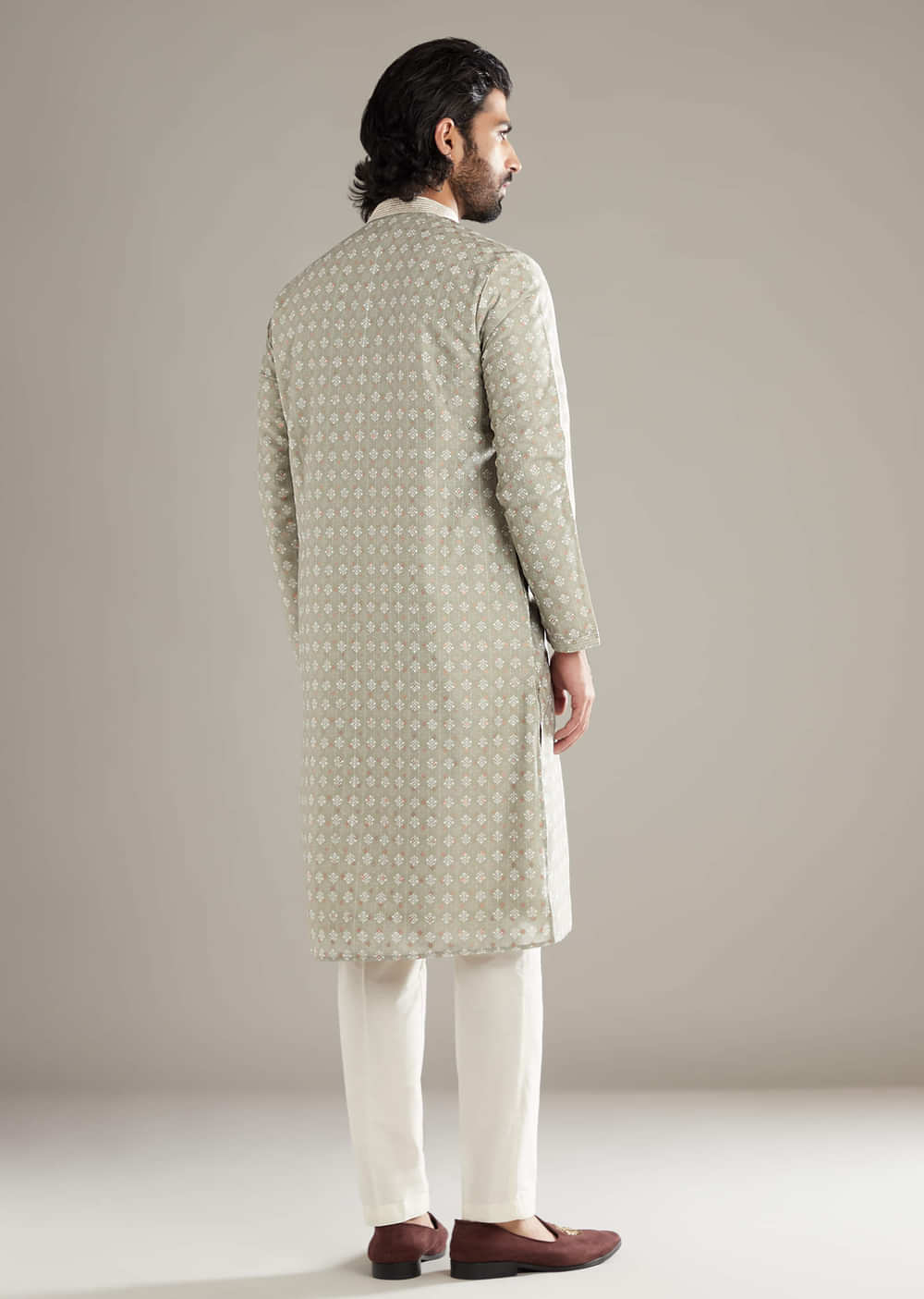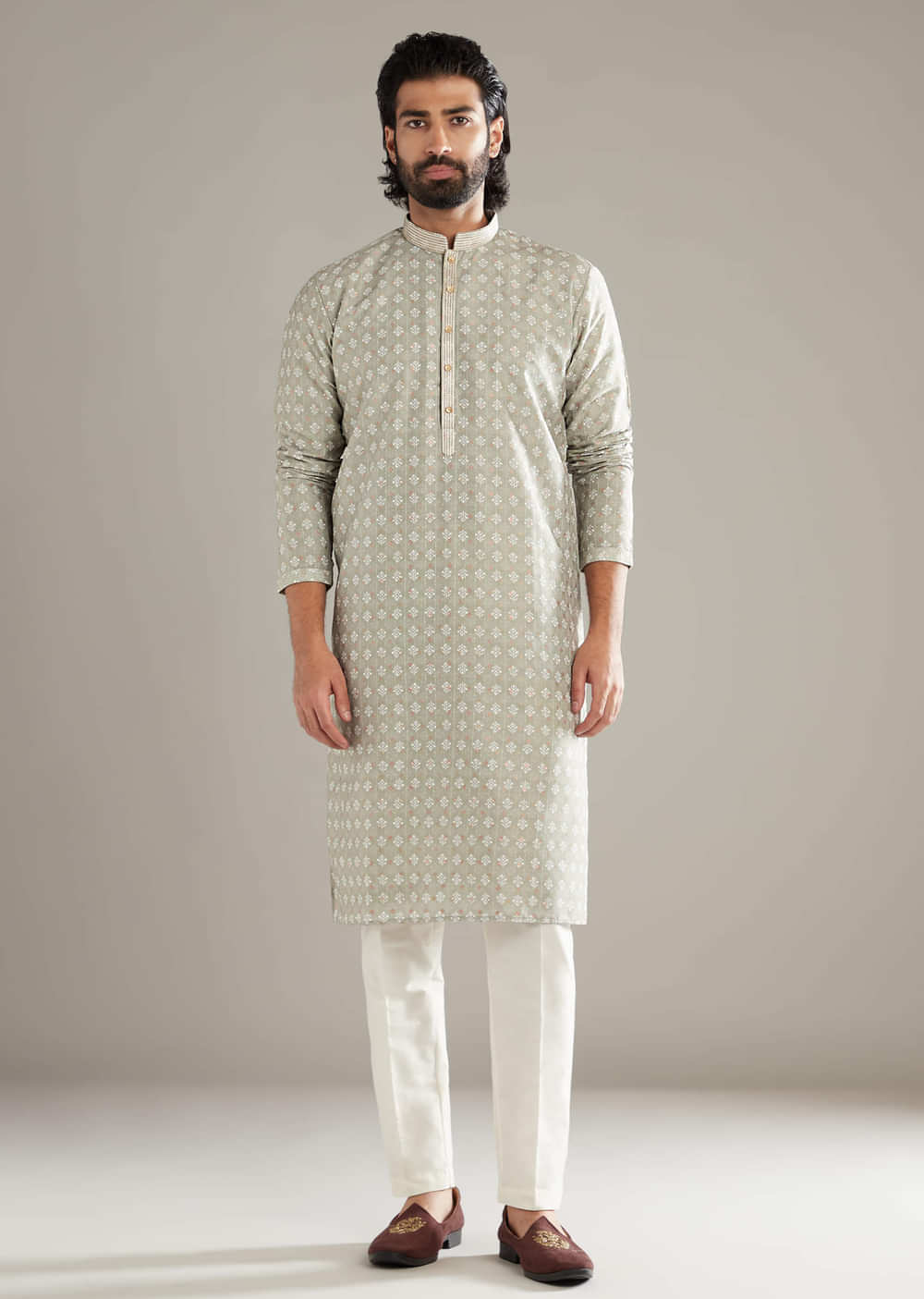 Fresh and versatile, this tea green art silk men’s kurta set carries printed motifs that sit cleanly on a smooth base. The tone feels calm yet festive-friendly. Reach for it... More Product Details