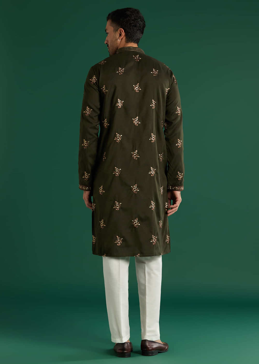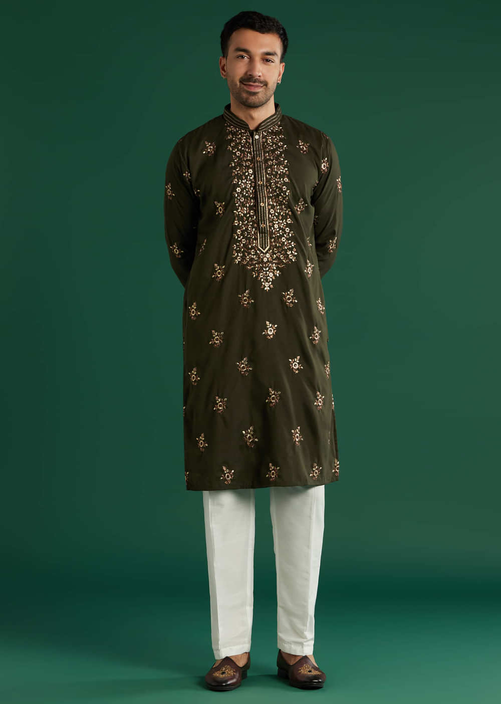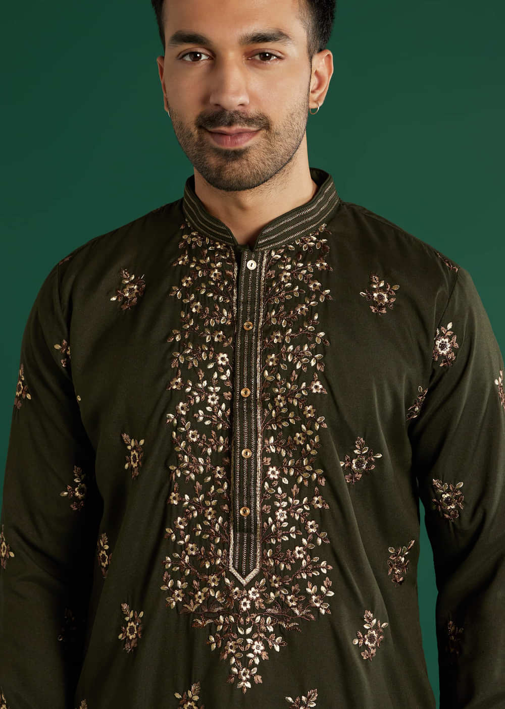 Green Silk Kurta Set For Men With Resham Hand Embroidery