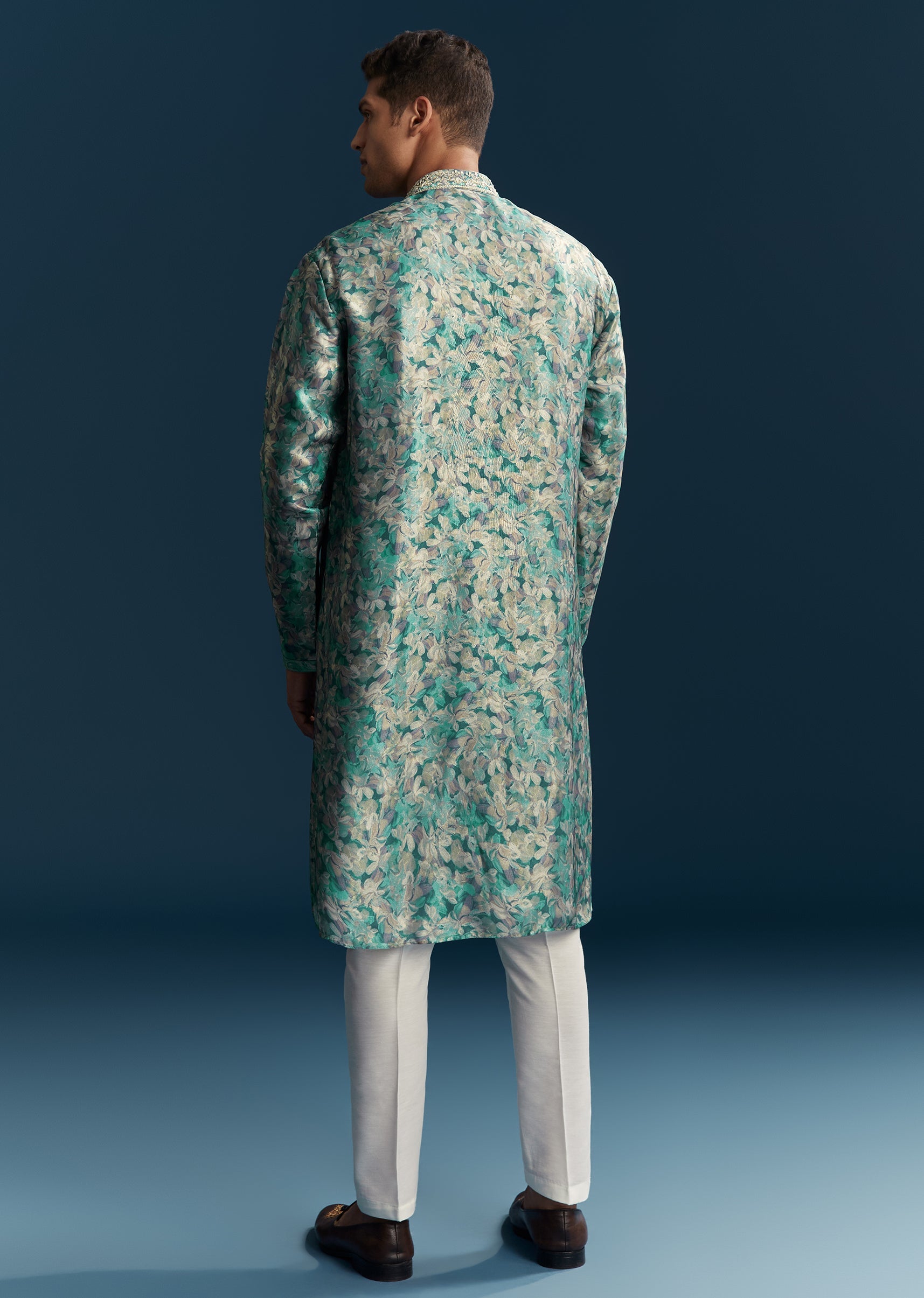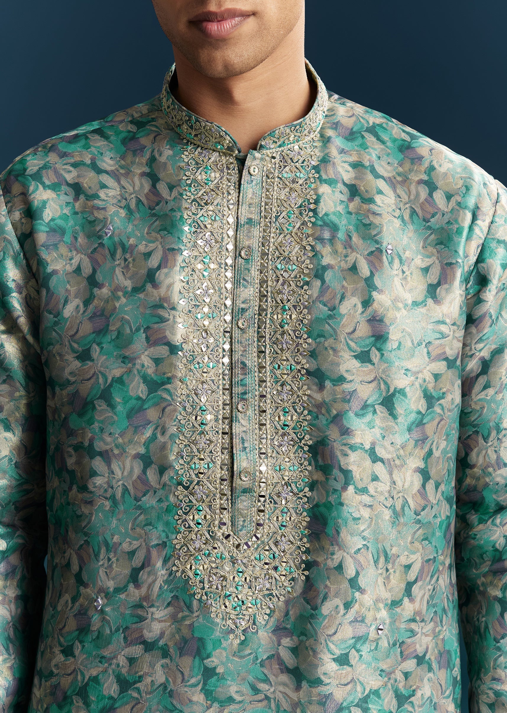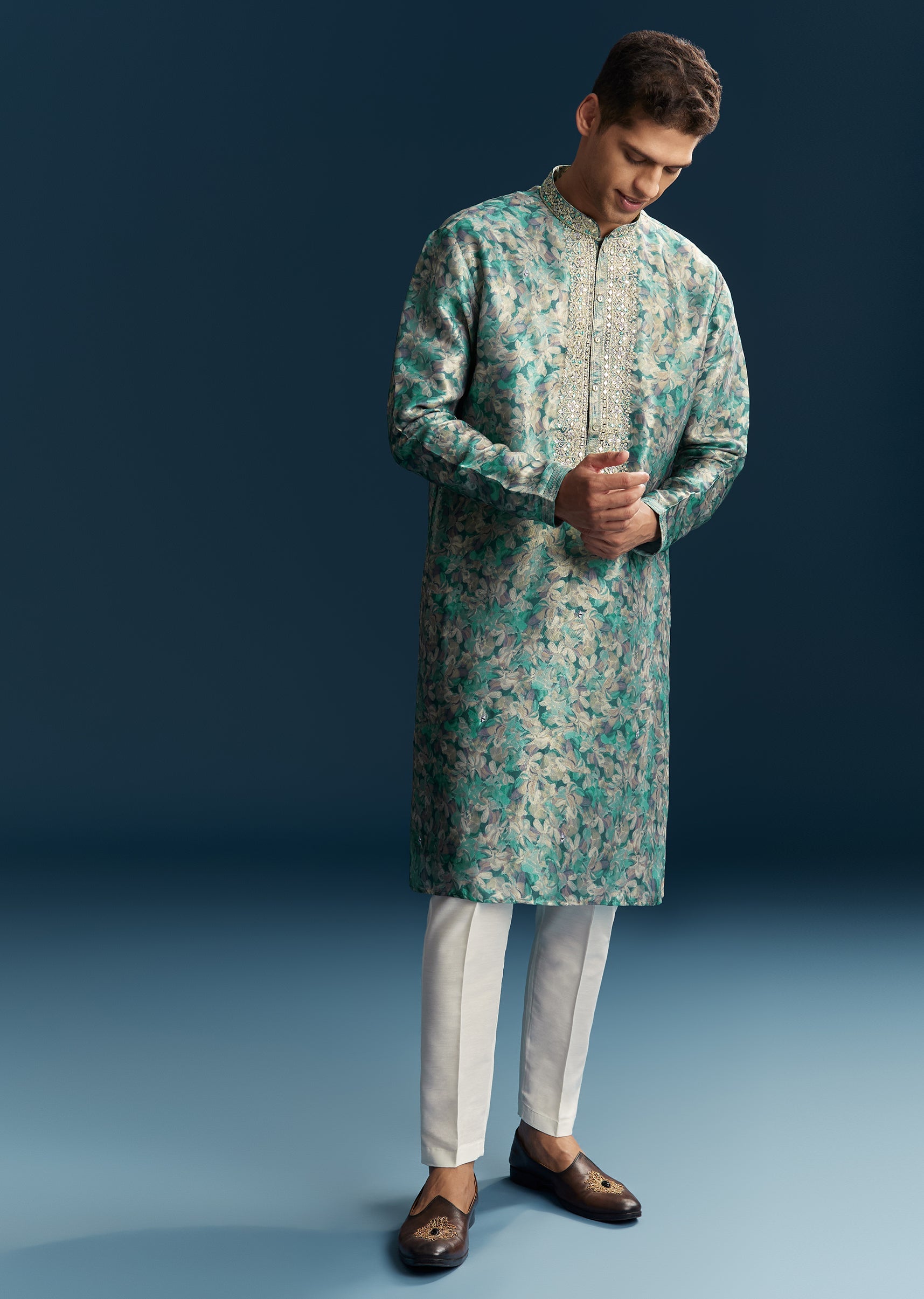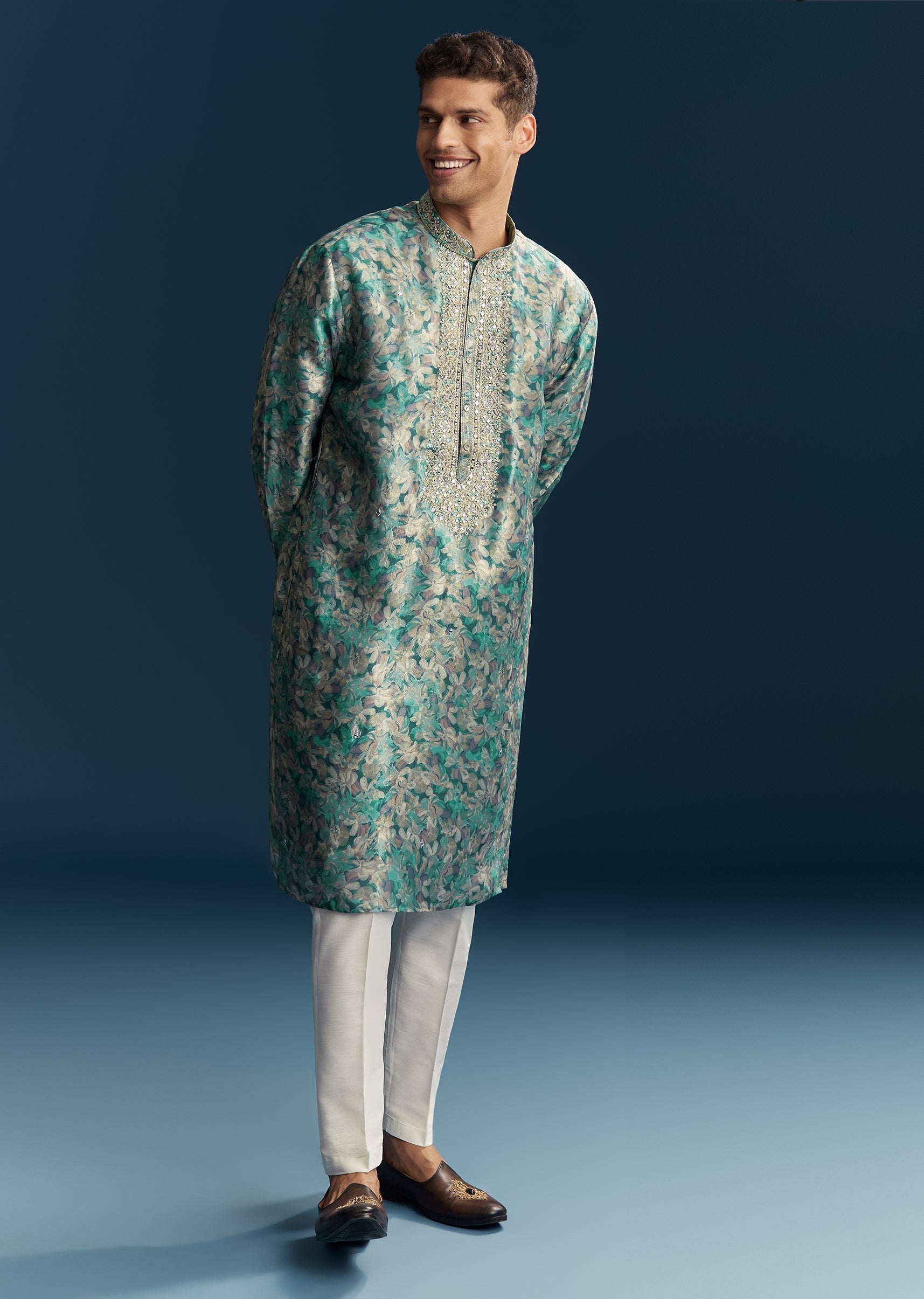 Fresh and festive, this green men’s kurta set in soft pastels is perfect for celebrations and casual festive occasions. Crafted in smooth silk fabric, it features intricate thread work paired... More Product Details