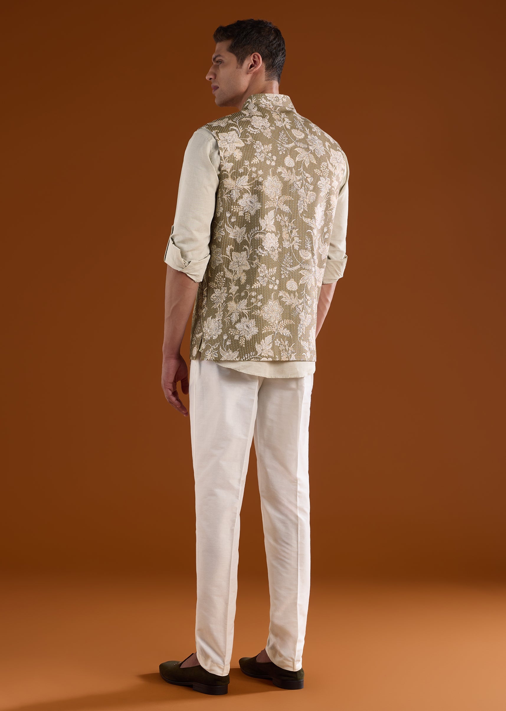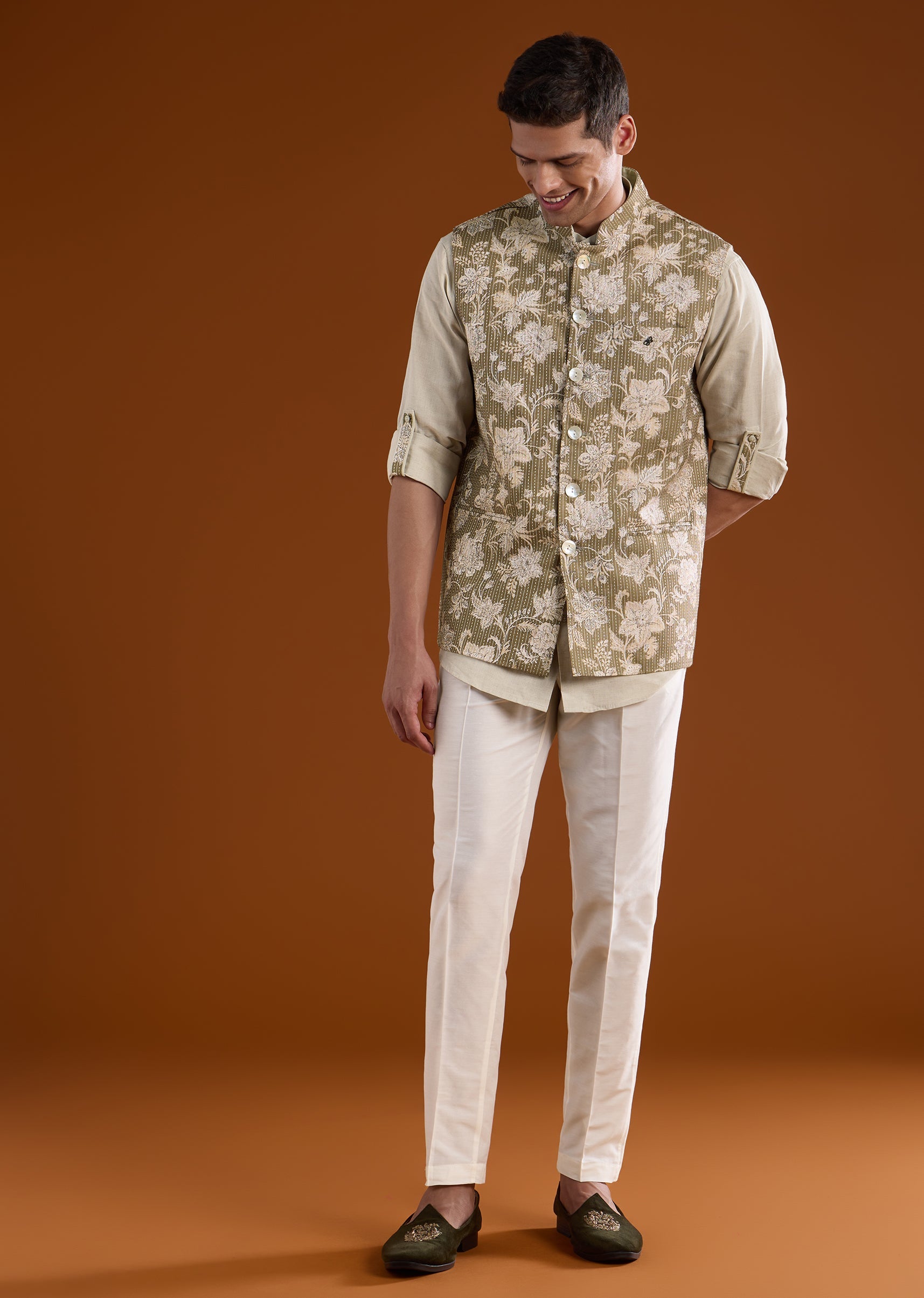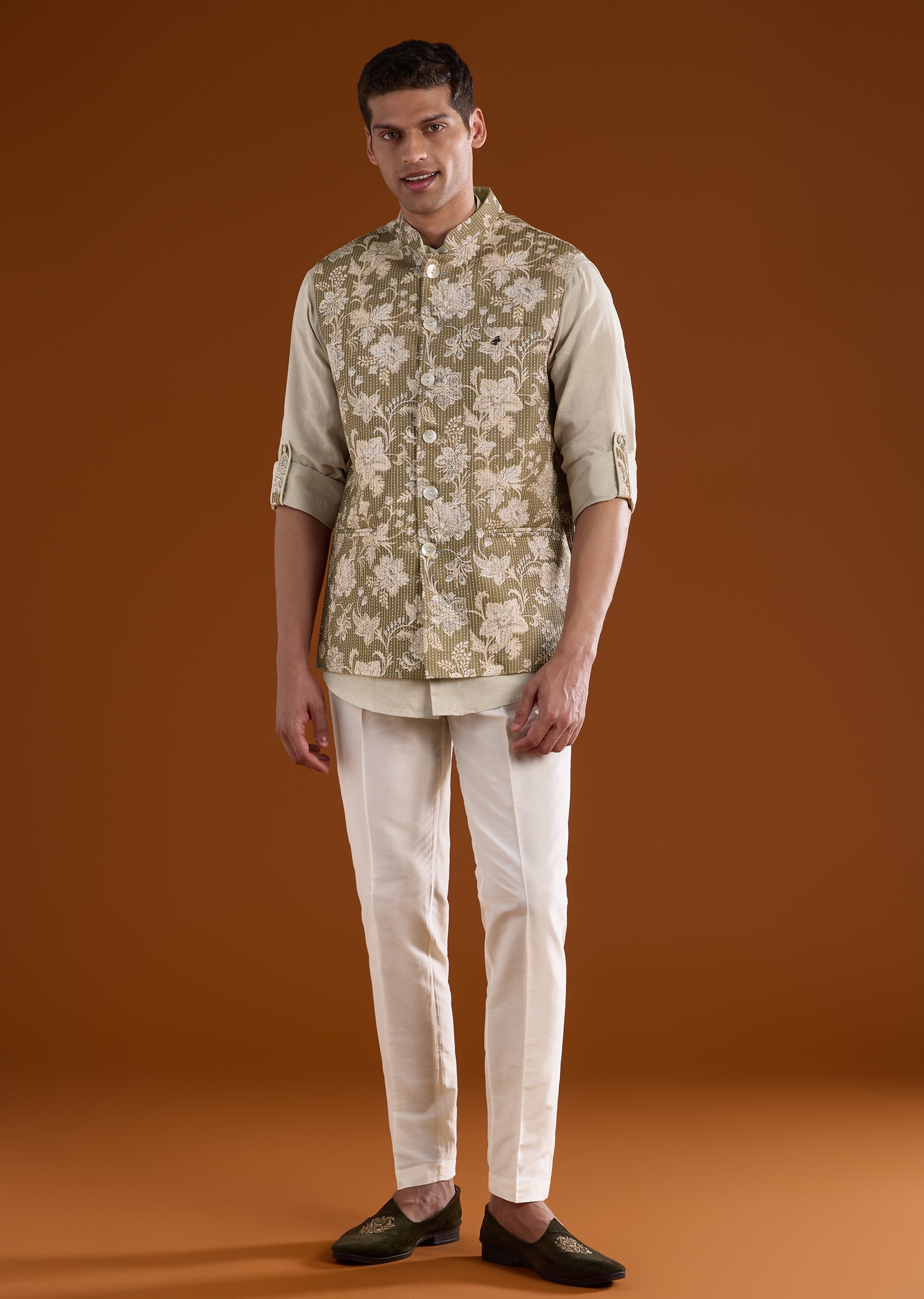 Pair it with ivory or beige trousers and classic mojaris to highlight the green silk and floral accents.