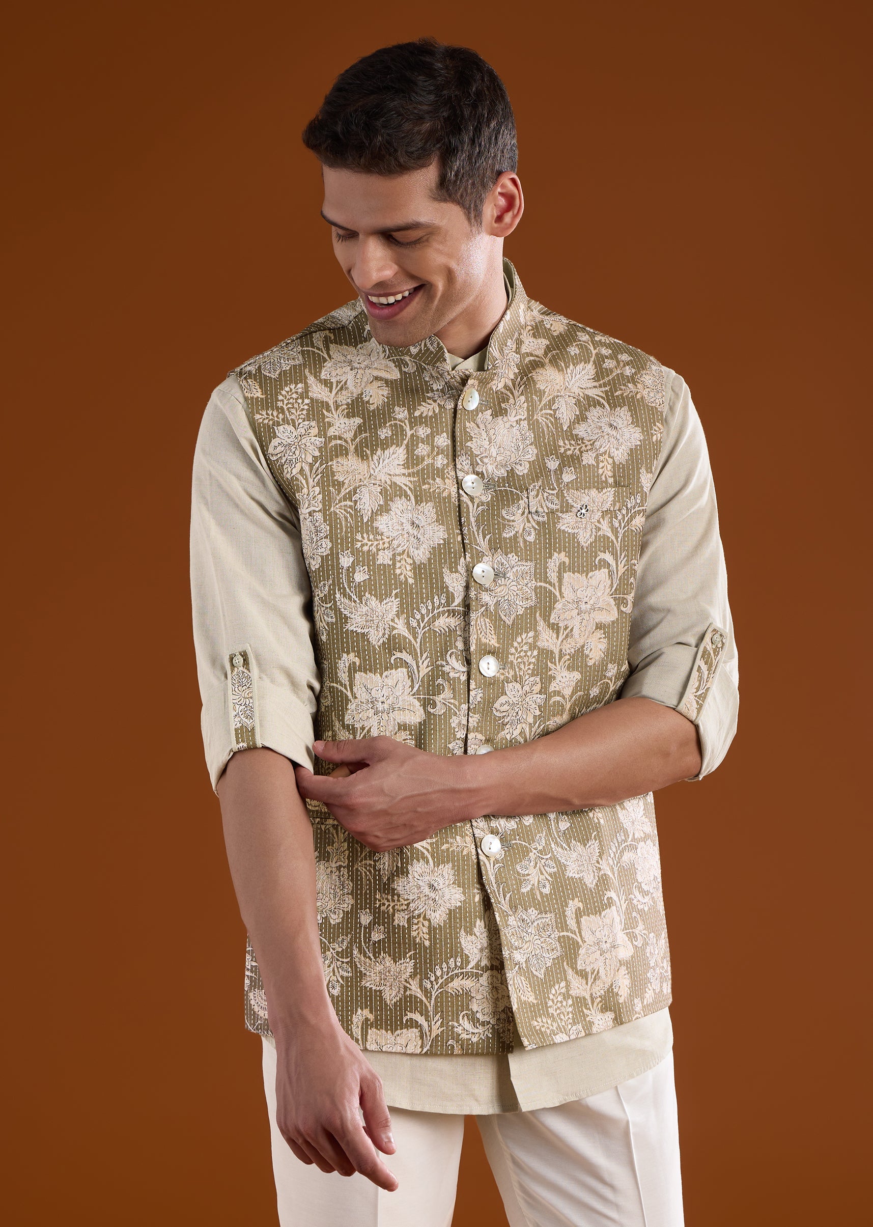 Fit Tips:Ensure the jacket rests neatly on the shoulders with comfortable arm movement, and the kurta drapes smoothly for ease throughout long festive events.
