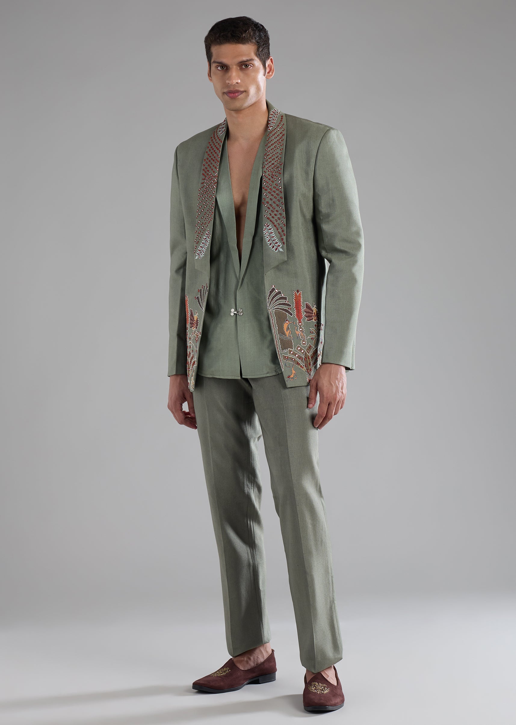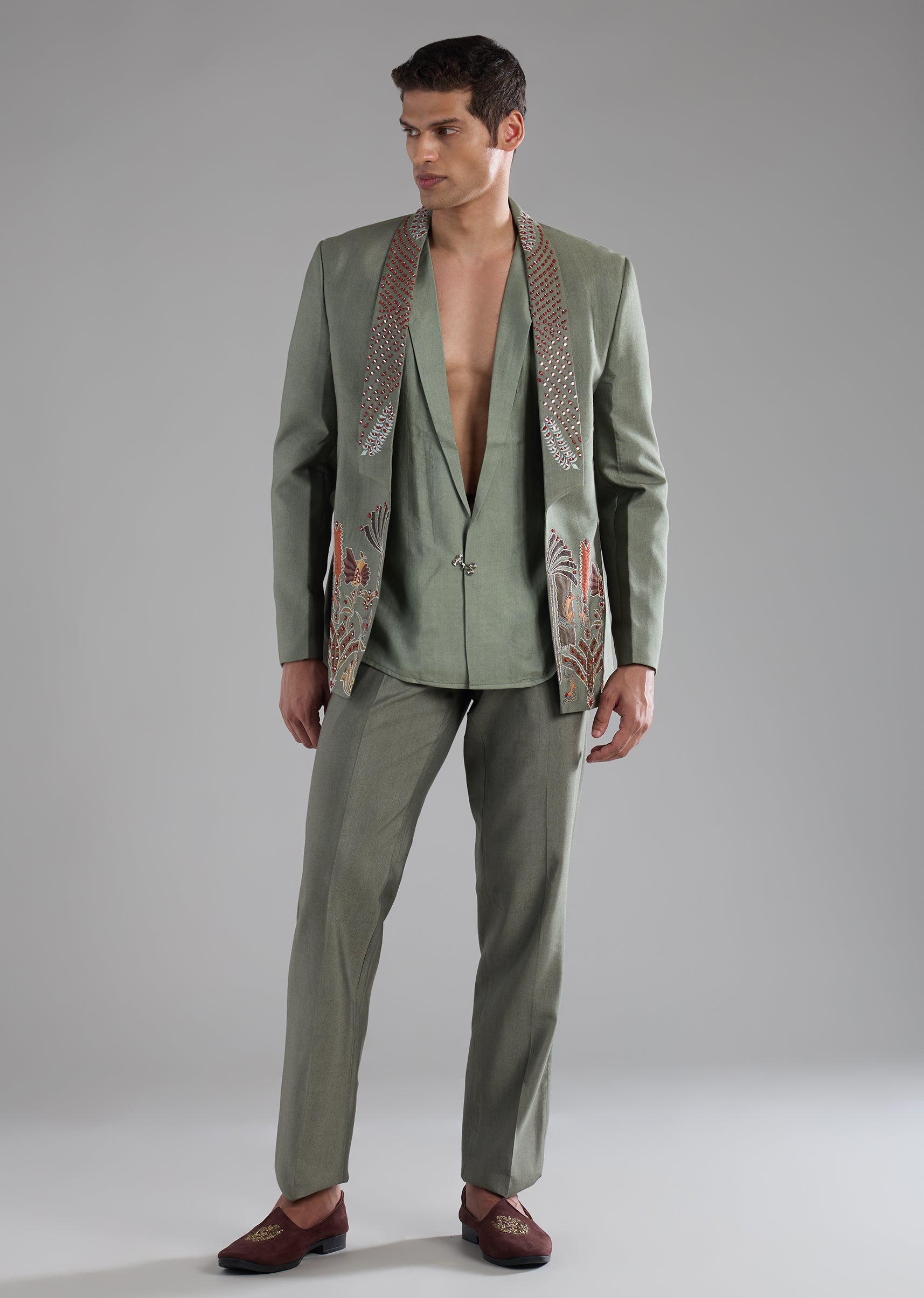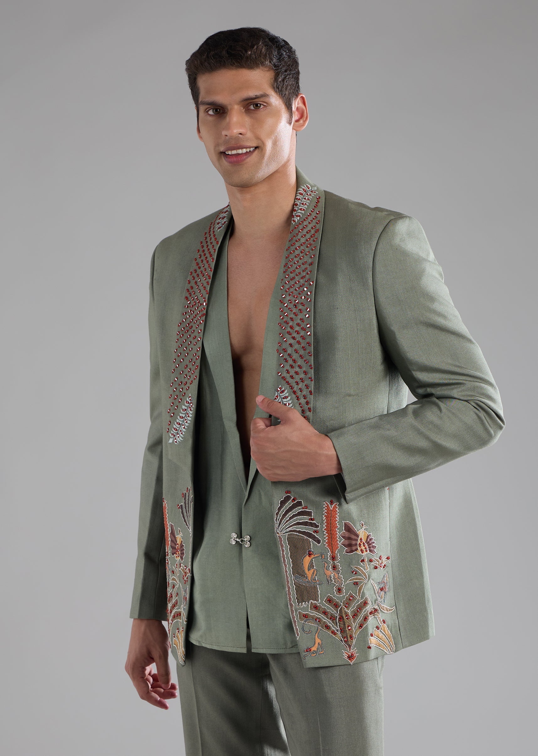 Refined with a modern ethnic edge, this silk and cotton silk tuxedo set is crafted for statement dressing. The ensemble features intricate mirror, resham thread, and patch work that adds texture and artisanal charm to the structured silhouette. Designed with full sleeves and a mandarin collar, it blends the sharp appeal of a tuxedo with traditional detailing. Paired with a tailored shirt and trousers, this set is ideal for festive celebrations, weddings, and contemporary ceremonial occasions.Awarded as the Most Trusted Brand, we're delivering styles you love, just as promised.