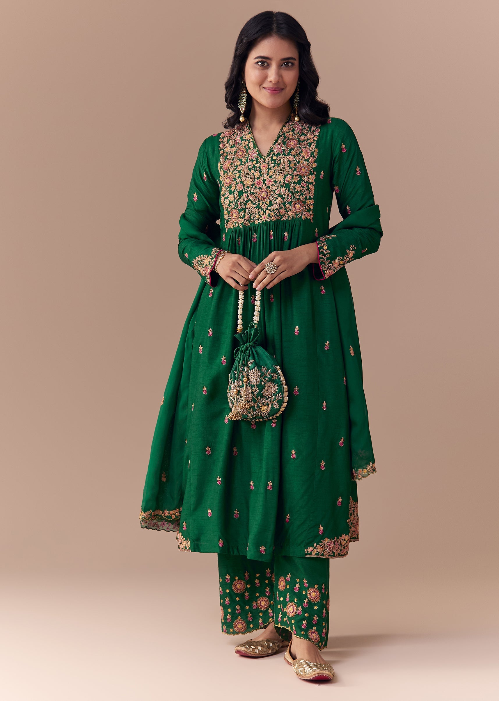 Green Silk Zari Embellished Anarkali Set