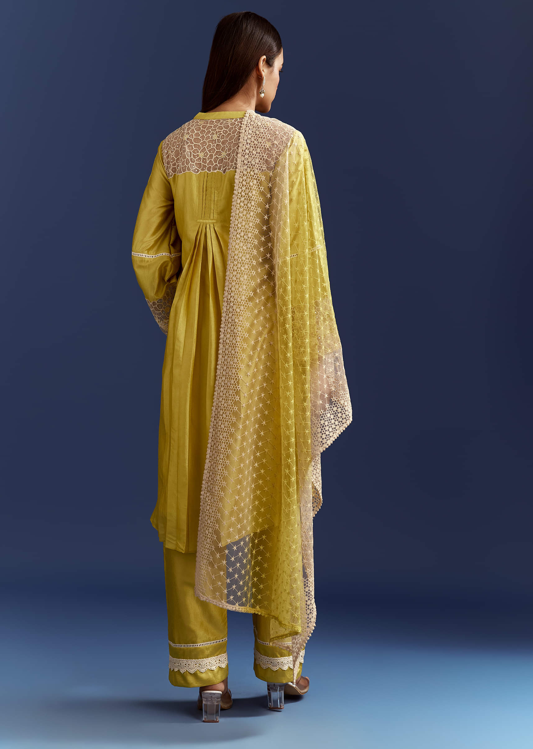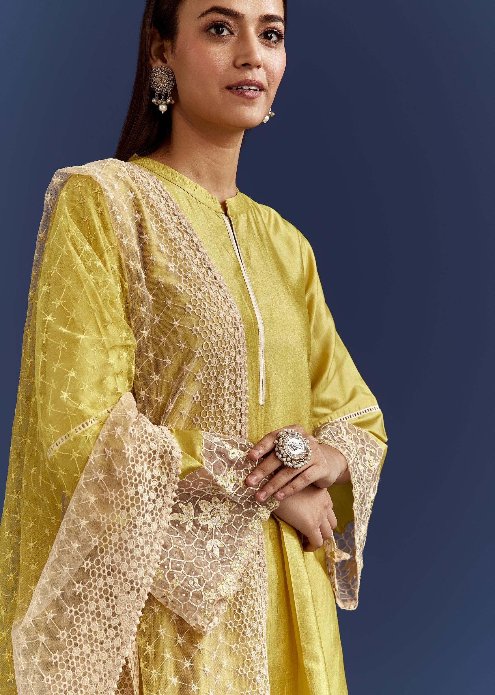 Green Thread And Sequins Work Kurta Set With Net Dupatta In Fuji Silk