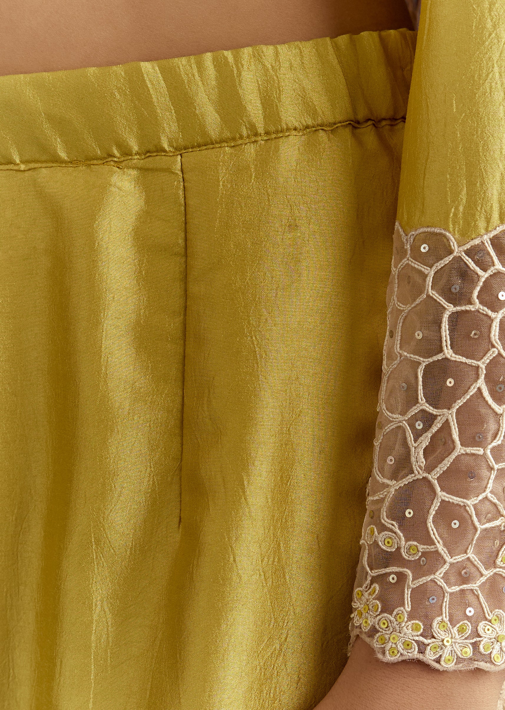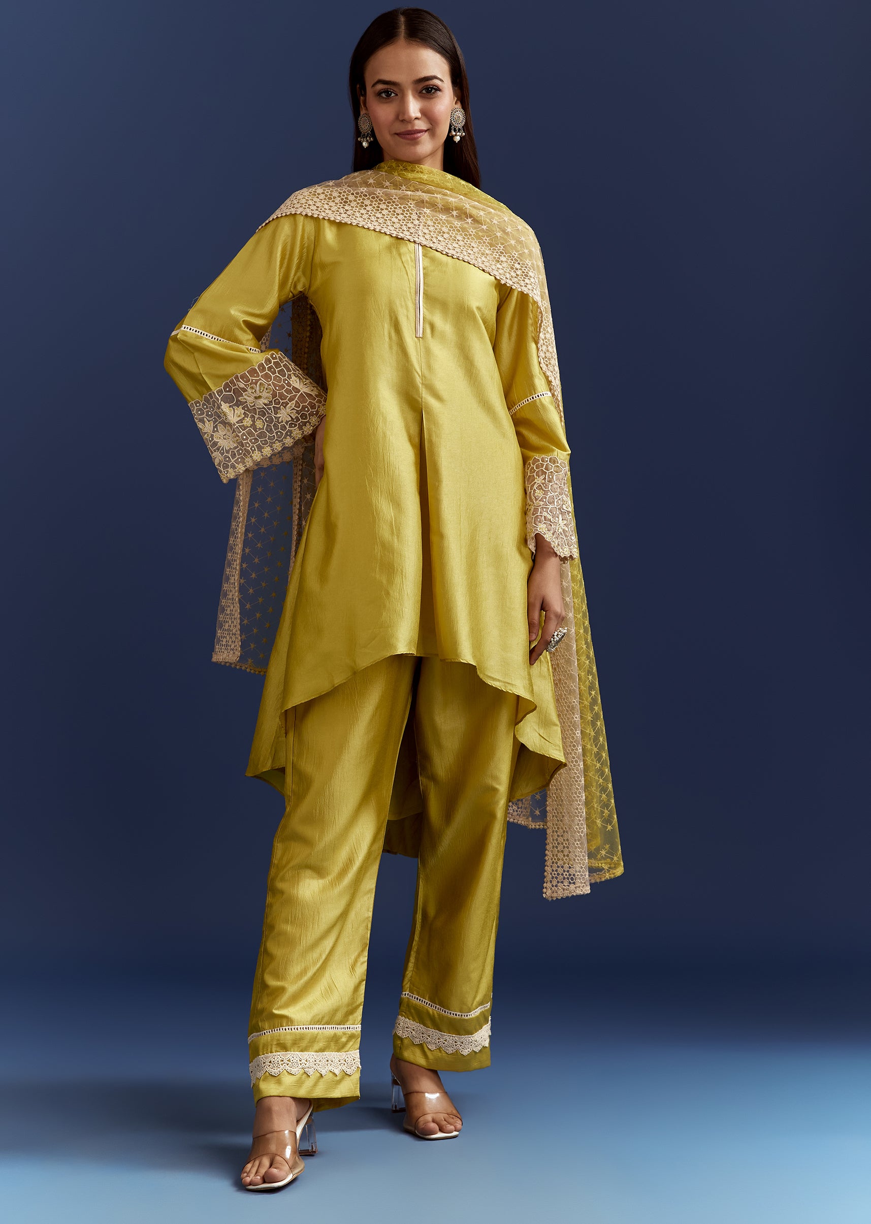 Crafted in green fuji silk, this high low kurta features intricate thread and sequins work on the sleeves and neckline, paired with a two tone thread worked net dupatta. A... More Product Details