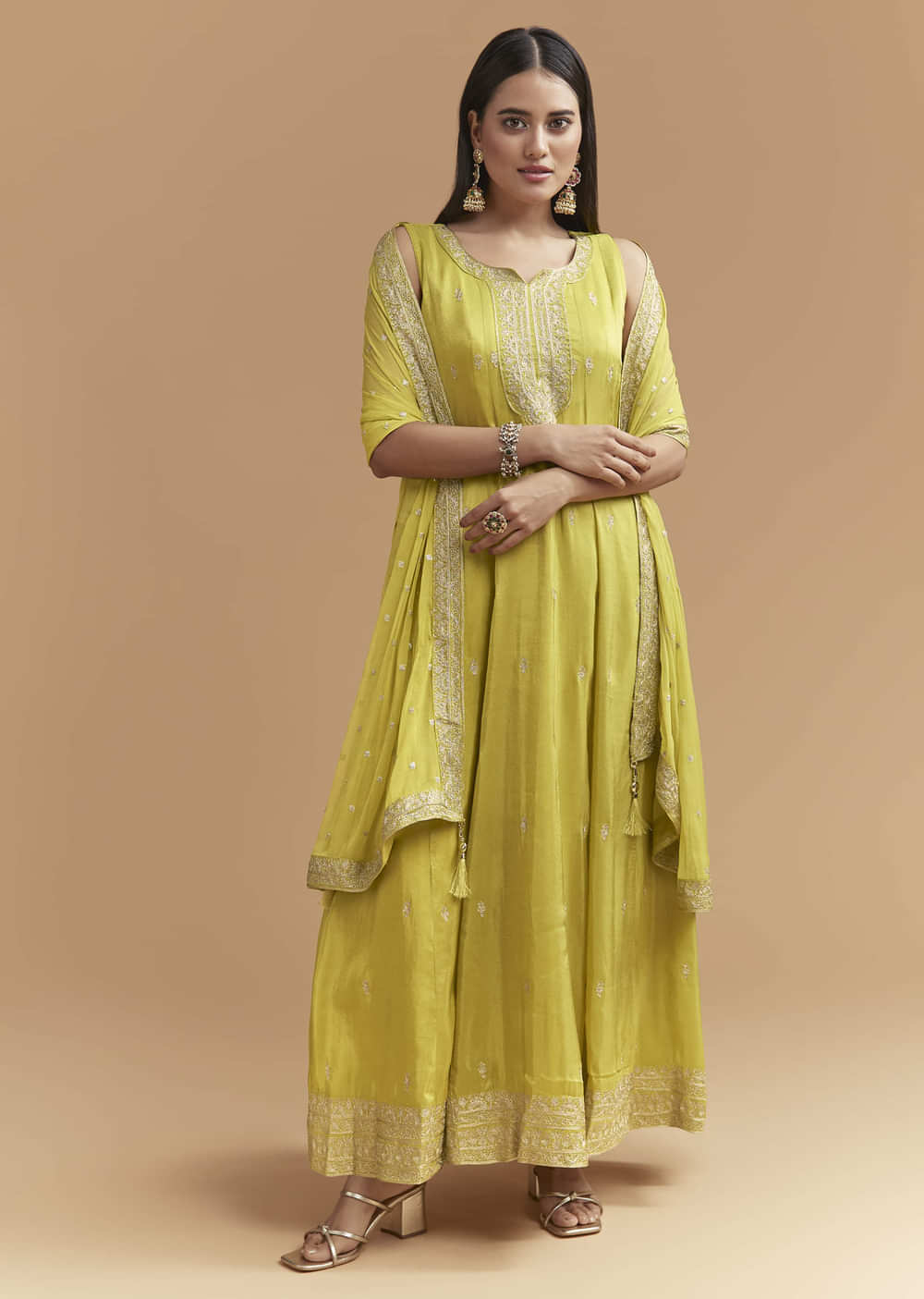 Subtle sheen with heritage detail defines this green tissue anarkali suit, giving presence without heaviness. Intricate zari draws fine contours that look refined at close range and under lights. You... More Product Details