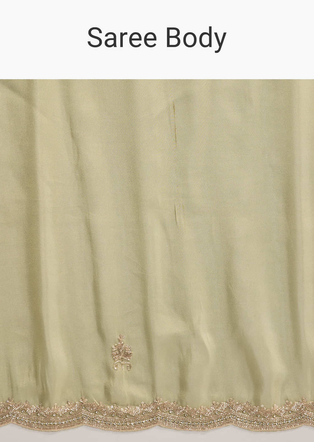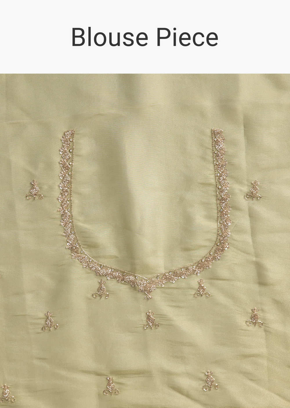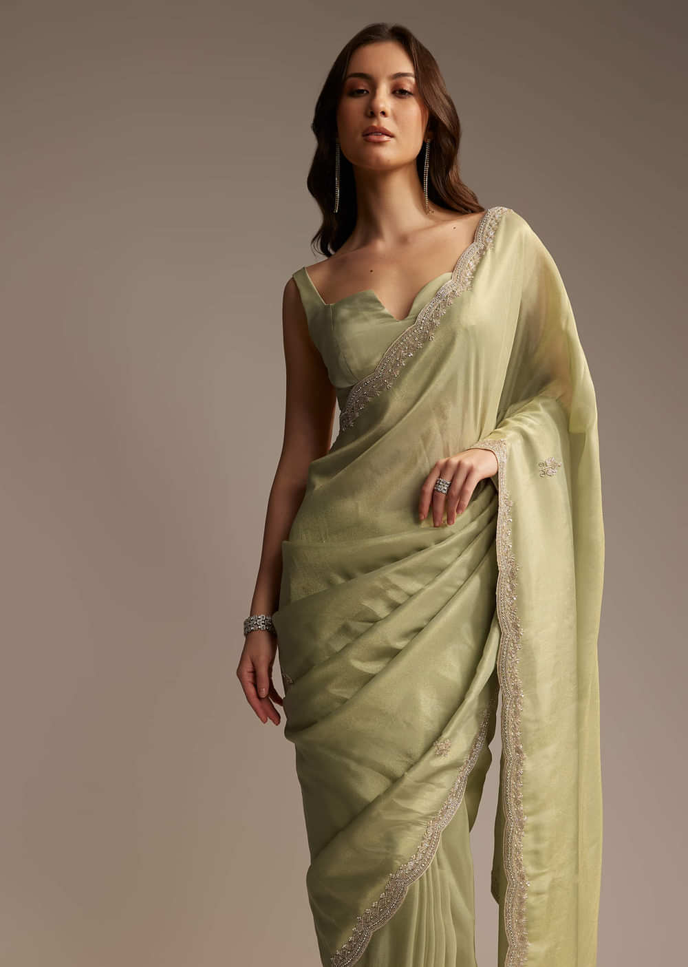 This green tissue saree is built for moments that call for something crisp, striking, and unmistakably festive. Lightly sheer with a structured finish, it features small embroidered buttis placed with intention, not clutter. The scalloped border is sharply defined with handwork in cutdana, sequins, and beads, adding texture without weight. A matching blouse fabric is included to complete the set, or to customize your way.