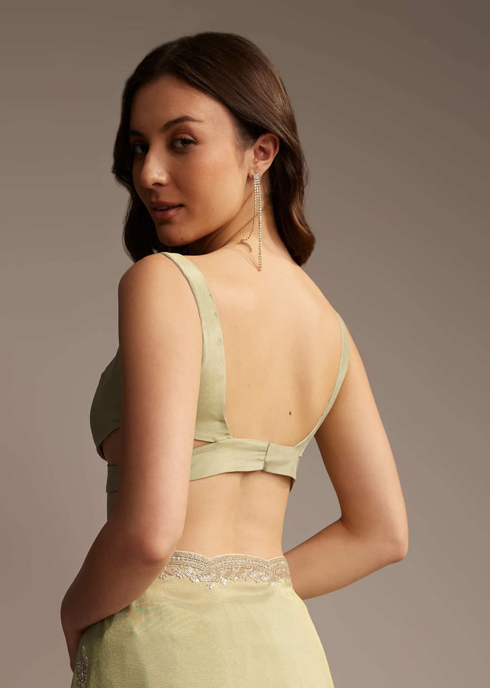 Pair it with kundan or pearl jewellery and a low bun or soft waves. Keep accessories minimal. The idea is to let the shimmer speak.