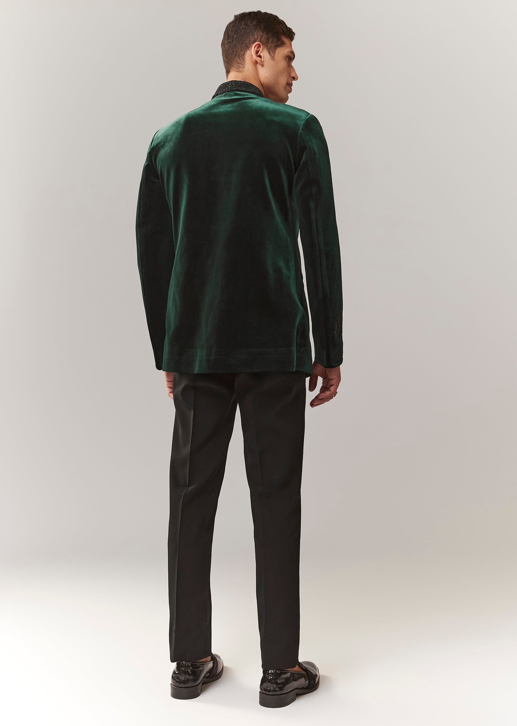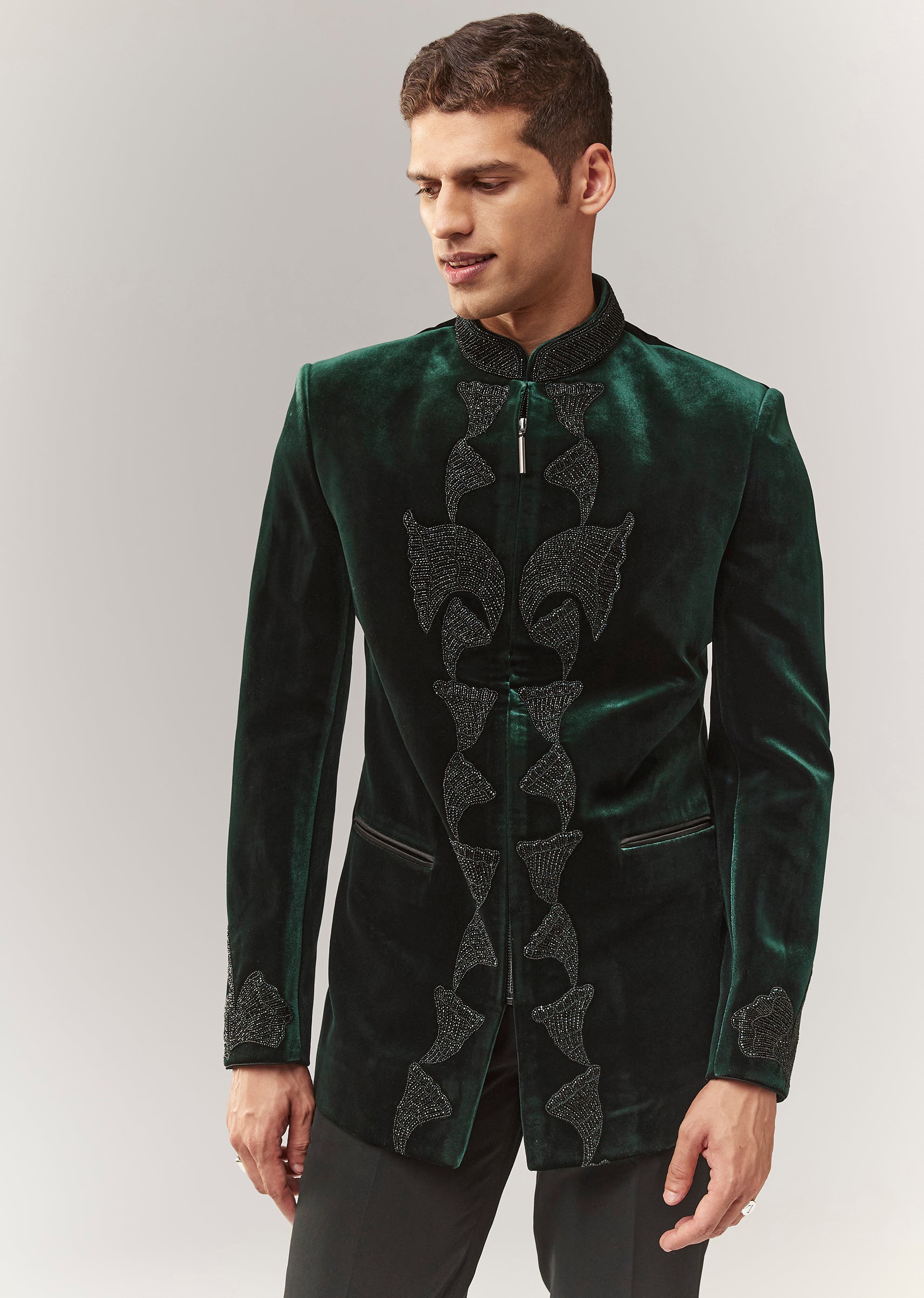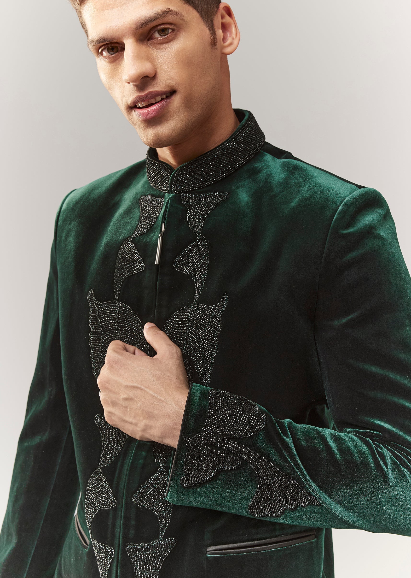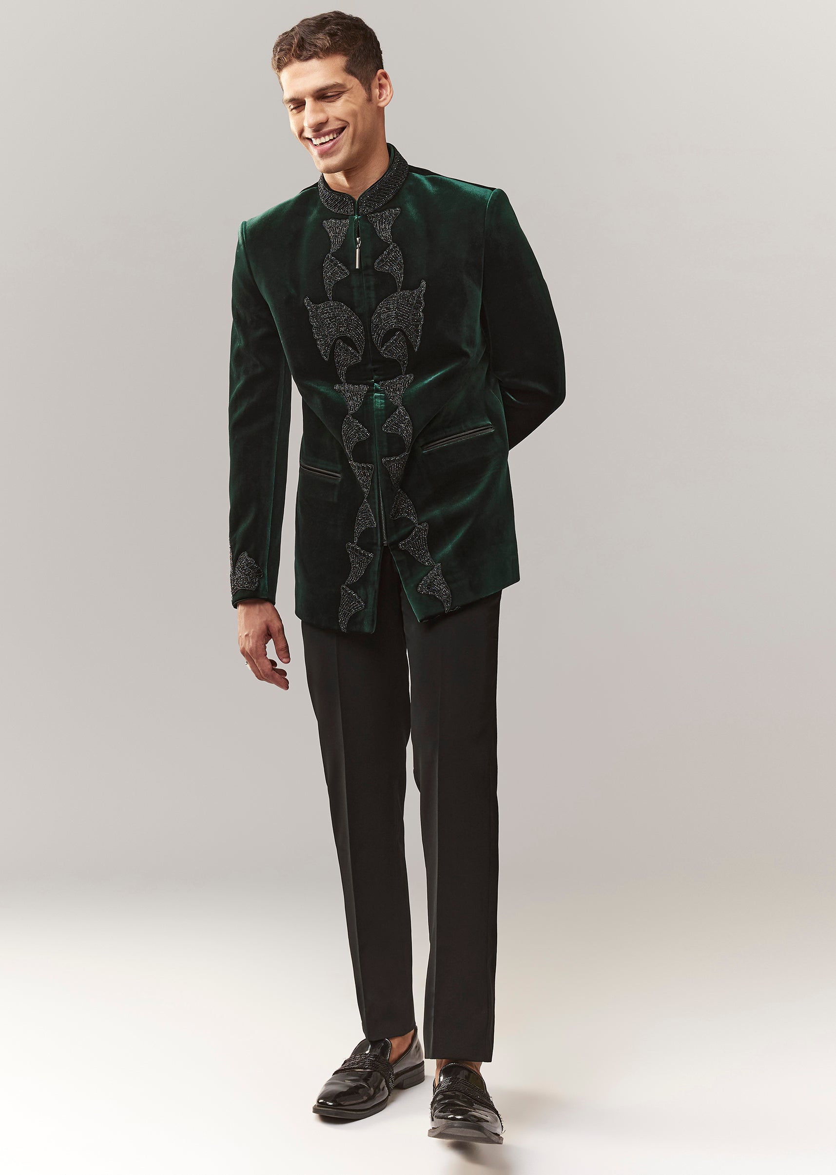 A minimal yet festive green velvet jodhpuri set featuring cutdana embellishment. Mandarin collar, full sleeves, with front zip and hook-eye closure. Paired with straight pants (mid-waist). Great for sangeet and... More Product Details