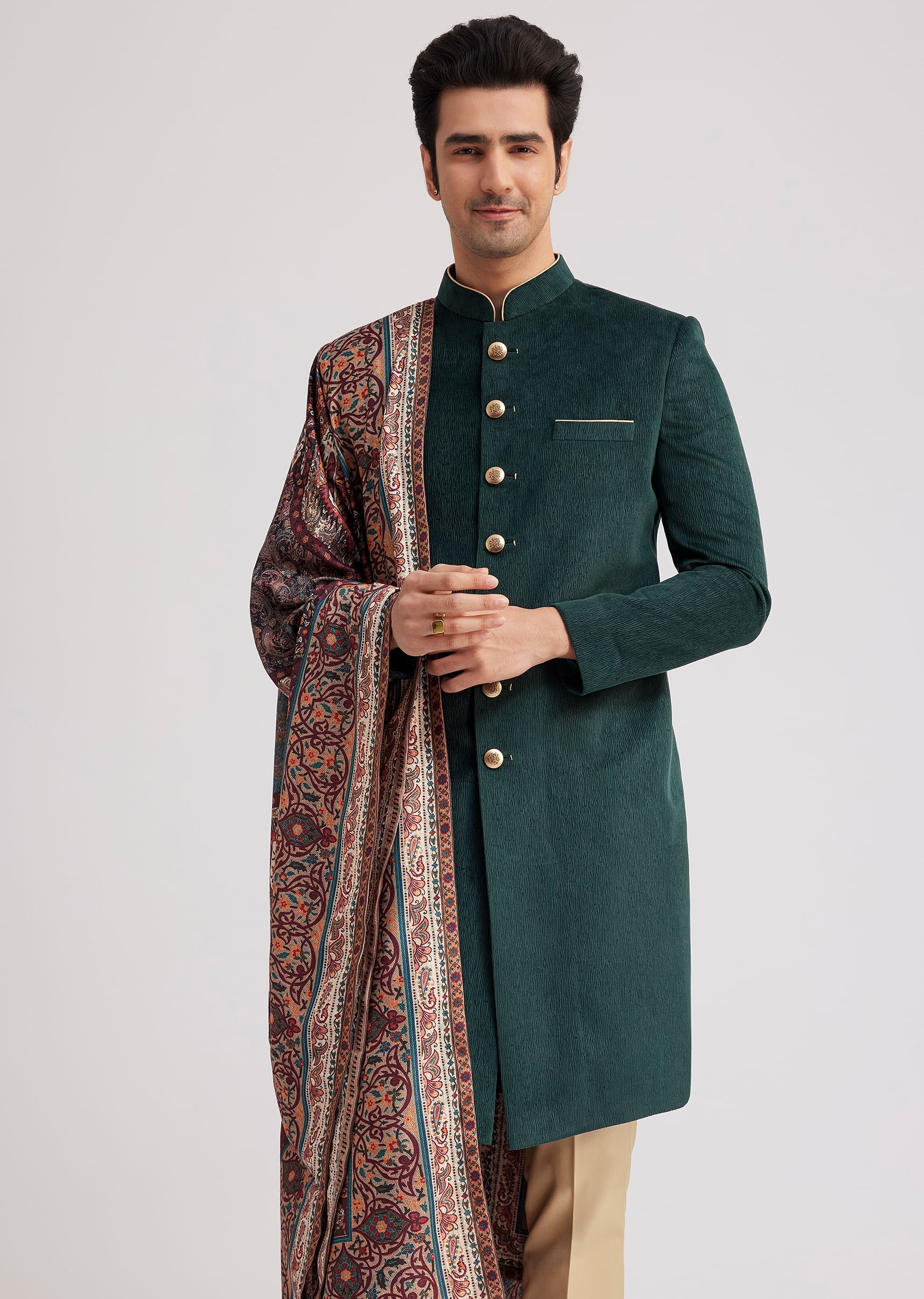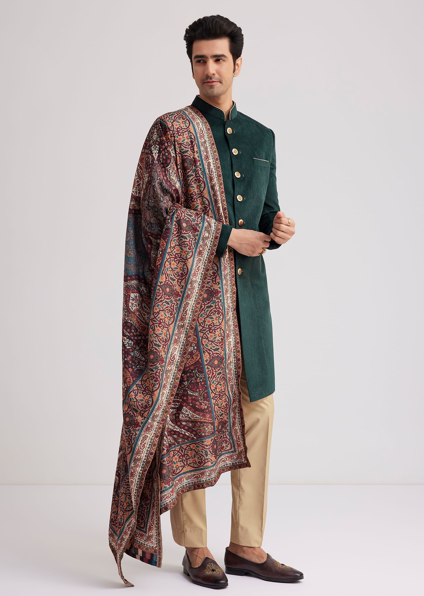 Step Into Refined Elegance With This Green Velvet Nawabi Set Enriched With A Traditional Printed Pashmina Dupatta. The Deep Green Hue Radiates Regal Charm While The Intricate Print On The Dupatta Adds A Heritageinspired Allure. Goldtoned Buttons Accentuate The Tailored Silhouette Blending Classic Sophistication With Contemporary Finesse. A Distinguished Ensemble For Weddings And Festive Soirées.Awarded As The Most Trusted Brand We'Re Delivering Styles You Love Just As Promised.