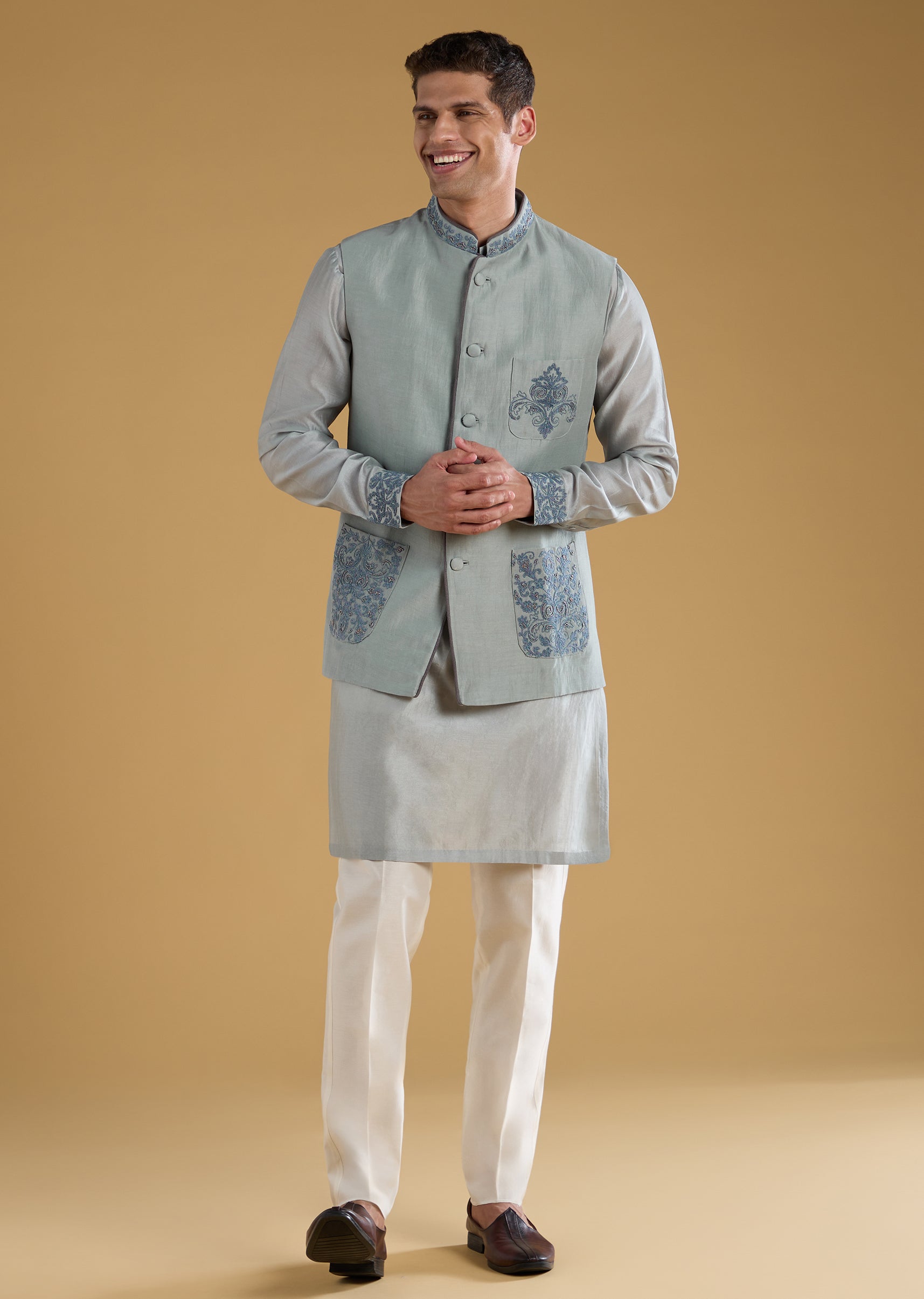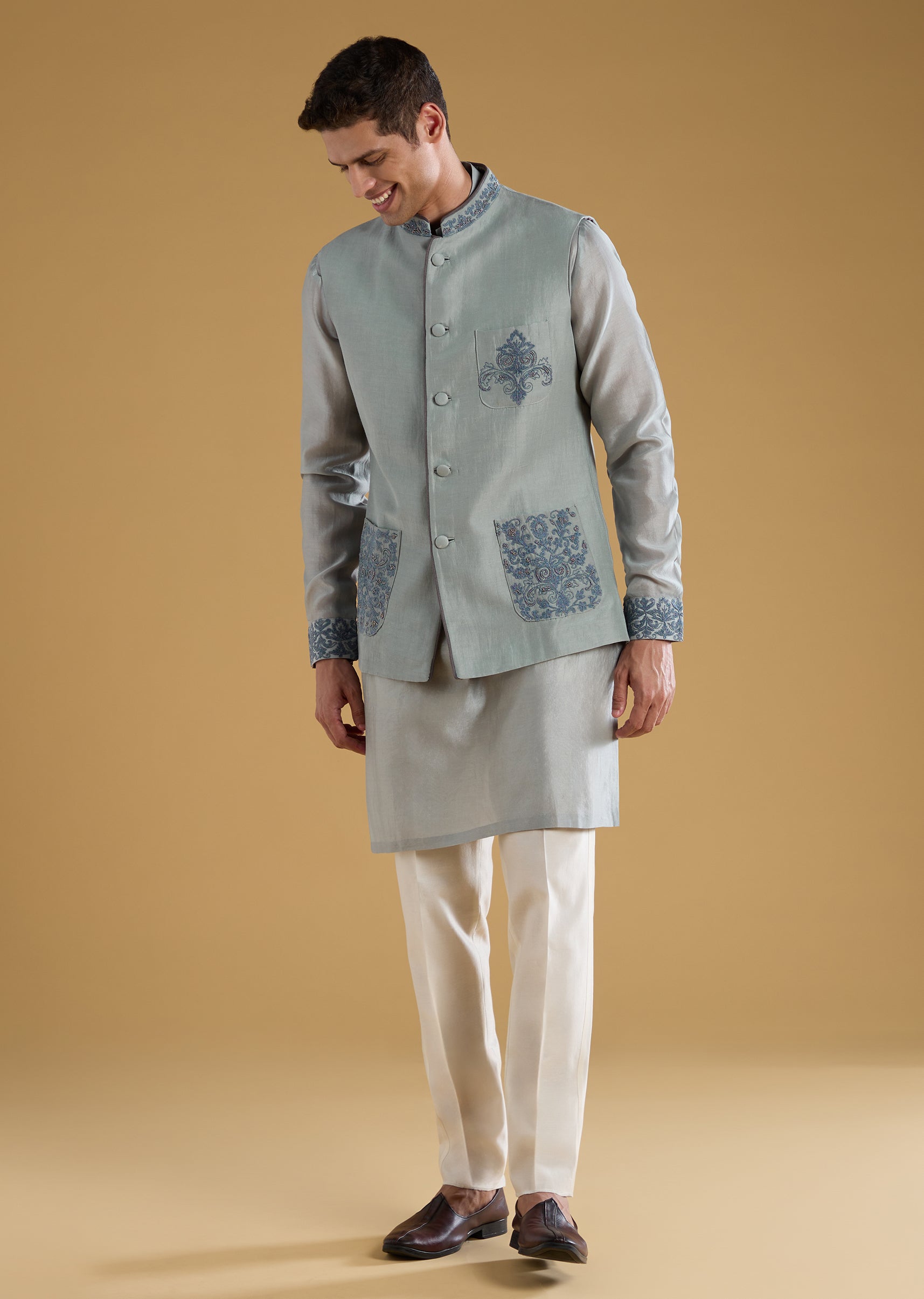 Artisanal charm takes center stage in this Chanderi and silk ensemble, enriched with dori, bead, and resham work that adds texture and refined detailing. The full-sleeve mandarin-collar kurta paired with a structured jacket creates a sophisticated layered look ideal for festive evenings and intimate celebrations. Thoughtful front button and hook eye closures lend a tailored finish while keeping the outfit effortlessly wearable. A versatile trio that balances tradition with contemporary flair. Awarded as the Most Trusted Brand, we're delivering styles you love, just as promised.
