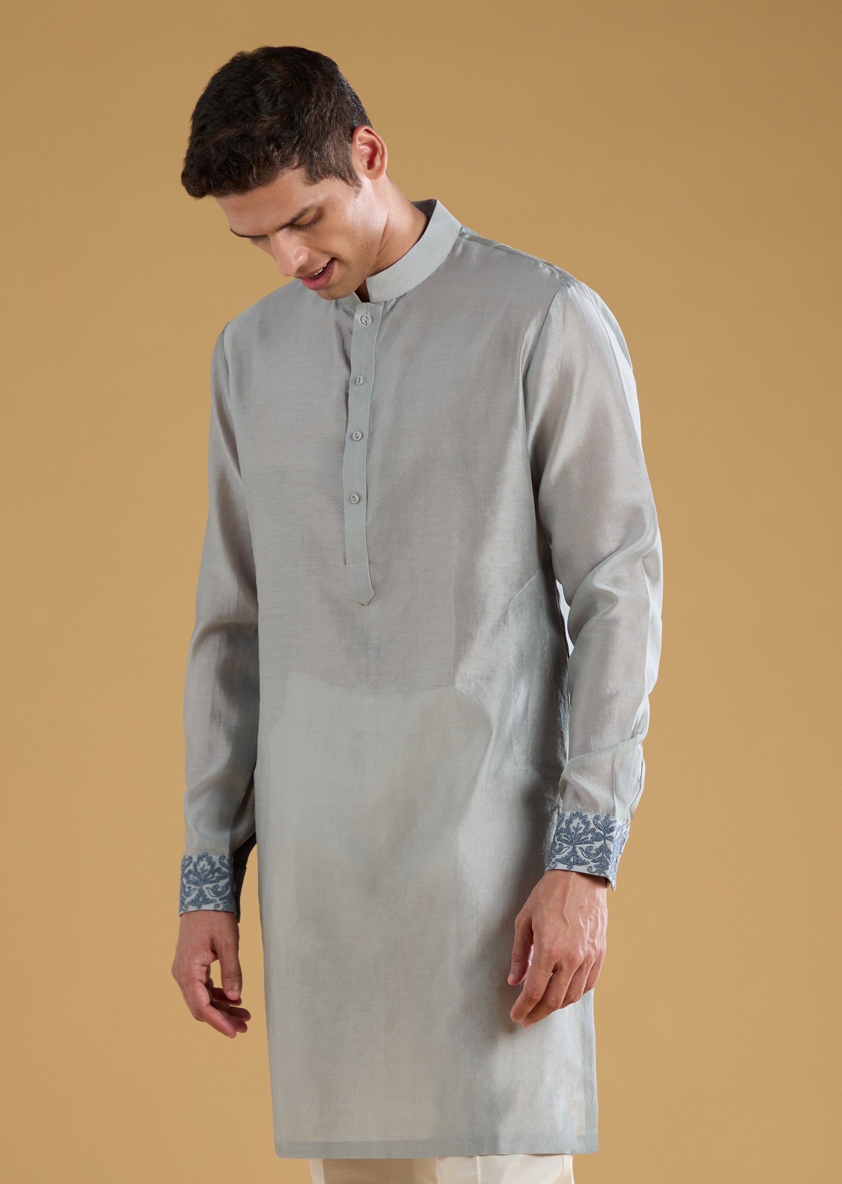 Artisanal charm takes center stage in this Chanderi and silk ensemble, enriched with dori, bead, and resham work that adds texture and refined detailing. The full-sleeve mandarin-collar kurta paired with... More Product Details
