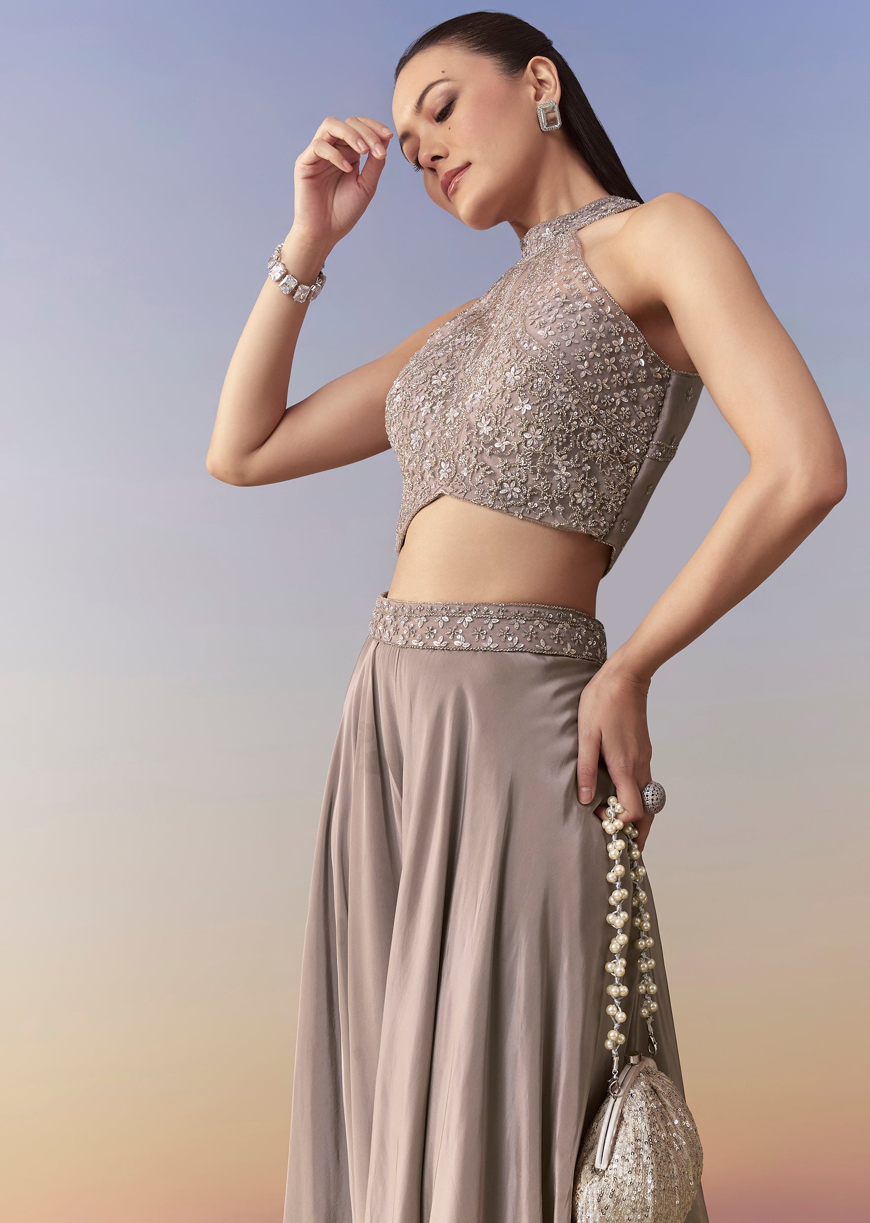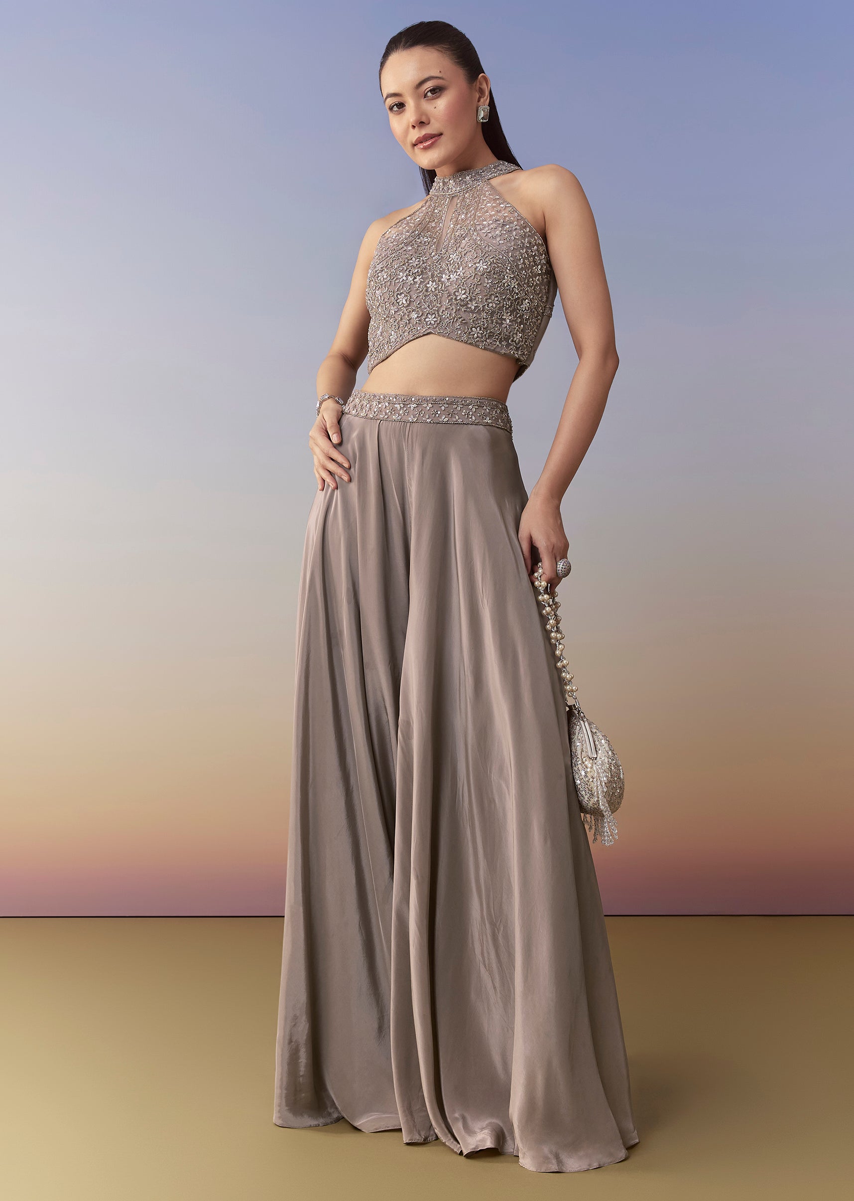 Grey Crepe Sequin Embellished Crop Top Palazzo Set