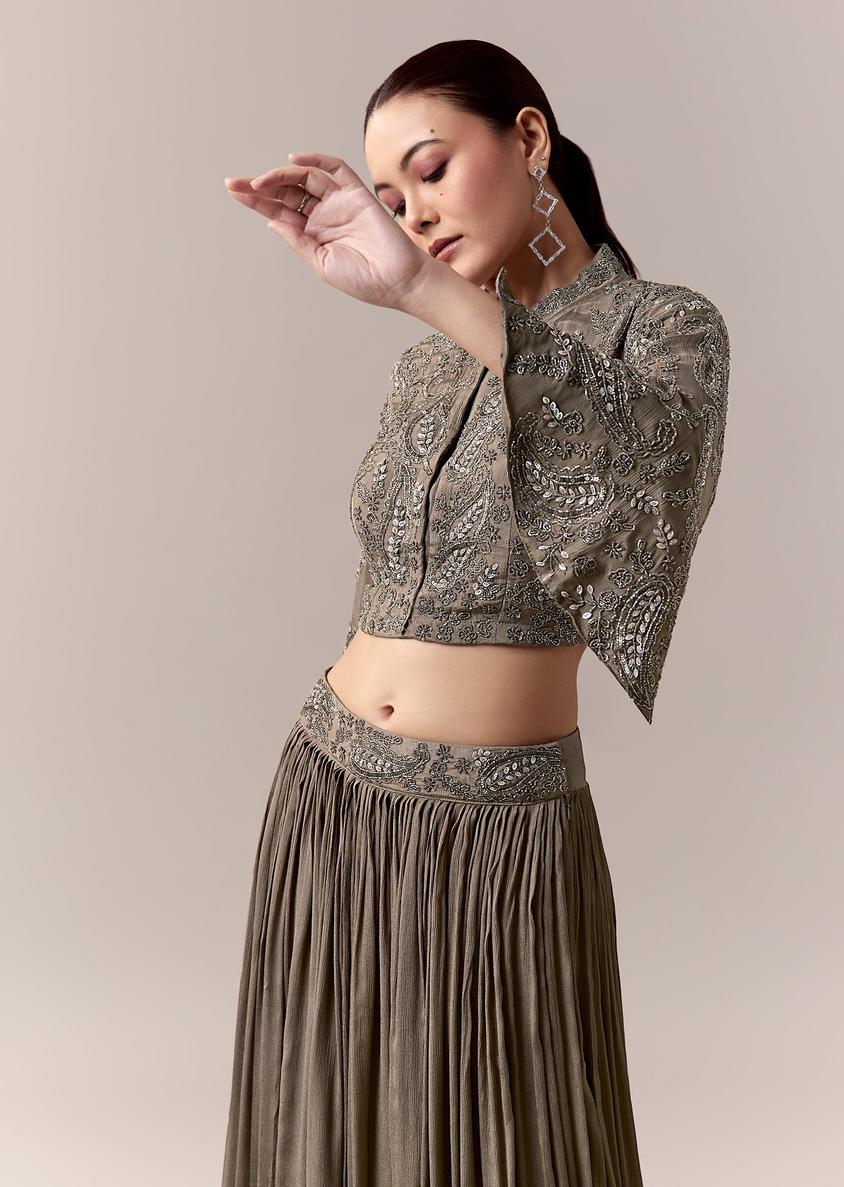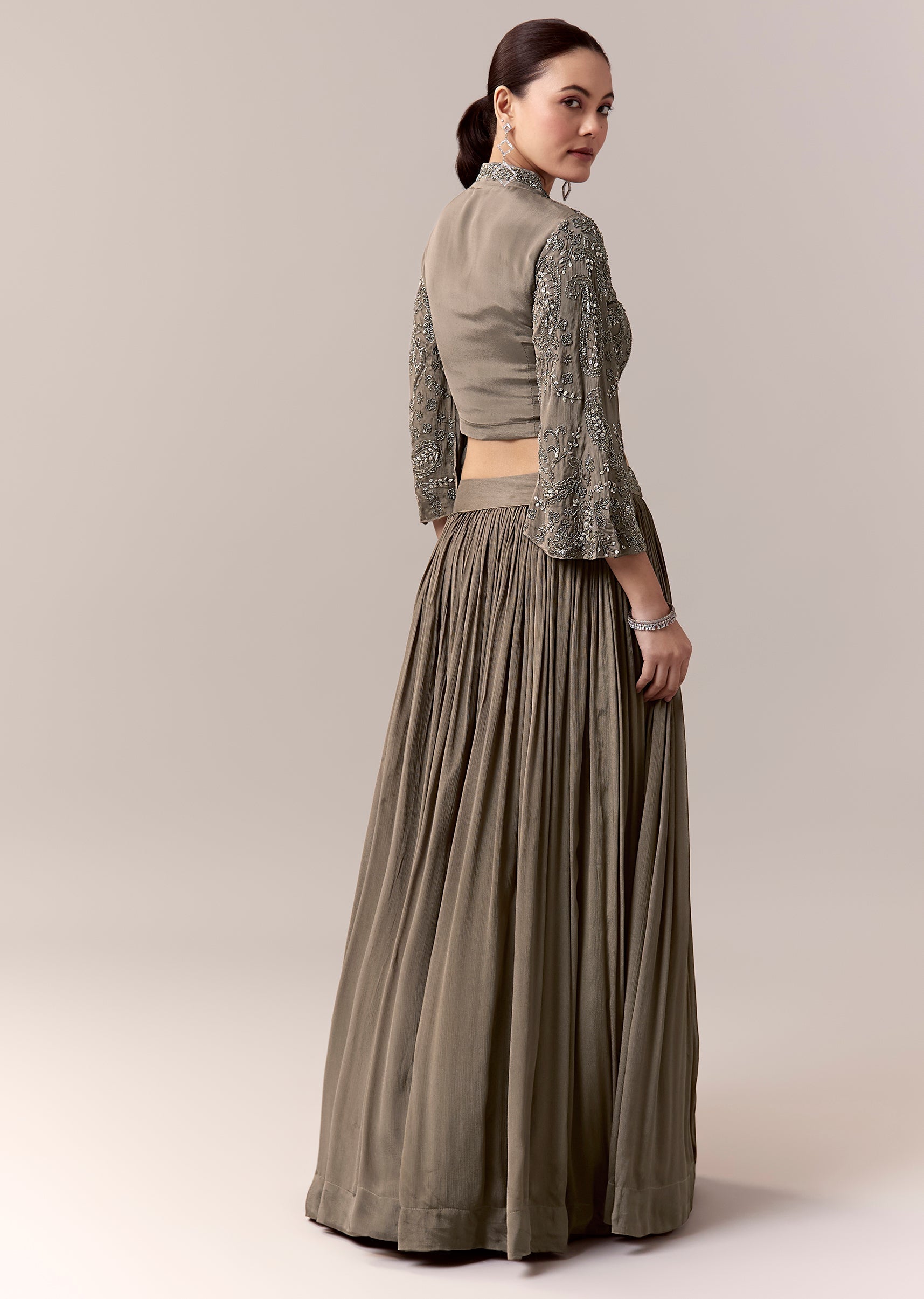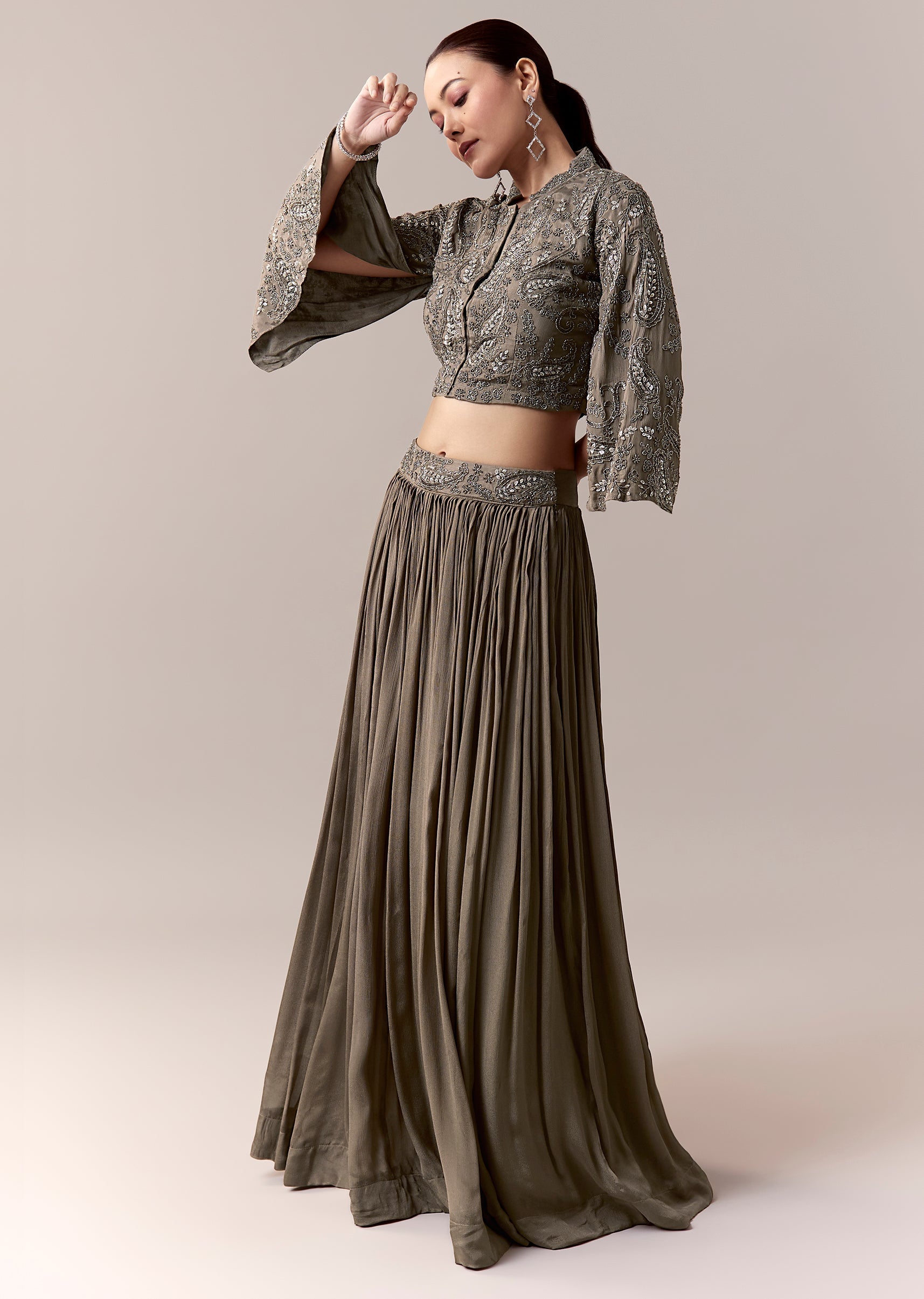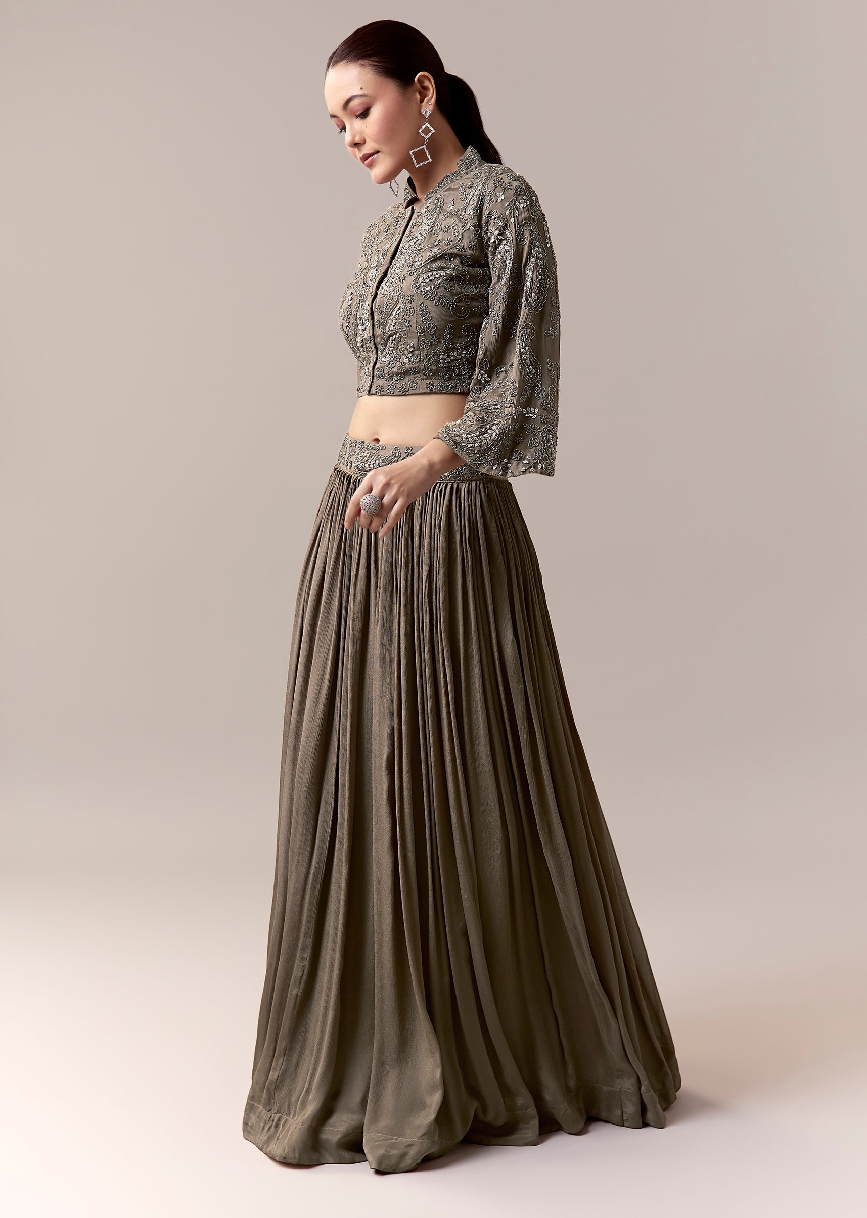 Grey Crop Top Skirt Indo Western With Cut Dana Sequins Work