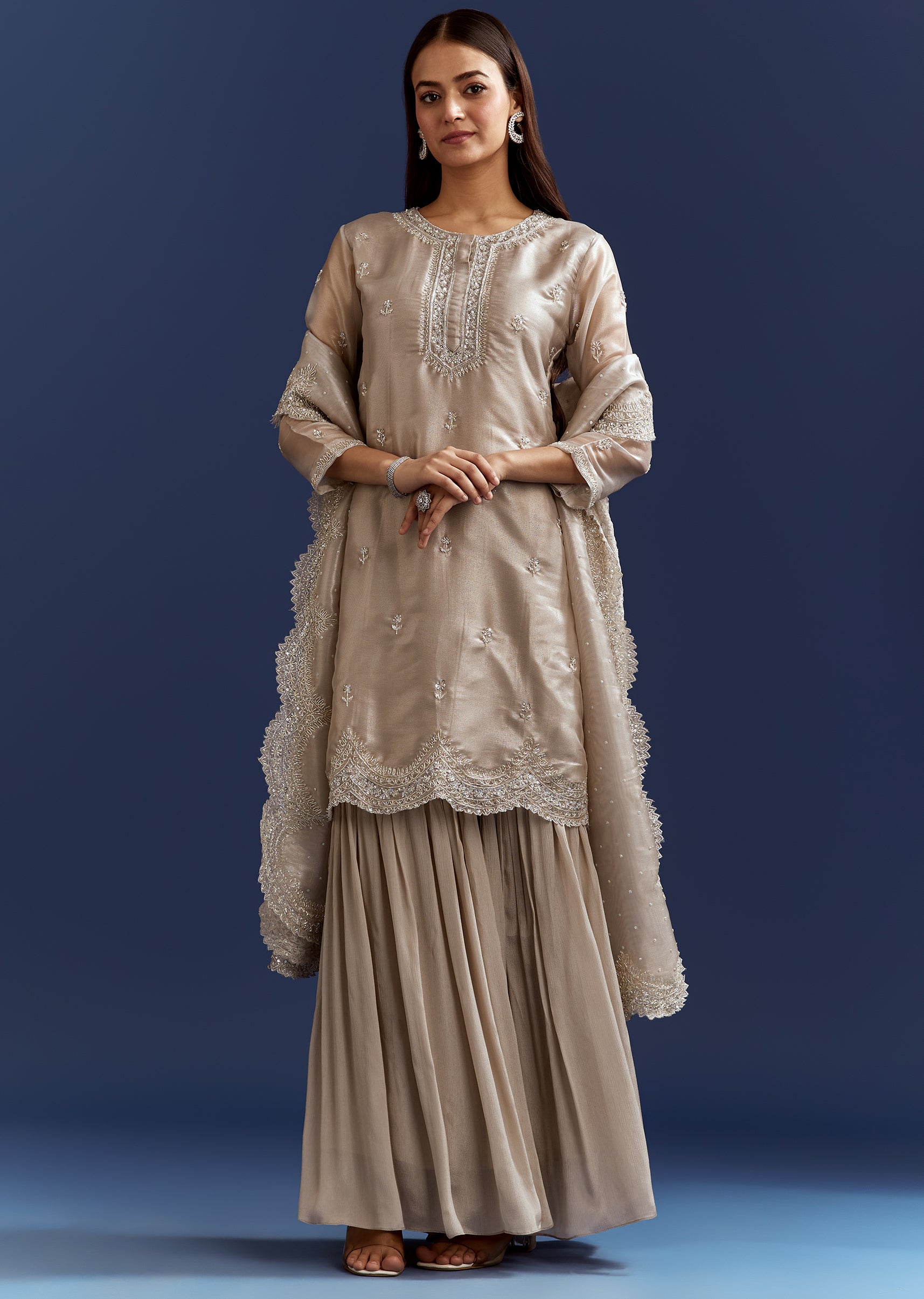 This grey tissue kurta is adorned with cut dana and sequins embroidery, styled with a matching stone worked dupatta and a coordinating sharara. A graceful look for mehendi or sangeet.... More Product Details